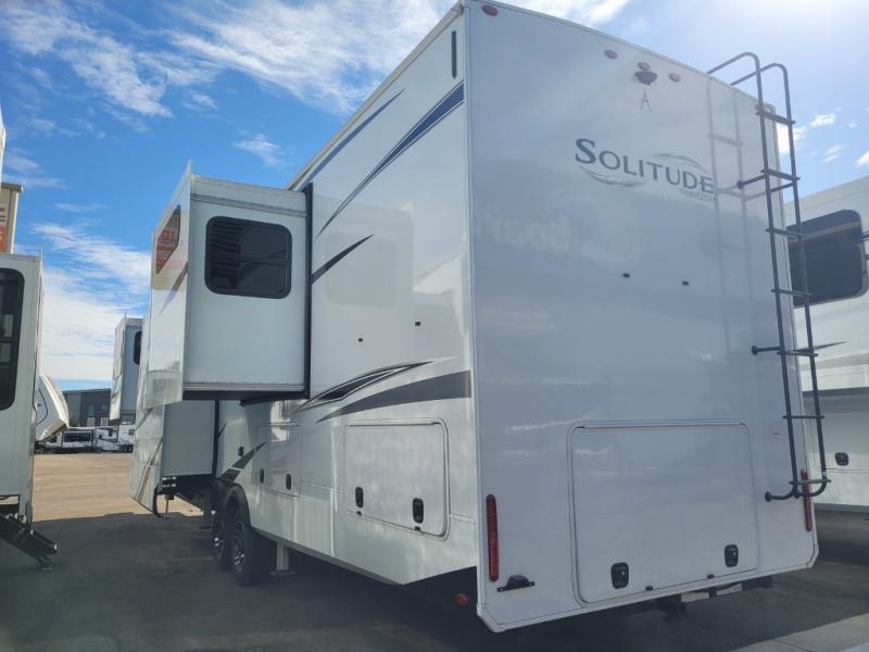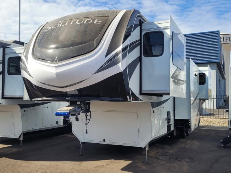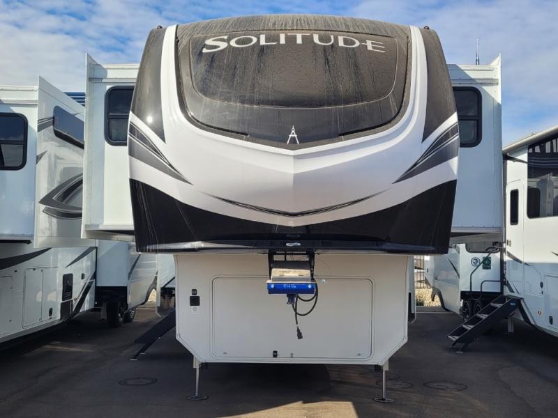 Each Solitude fifth wheel by Grand Design features a 101" wide-body construction, heavy duty 7,000 lb. axles, frameless tinted windows, and high-gloss gel coat sidewalls. You can camp year around thanks to the Weather-Tek Package that includes a 35K BTU high-capacity furnace, an all-in-one enclosed and heated utility center, and a fully enclosed underbelly with heated tanks and storage. Inside, you'll love the premium roller shades, hardwood cabinet doors, solid surface countertops and sinks, plus residential finishes throughout to make you truly feel at home. Each model also includes a MORryde CRE3000 suspension system, self adjusting brakes, and a MORryde pin box that will provide smooth towing from home to campground. Affordable luxury is possible with the Solitude fifth wheels; choose yours today!