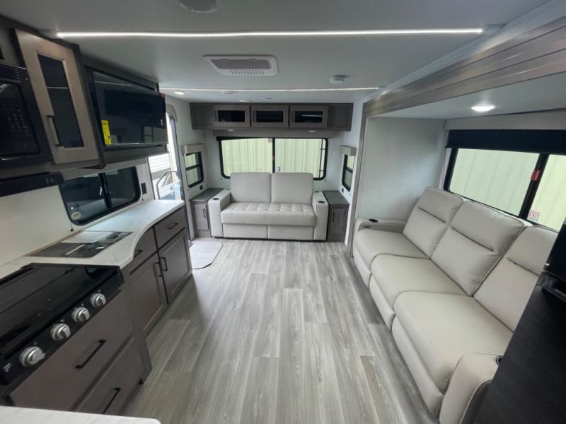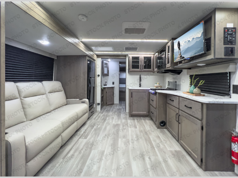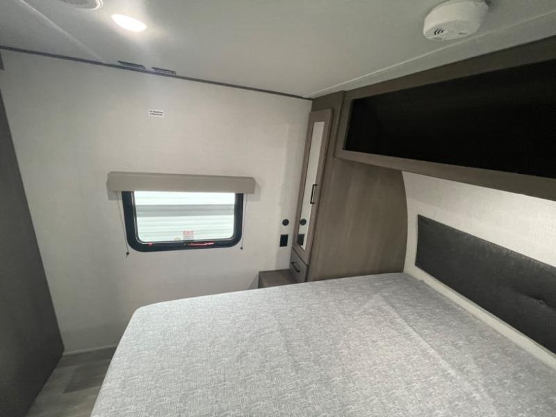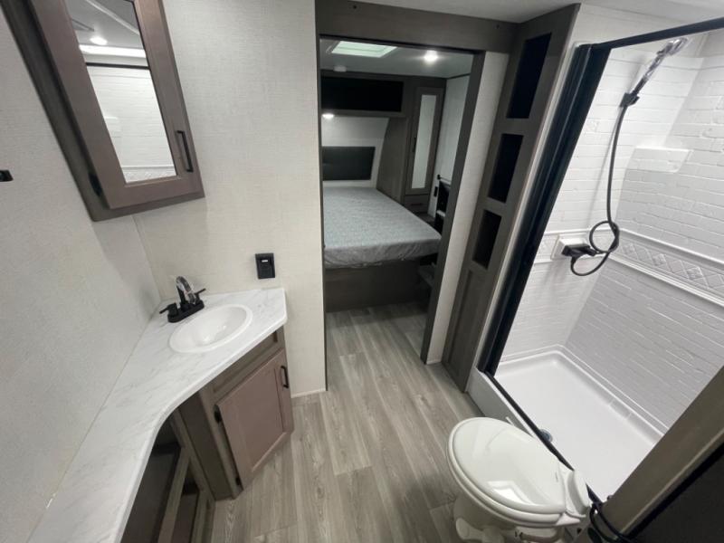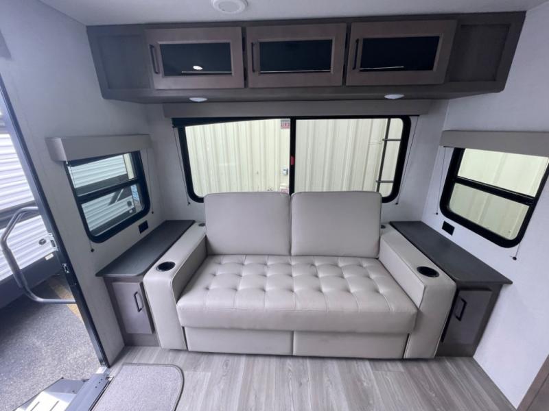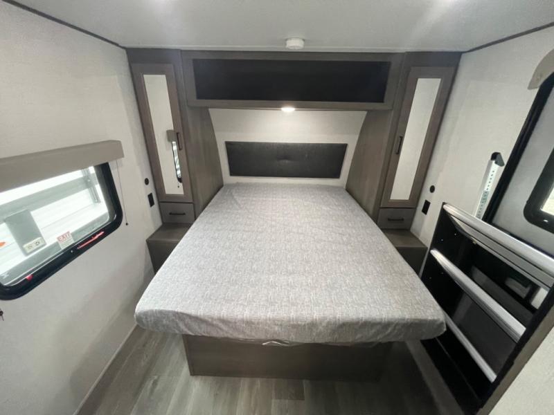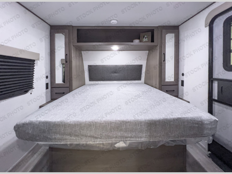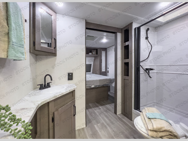 This dual-entry travel trailer will allow you to enjoy weekend getaways in complete comfort. The rear living area includes a U-shaped dinette and a 70" sleeper sofa that will double as seating and sleeping space for guests. Or, you can choose the optional theater seats in place of the dinette if you don't need the extra sleeping space. It will be so easy to fill the dog's food bowl with a convenient pet dish under the refrigerator, and you'll find plenty of storage throughout this model for all your belongings. The walk-through bath leads to the front master bedroom where you'll find a queen bed, overhead storage, and TV prep if you choose to add your own television.