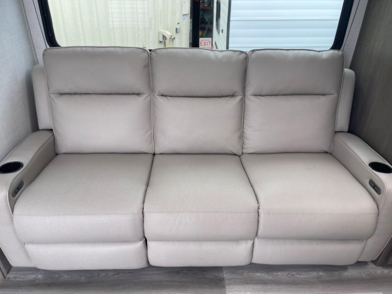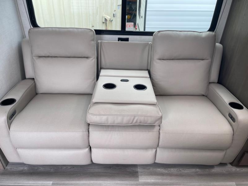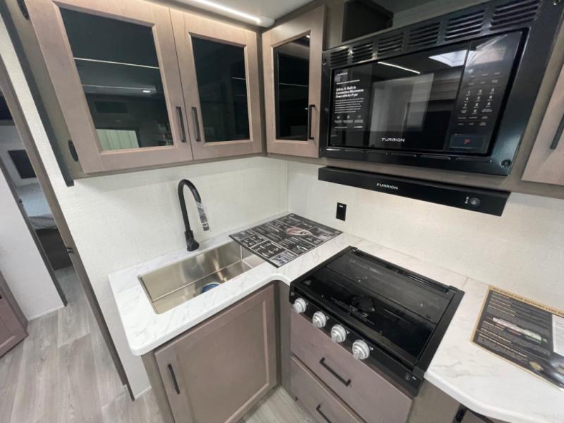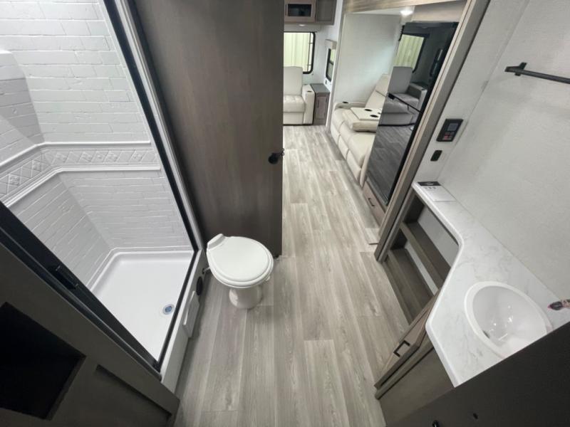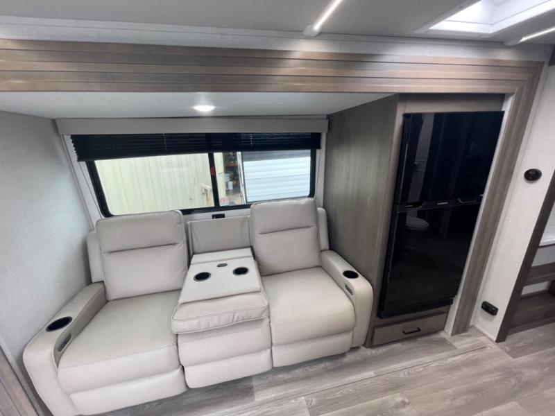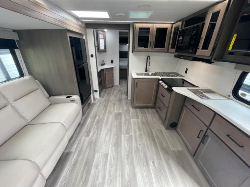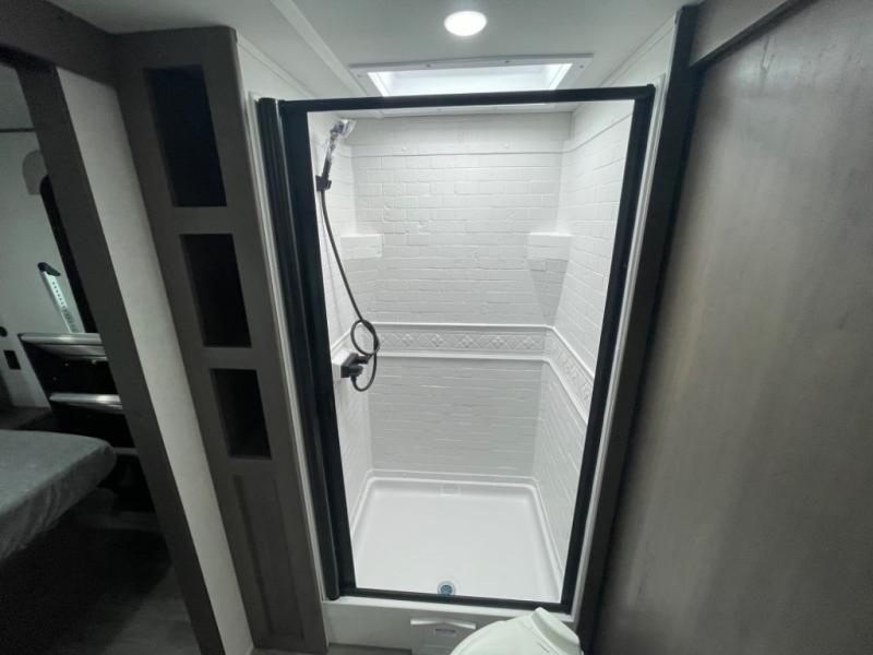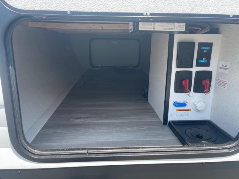 This dual-entry travel trailer will allow you to enjoy weekend getaways in complete comfort. The rear living area includes a U-shaped dinette and a 70" sleeper sofa that will double as seating and sleeping space for guests. Or, you can choose the optional theater seats in place of the dinette if you don't need the extra sleeping space. It will be so easy to fill the dog's food bowl with a convenient pet dish under the refrigerator, and you'll find plenty of storage throughout this model for all your belongings. The walk-through bath leads to the front master bedroom where you'll find a queen bed, overhead storage, and TV prep if you choose to add your own television.