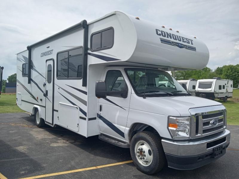 Each one of these Gulf Stream RV Conquest Class C LE Series gas motorhomes is built with a Cradle of Strength® on a Ford E350 chassis and a 7.3L V8 engine, or you can choose the optional Chevy chassis with a 6.0L V8 engine! Their construction also consists of a welded aluminum perimeter frame, an EPDM rubber roof, and high gloss white fiberglass sidewalls with Azdel substrate to prevent rotting. The included LE Luxury Package comes with vinyl flooring throughout for an easier clean, designer graphics, and an AM/FM radio with a built-in monitor and back-up camera for easy maneuvering at campgrounds. You will also appreciate the basement storage for luggage, camp gear, fishing poles, and more!
