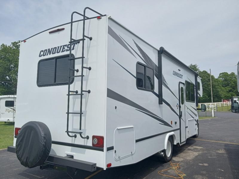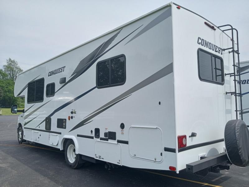 As you look forward to your next getaway, think about the many different ways that this Conquest Class C LE Series gas motorhome will come in handy! When you're tired after a long day of hiking, you won't have to search out a local restaurant because you'll be able to easily make your own dinner on the three-burner range in the kitchen, grab some condiments from the 10.2 cu. ft. 12V double-door refrigerator, and wash up the dirty dishes in the single round sink. When you just want to rest, you have quite a few choices for that too with the booth dinette, the jackknife sofa, the bunk above the cab, and the RV queen bed in the rear private bedroom.