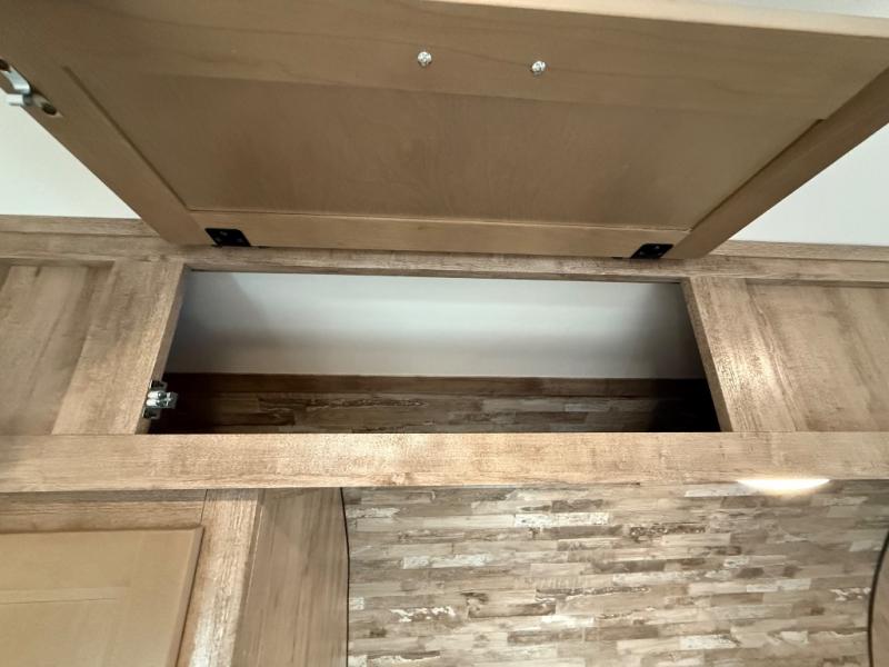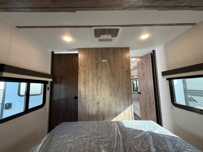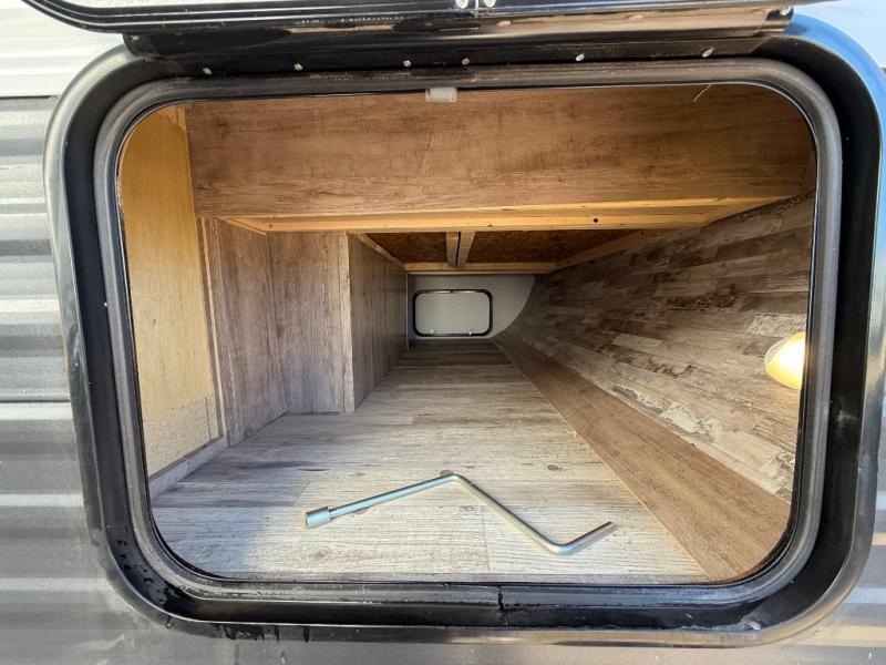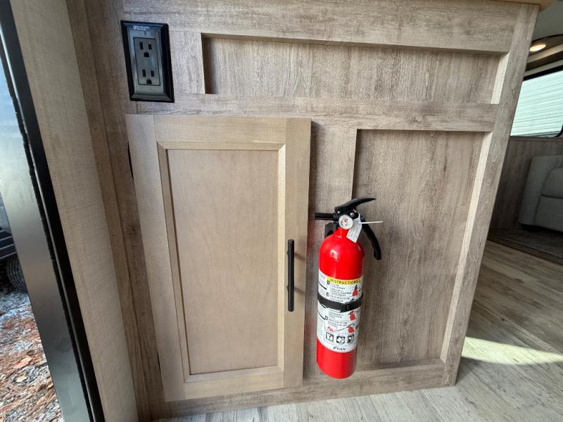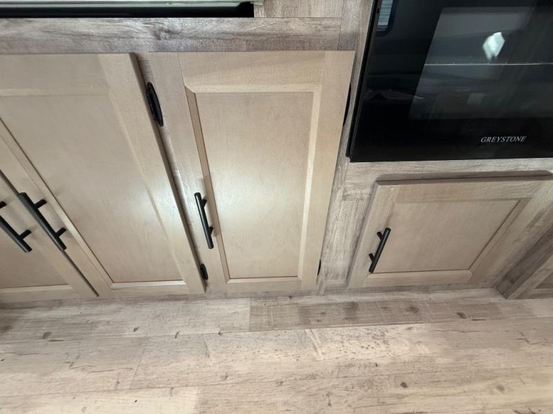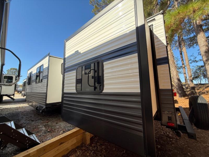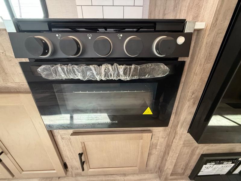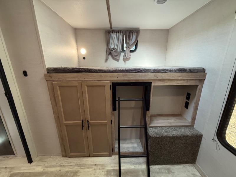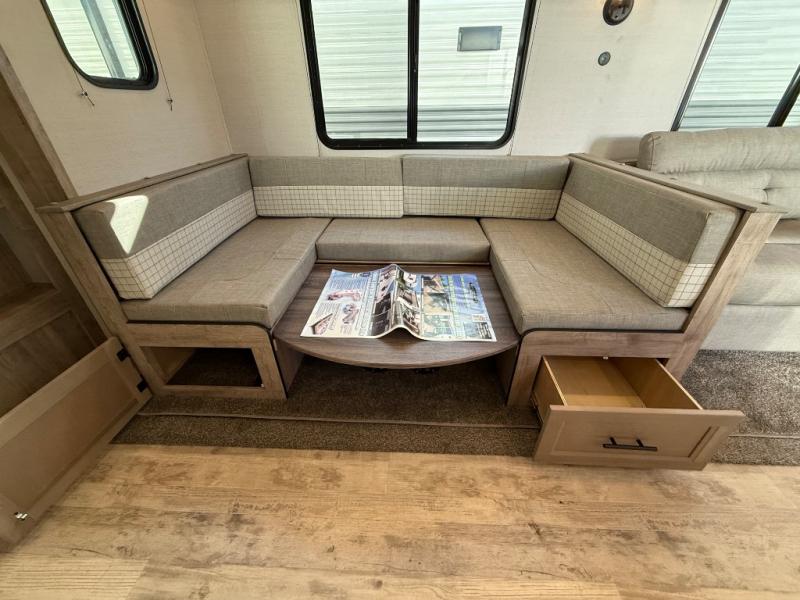 The whole family will have a comfortable place to sleep in this travel trailer! The kiddos can sleep in the rear private bunkhouse with the set of bunk beds slide and the bunk above the wardrobe and entertainment center. You will have your own privacy with the front private bedroom that has a queen bed, a shirt closet and a wardrobe on either side, and doors on either side of the living area entertainment center to enter/exit the bedroom. Take an afternoon nap on the sofa or play a card game at the U-shaped dinette after enjoying a delicious meal prepared with the three burner gas range with super burner and oven. There's even an outside kitchen that you can prepare your meals at too!