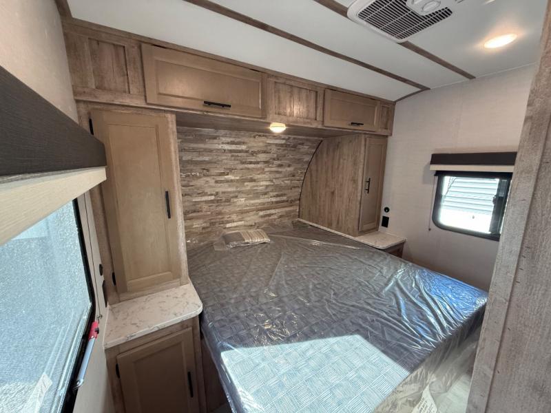 One of these Gulf Stream Conquest Supreme Series travel trailers is ideal for you whether you are looking for a family-friendly unit or a two person getaway! Their uni-body construction is made up of sidewalls, ceiling and floor screwed, glued and tied together with steel straps for unmatched strength and resilience. A powder-coated steel I-beam frame with welded outriggers hold them together and the one-piece seamless roof will last for years to come. Each model includes a 13,500 BTU ducted roof A/C and a gas furnace to keep you comfortable all year long, and the tankless water heater will provide endless hot showers. The included Supreme Package includes upgraded graphics and bigger slide windows, a heated and enclosed underbelly, solar and backup camera prep, and many more hassle-free features. You will appreciate the lighted storage area to easily pack your gear, and the Bluetooth soundbar with outside speakers will make unloading fun!