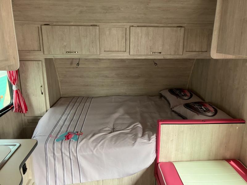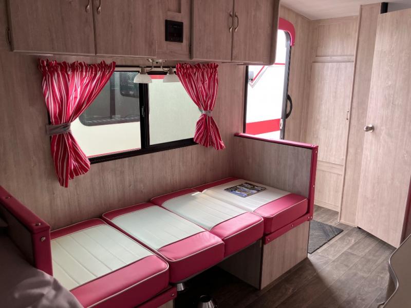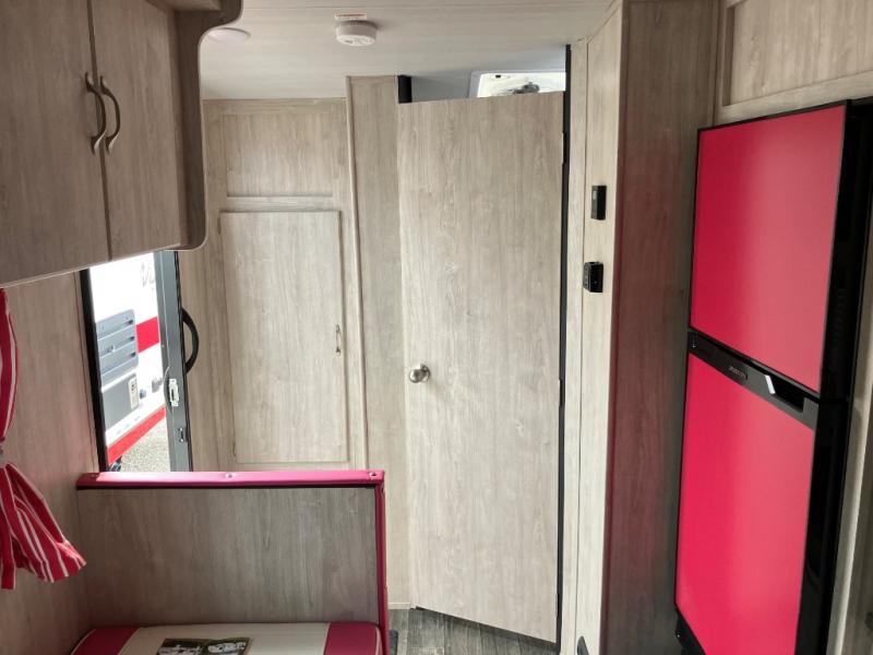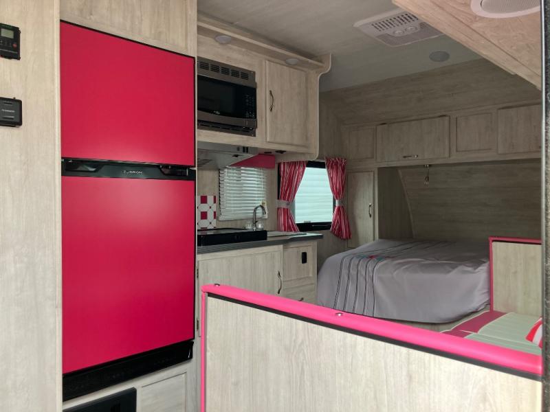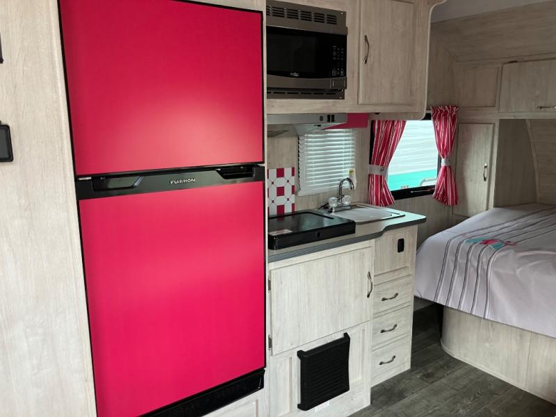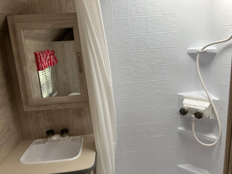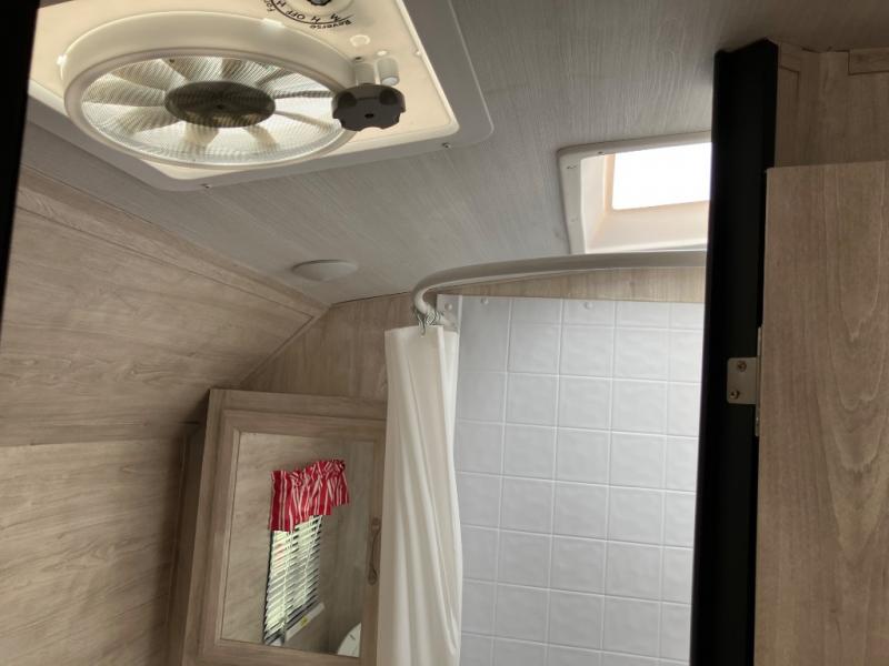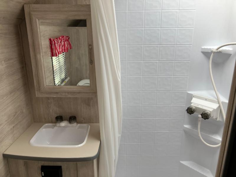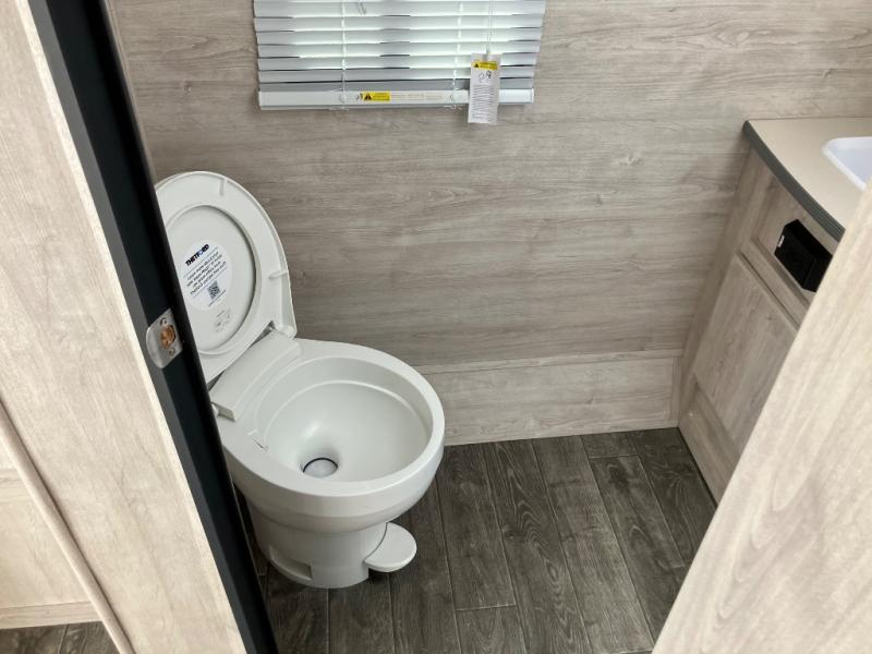 Make your camping trips memorable in this cozy travel trailer. Once you arrive at the campsite, you can unload the exterior pass-through storage, then head out on a trail to stretch your legs. The full bath will allow you to freshen up before dinner, and there is an entry closet with shelves to put your shoes and jackets up. A two burner cooktop and microwave oven comes standard, plus you'll find a 5 cu. ft. double door refrigerator for your perishables. When it's time to call it a night, you'll enjoy the 54" x 74" front corner bed, while your overnight guest sleeps on the booth dinette!