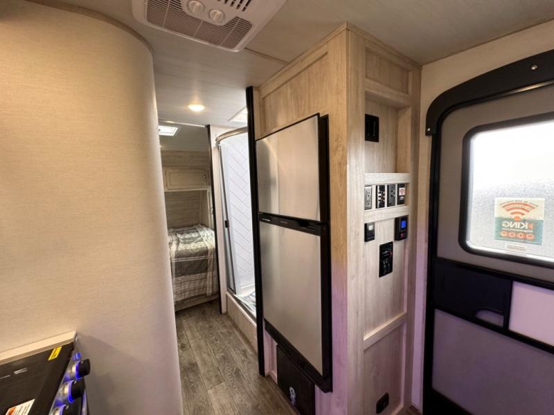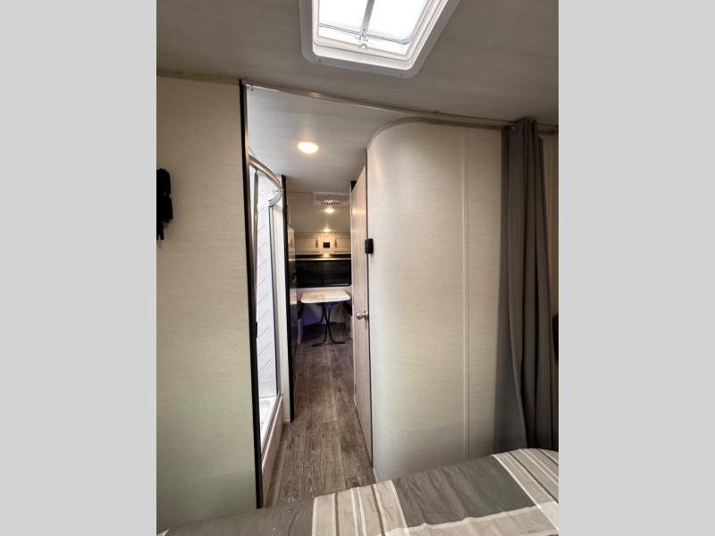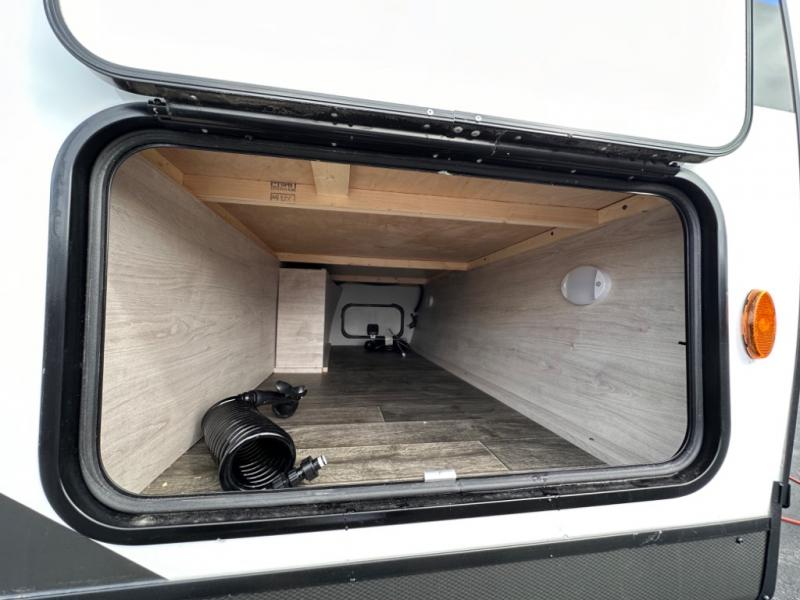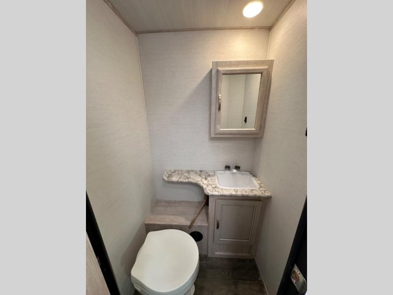 You will feel right at home in this travel trailer with the front queen bed that has privacy curtains to draw at night and shirt closets! The separated bathroom makes it easy for one to take a hot shower while another washes up for dinner. You can prepare delicious home cooked meals with the three burner cooktop and enjoy them at the rear booth dinette. The dinette can also transform into an extra sleeping space and there is a TV mount location diagonal to it also!