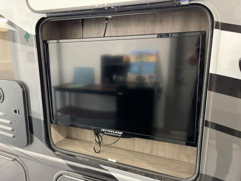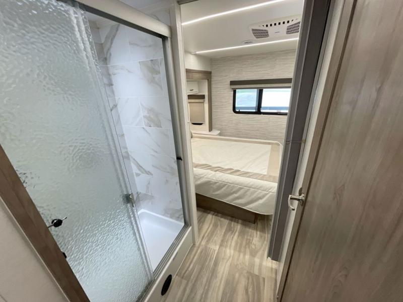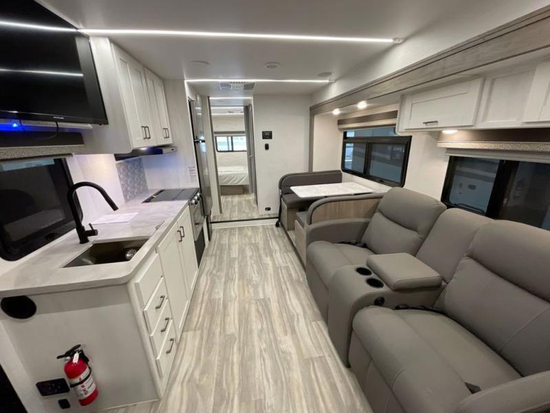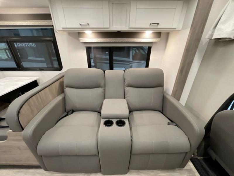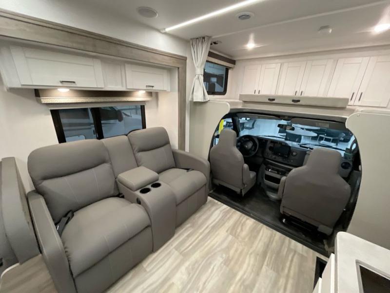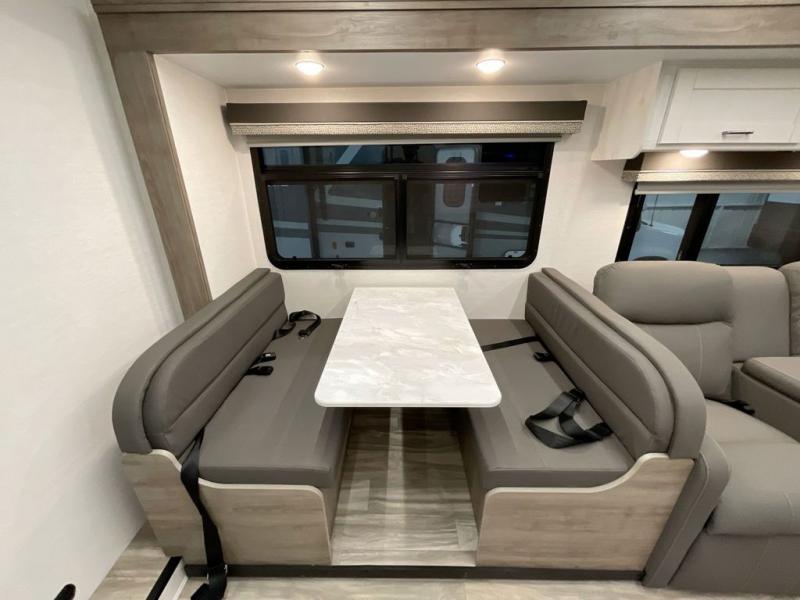 This motorhome is perfect for a small family or group of friends wanting to travel the country! Everyone will have a comfortable place to sleep between the overhead bunk, the 60" x 74" queen bed, and the jackknife sofa once converted, plus you can convert the booth dinette into one too. Prepare your best meals with the three burner cooktop and store any leftovers in the 10.2 cu. ft. 12V double door refrigerator/freezer. The separated bathroom makes it easy for one person to wash up in the shower while another uses the private toilet and sink. If you choose to add the optional TV with swing arm to the inside and the optional outside entertainment center then you will have plenty of entertainment for every trip!