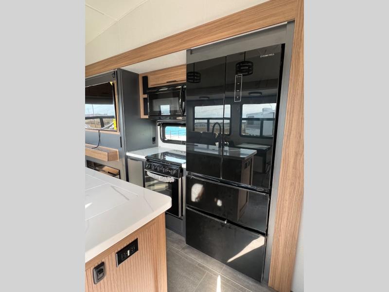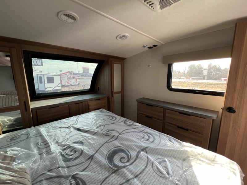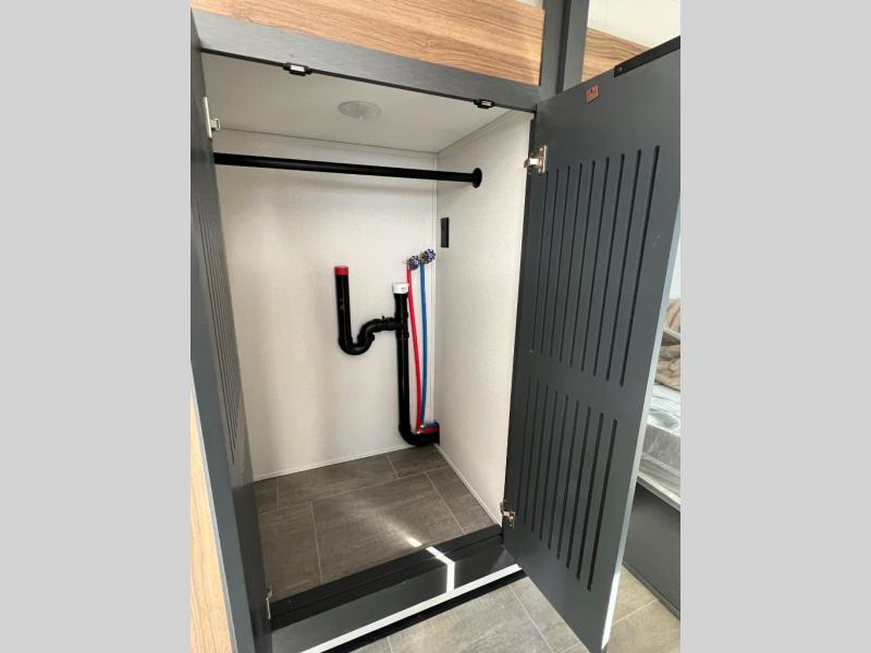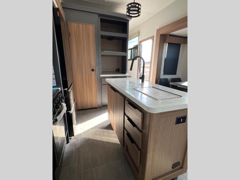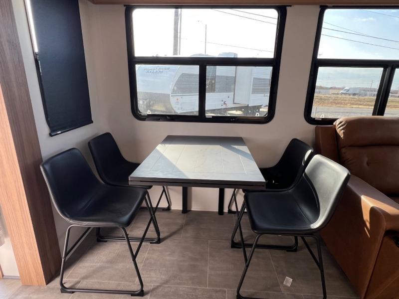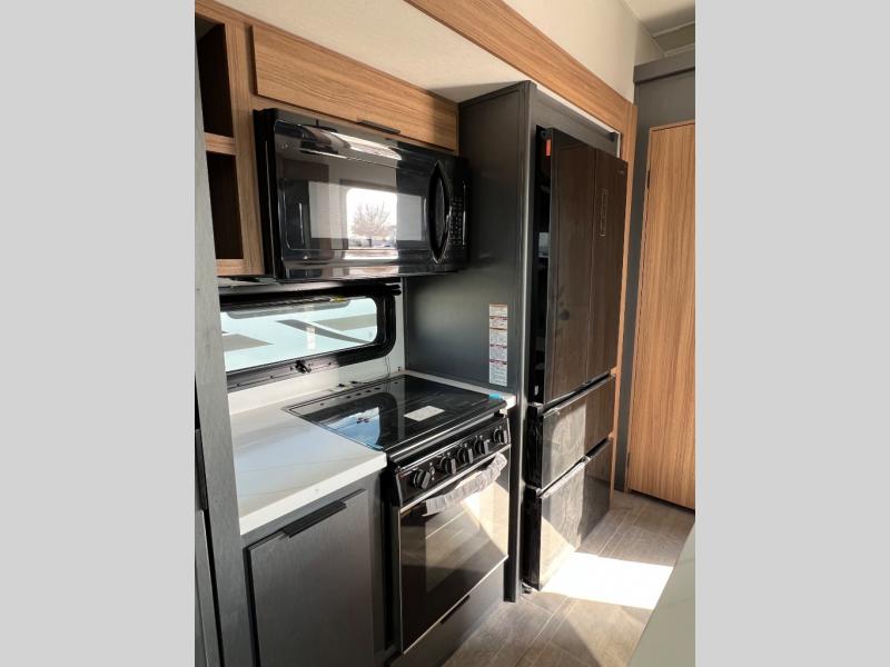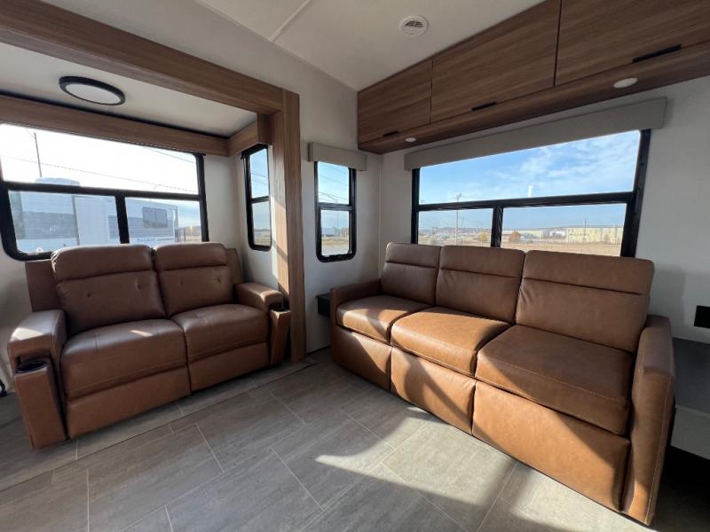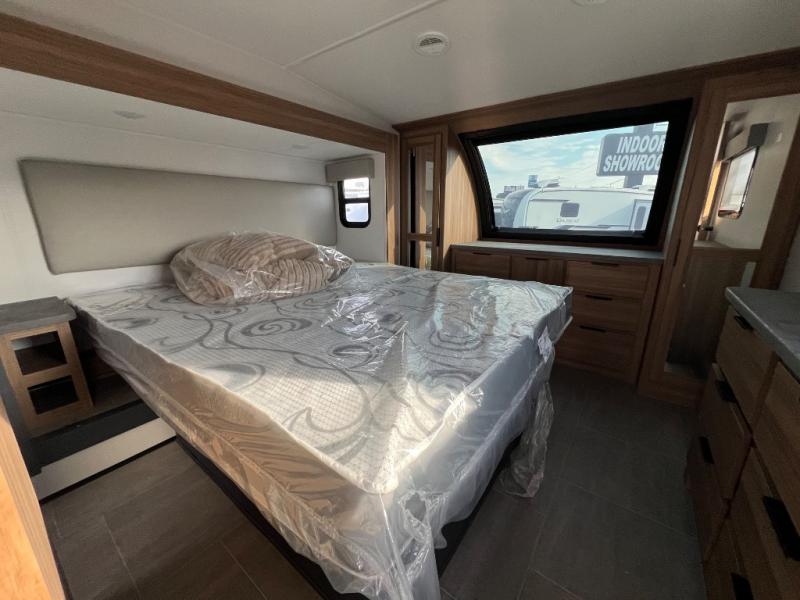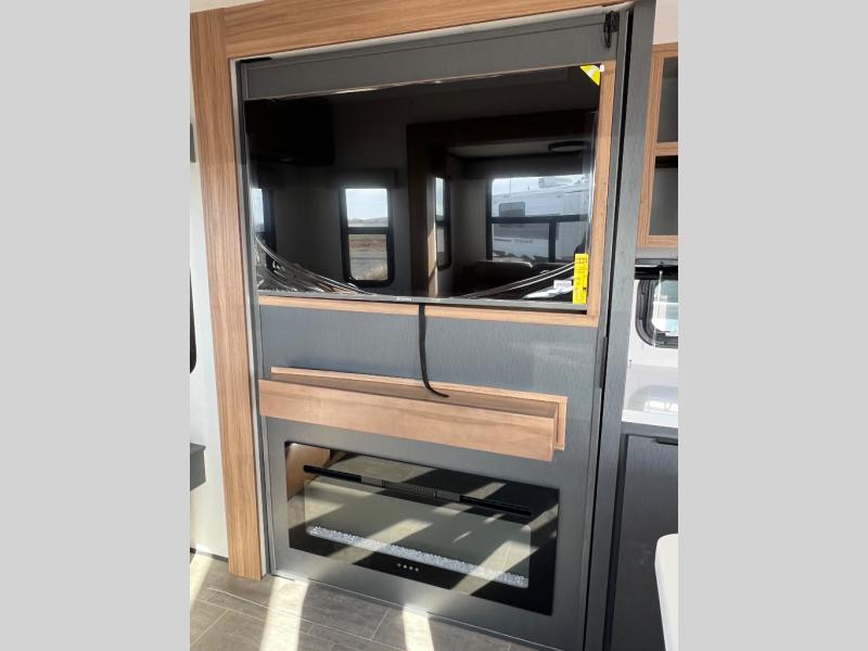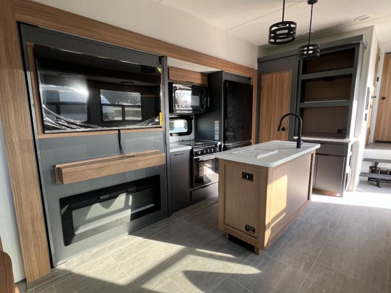 You won't even feel like you're camping in this fifth wheel! The front master suite has a 72" x 80" king bed slide across from a dresser and next to an area prepped for a washer and dryer, plus there is a front dresser with wardrobes on either side and even an entrance into the dual entry bathroom. The bathroom has a radius shower to freshen up in each morning and a lighted mirror to make it easier for seeing as you get ready. The chef will have a great time preparing their best meals in the kitchen with the kitchen island, 16 cu. ft. refrigerator big enough for their favorite ingredients, a 22" oven to cook fresh cinnamon rolls, and a 30" over the range microwave to pop a bag of popcorn on movie night. Relax in true comfort in the rear living area on the residential furniture with hidden cup holders and USB charging ports by the electric fireplace with hidden storage!