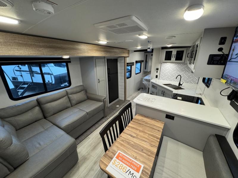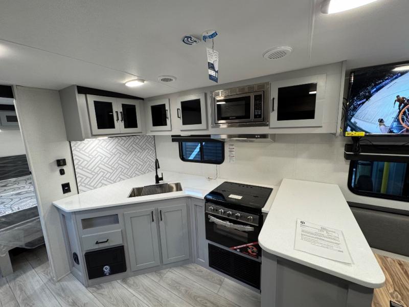 The Heartland North Trail Ultra-Lite 25RBP combines lightweight towability, spacious design, and high-end features—perfect for couples or small families looking for a travel trailer that’s as comfortable as it is functional. With a private king bedroom, expansive rear bath, and both indoor and outdoor cooking options, this model is built for year-round adventures.