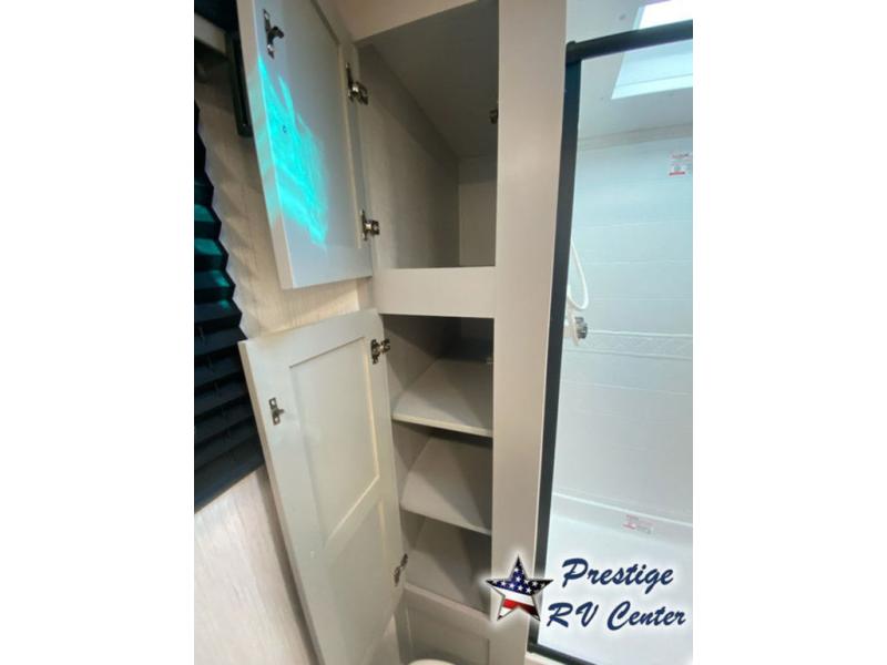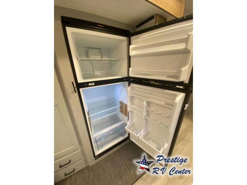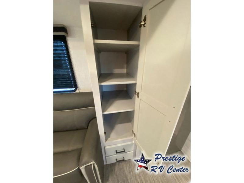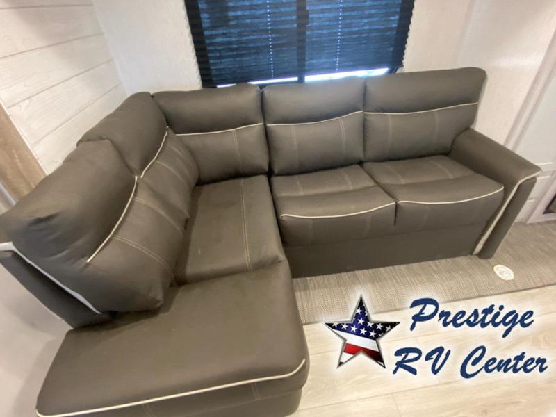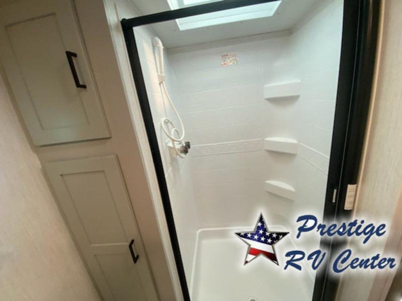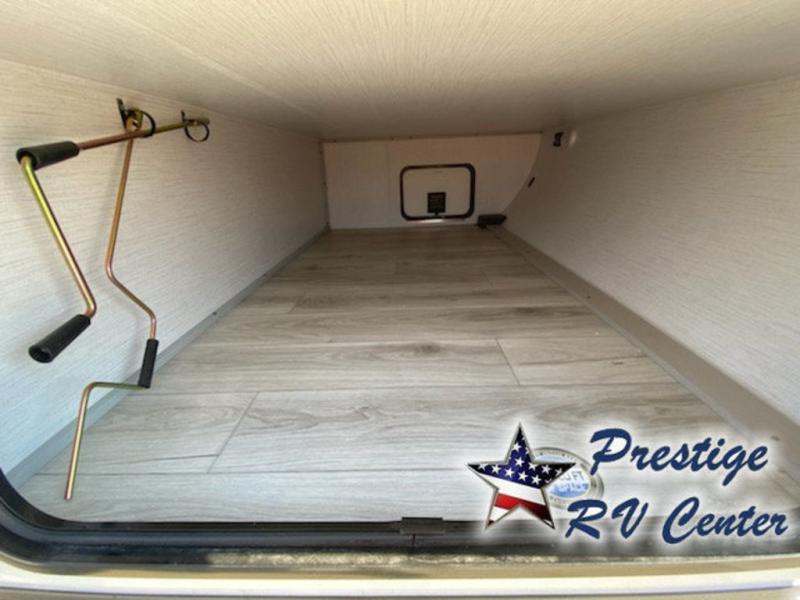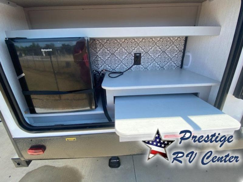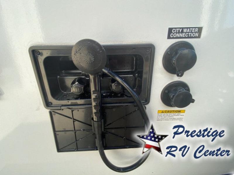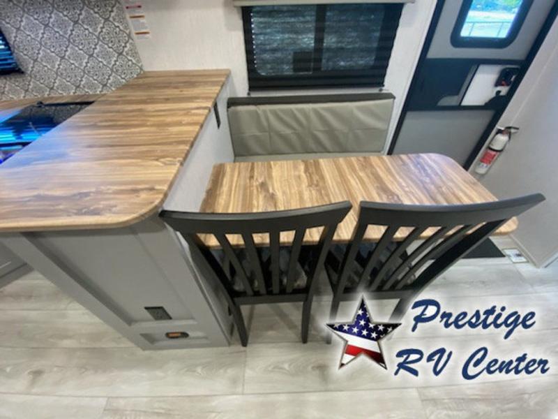 Head to your state park in this spacious travel trailer that can sleep four people each night. The sleeper sofa with a stowaway table within the large slide will provide comfortable dining and sleeping space, plus there is a dinette with bench seating on one side and two chairs on the other. You and your spouse will love the full rear bath with generous counter space and a shower skylight to let natural light in. This model also includes an outdoor kitchen, plus a 16' power awning with LED lights for great outdoor fun!