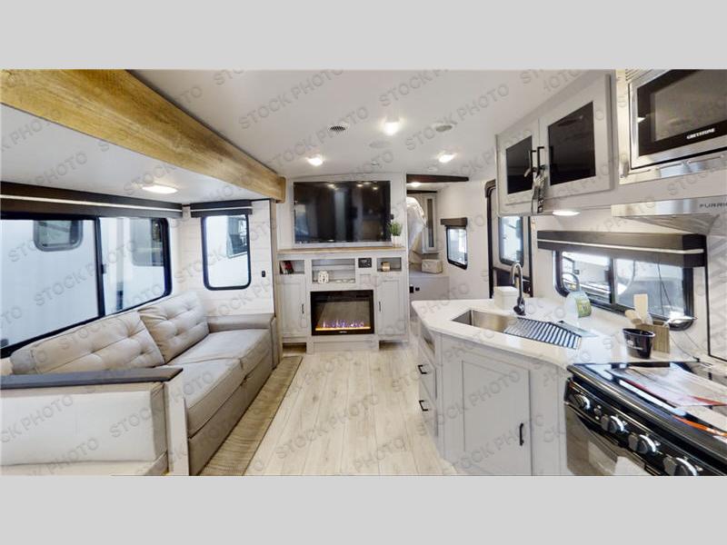 Head out to your favorite camping spots and take along a few friends! This North Trail unit features a set of flip-up double bed bunks for four family members or friends, plus a private bedroom up front featuring a king sized gel infused 72" x 80" mattress for two more. Beneath the bunks, you will have storage space for bicycles and kayaks if you like, or just more storage for totes and things until you get to your camping spot. The private bedroom up front features a space saving sliding door and nightstands and clothing storage along either side of the bed. In the combined living and kitchen area, you will enjoy the added floor space thanks to the booth dinette and sofa slide. Outside, an awning offers more living space to enjoy both day and night. What are you waiting for, come check this unit out!
