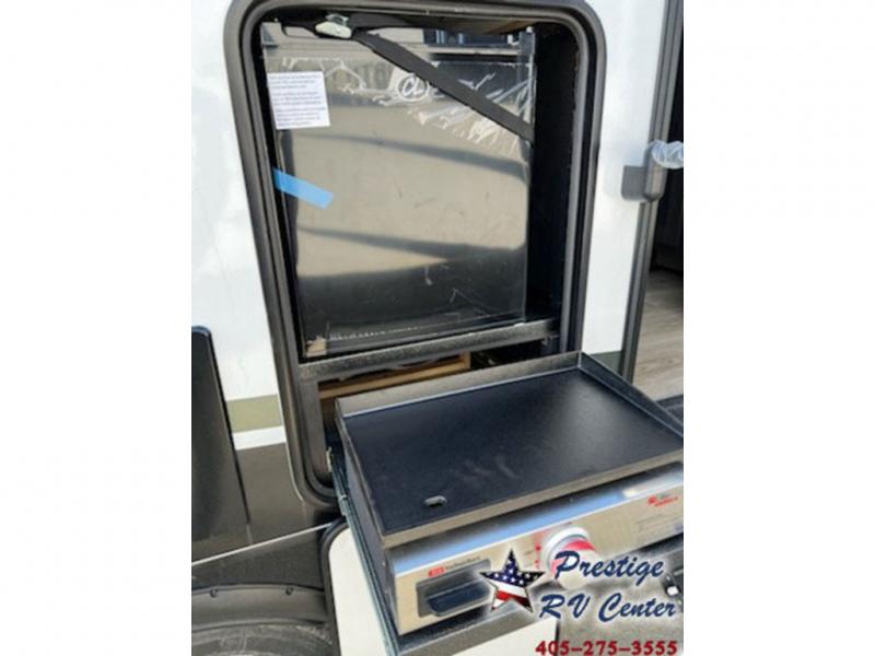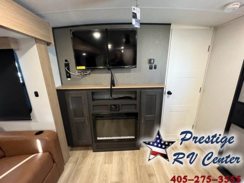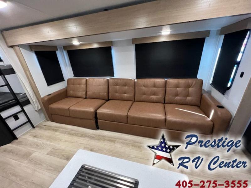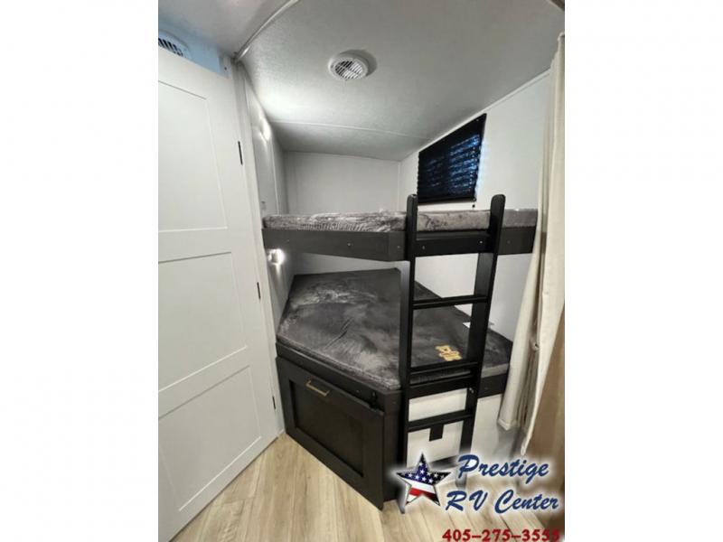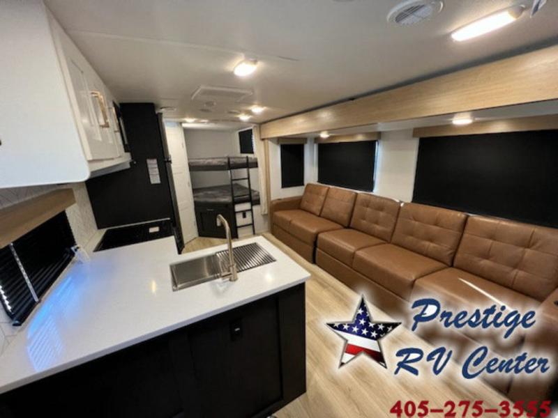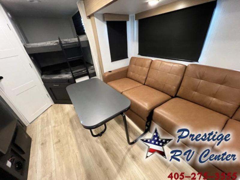 Double-size bunks make this travel trailer family and friends approved! The convertible sleeper sofa with stowaway table slide out will provide more space to stretch out in the main living area, and the rear corner bath will come in handy when cleaning up each day. The bathroom even has one of the dual entry doors to the unit so you can get back to having fun outside fast. The front private bedroom comes with a king bed with dual nightstands for your belongings. Everyone can gather under the 19' power awning with LED lights while the chef of the group prepares dinner on the exterior kitchen!