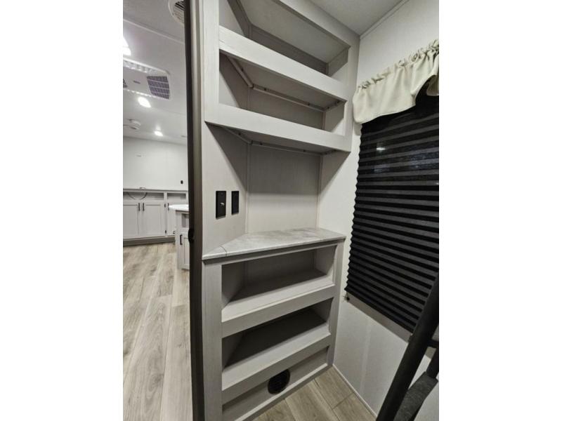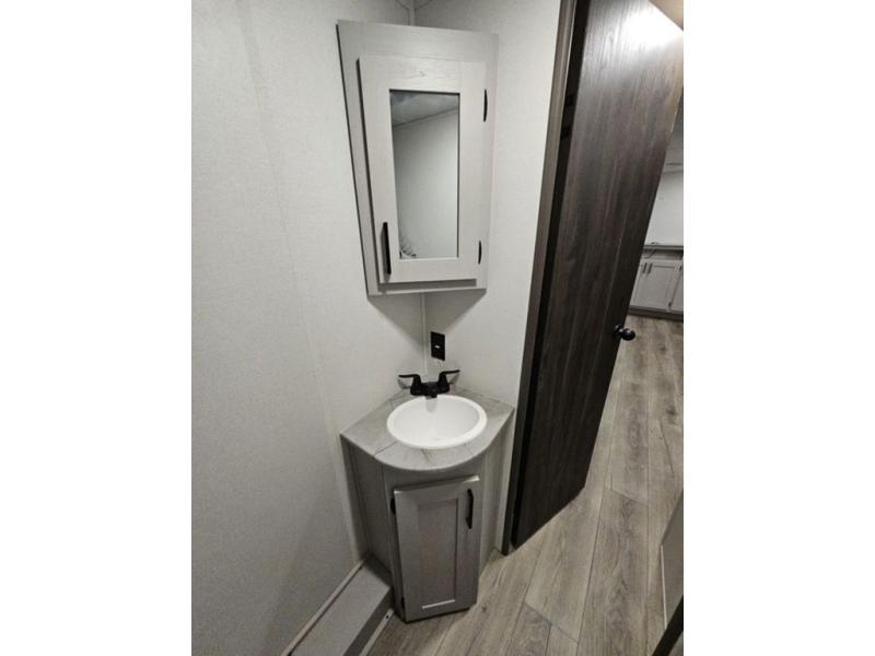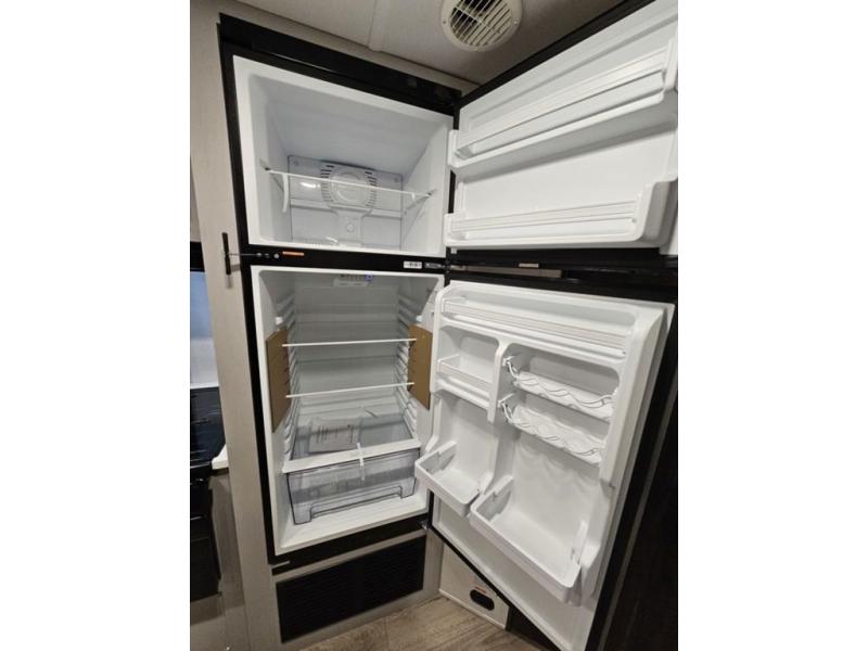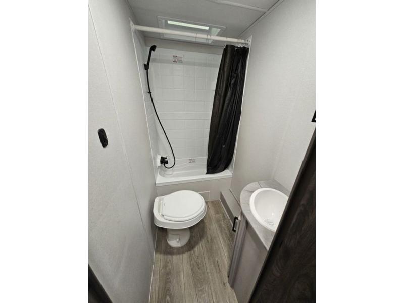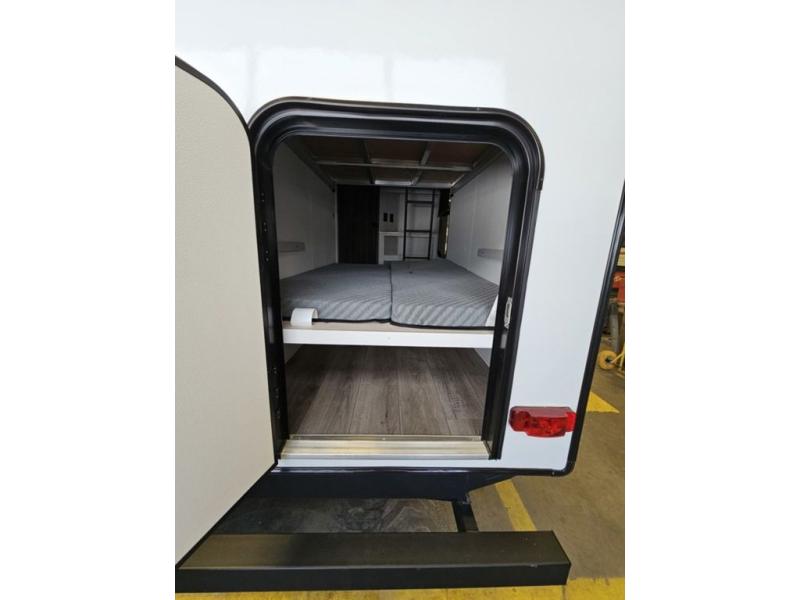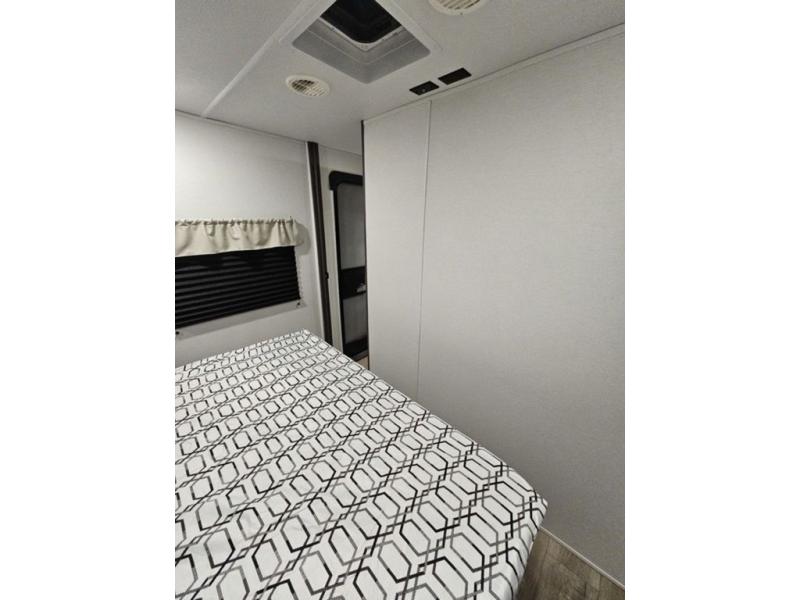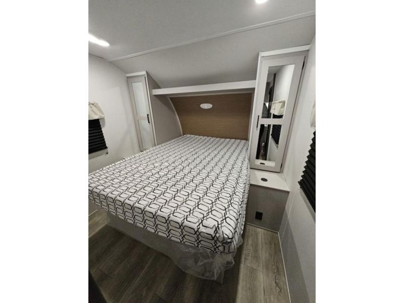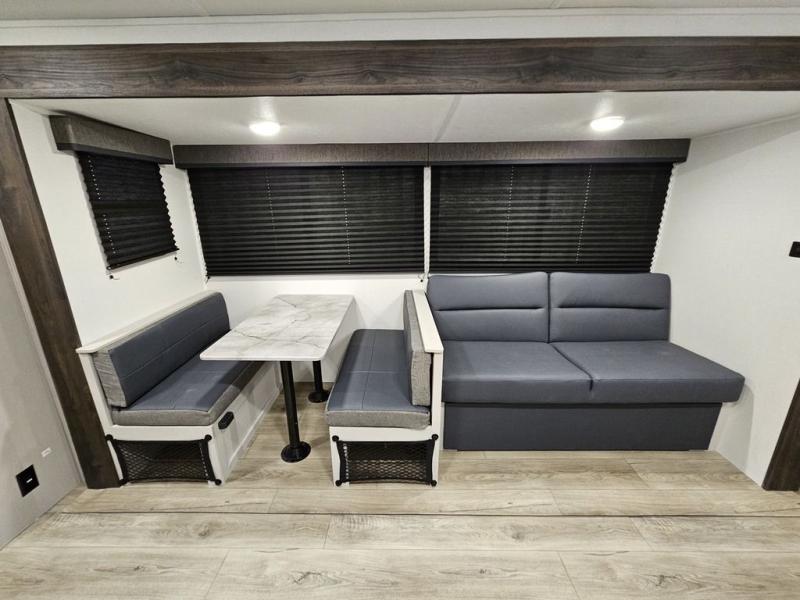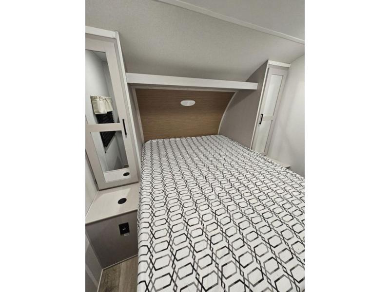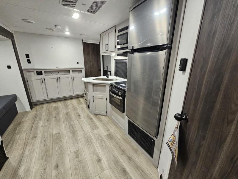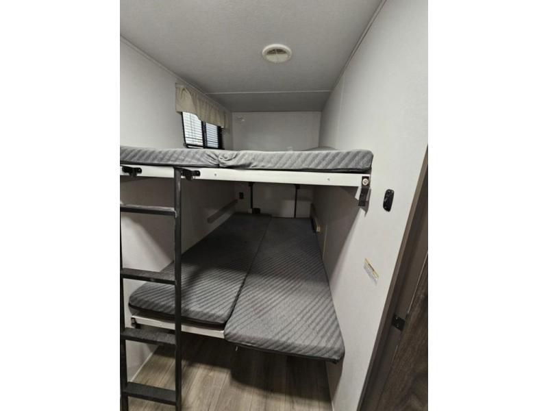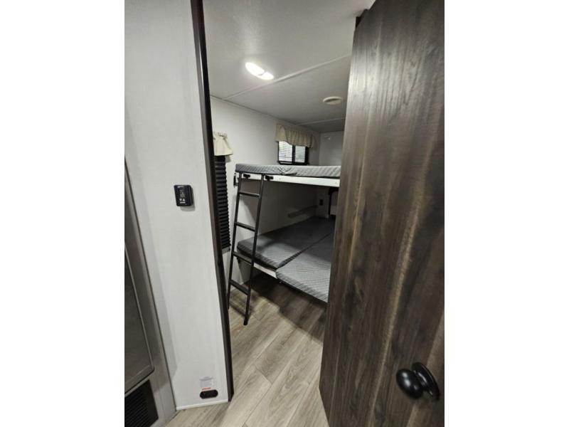 Trips to the lake are fun in this spacious travel trailer that can sleep eight people each night. The exterior storage door allows you to bring along bikes or a kayak with the under-bunk storage, and there is even a door to close off the bunks for privacy. The main living area includes a large slide out with a sofa and a booth dinette to dine, relax, and sleep more friends. Prepare a meal on the three burner cooktop before heading outdoors for the day, and when you return the full bath will be waiting for you. This model also includes a front private bedroom that will feel just like home, and you'll appreciate dual bedroom wardrobes to keep your clothes tidy!