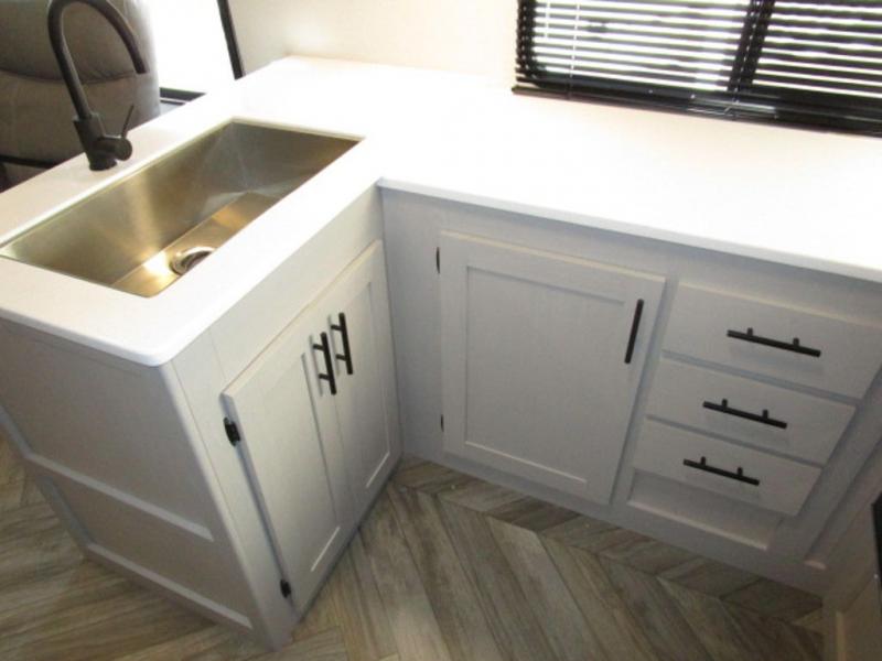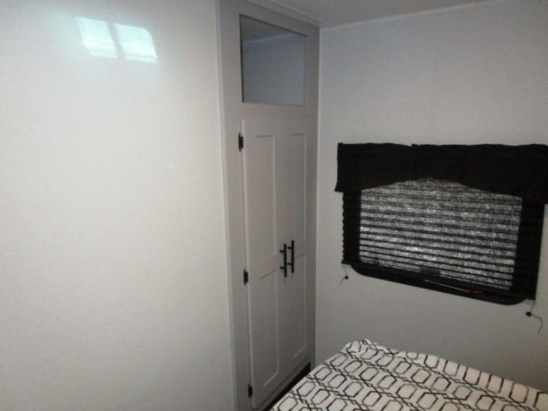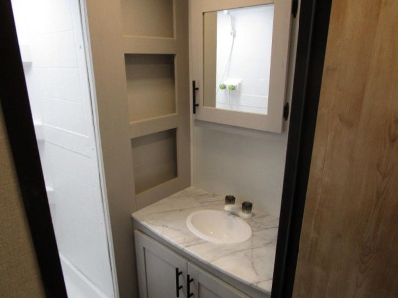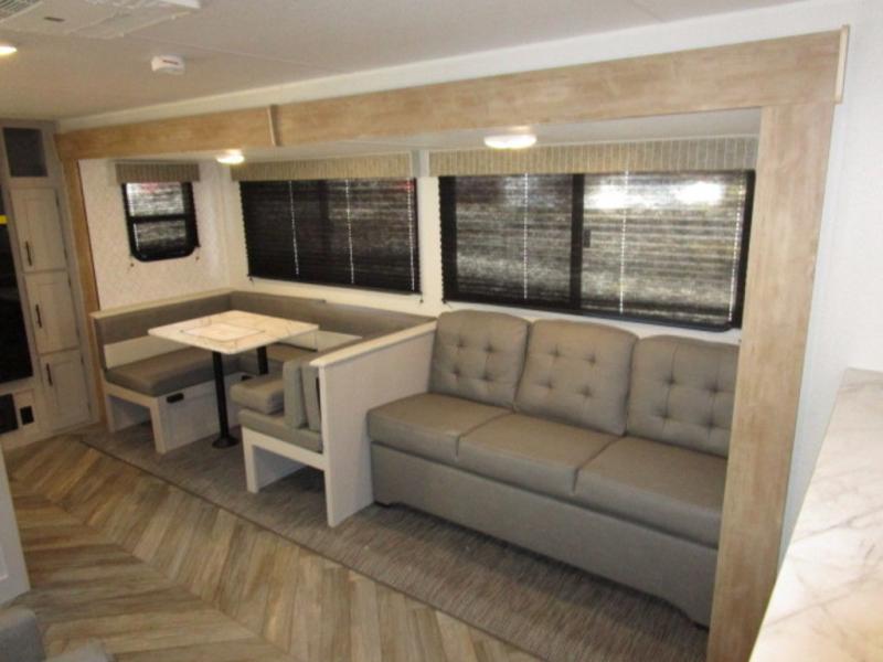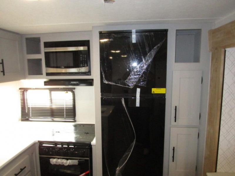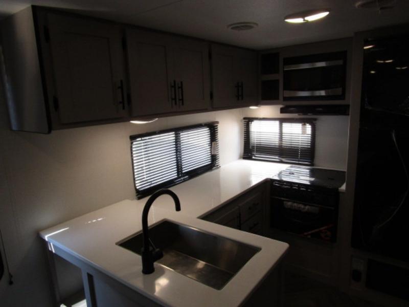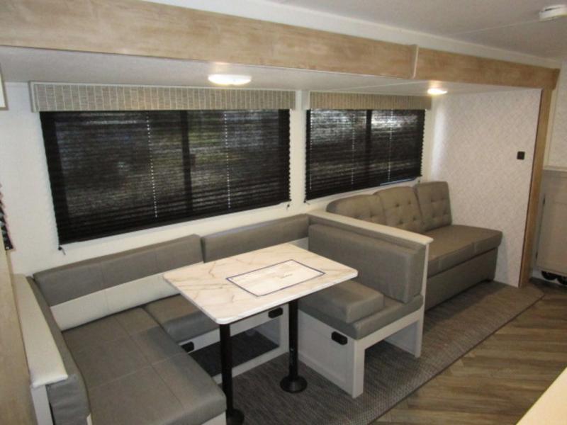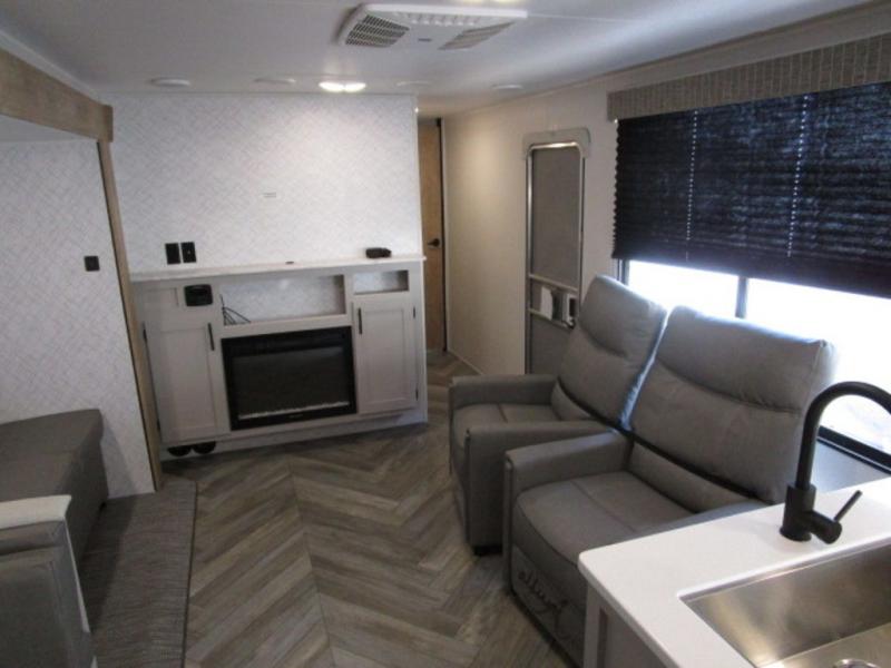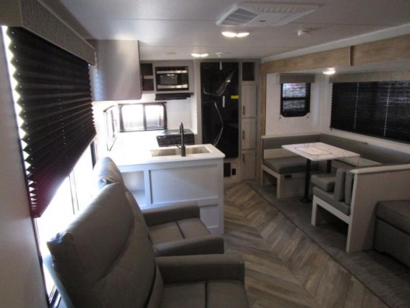 You will feel right at home with this travel trailer! The rear kitchen has plenty of countertop space to prepare your best home cooked meals. The U-shaped dinette is not only great for enjoying meals and playing games, but also for transforming into an extra sleeping space. Relax in true comfort each night on one of the two recliners or sofa by the TV prepped area. Freshen up after a fun filled day with the shower, and then head to the front private bedroom and get a good night's rest on the queen bed. You can even cook in the great outdoors with the outside kitchen that comes with a griddle and refrigerator to enjoy a cold beverage while you flip burgers!