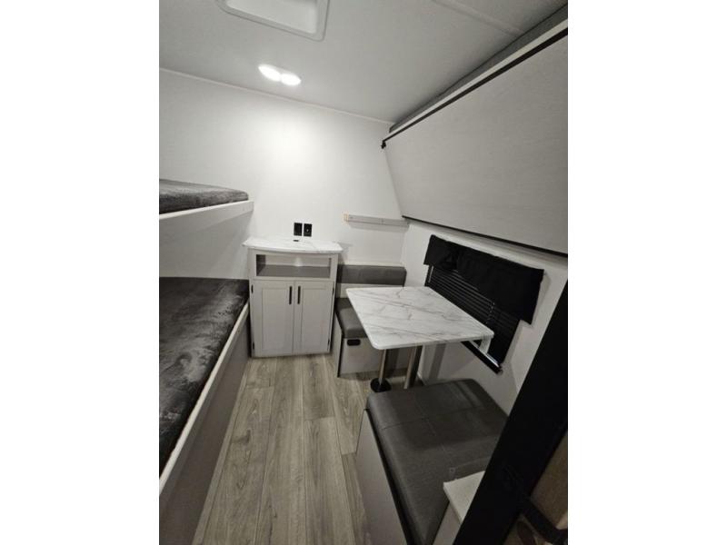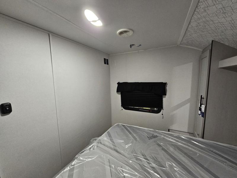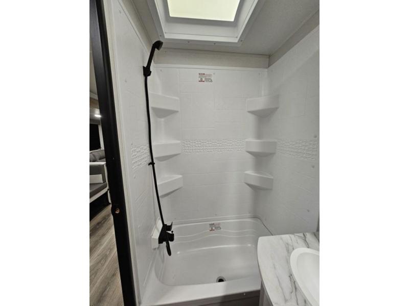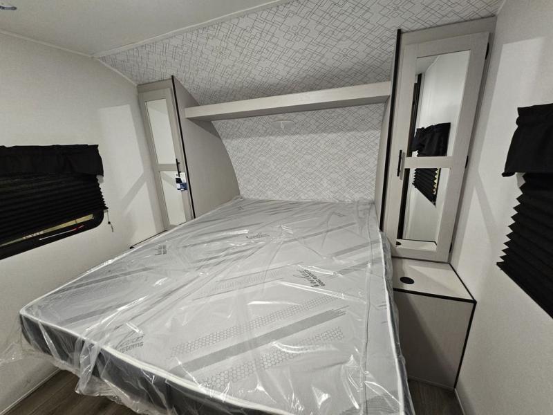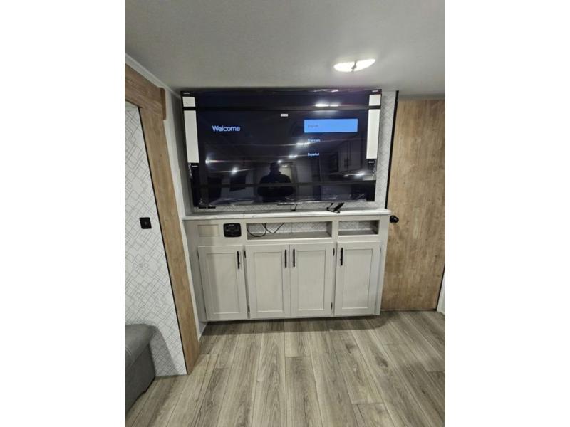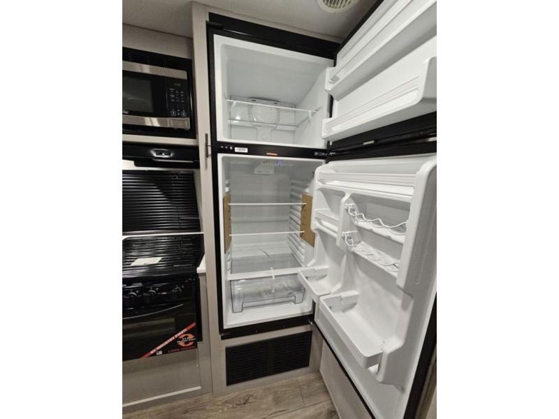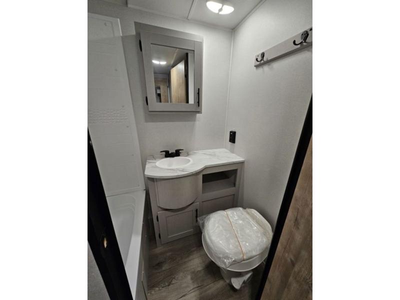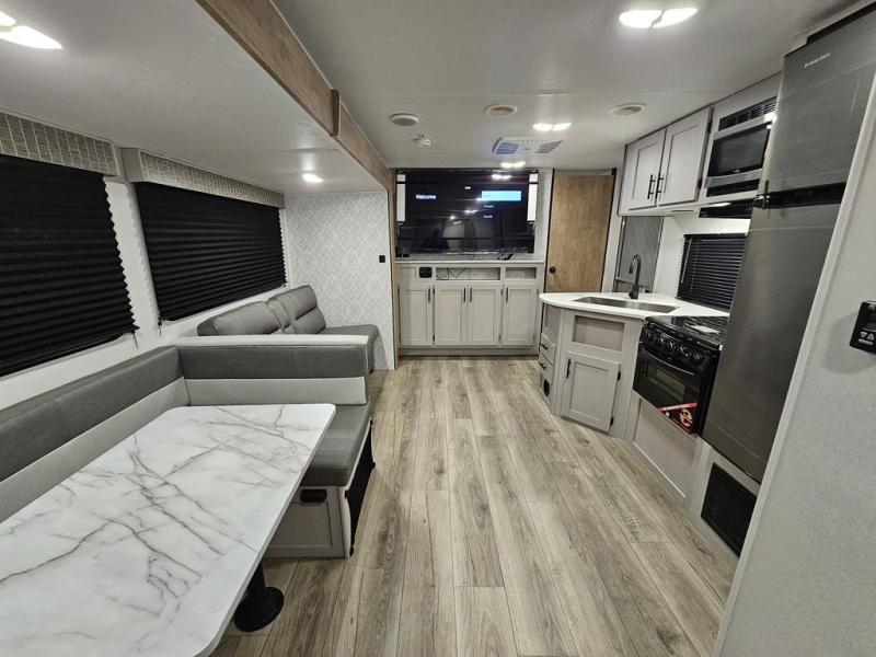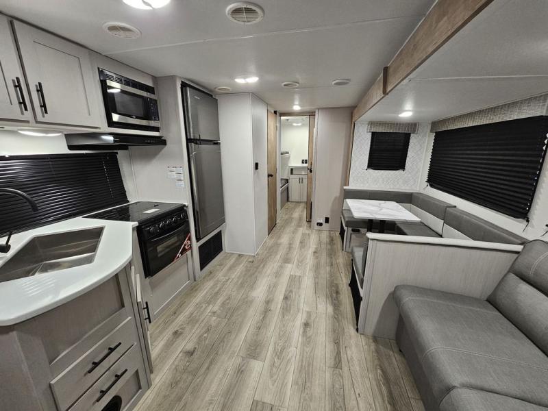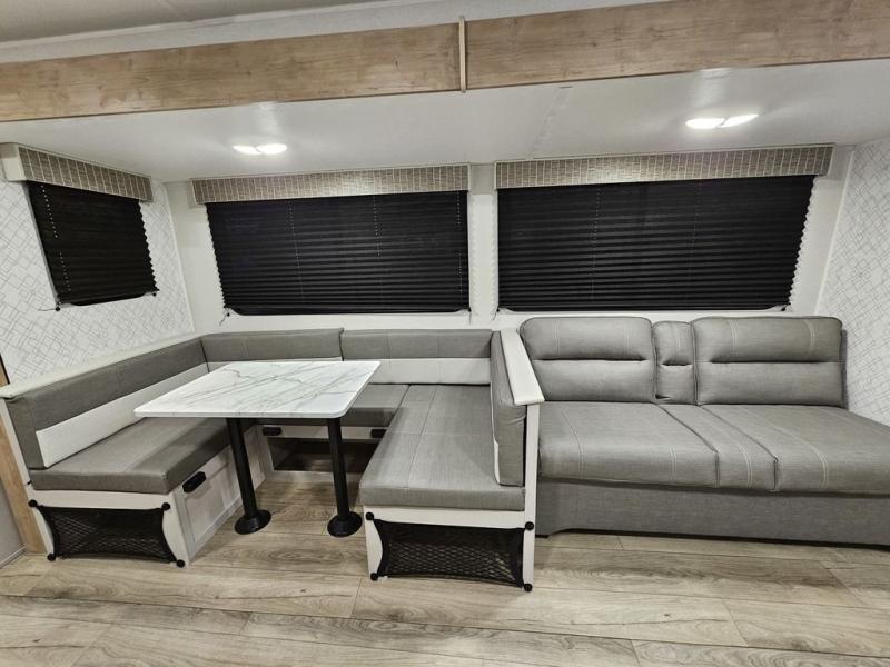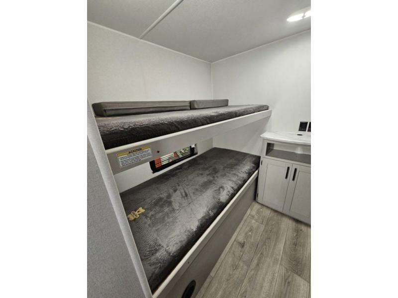 This travel trailer allows you to invite your whole crew along with a rear private bunkhouse and a front private bedroom. The bunkhouse includes three bunks, plus a dinette where the little ones can draw or play a game together. The U-shaped dinette and sofa within the large slide out will provide space to relax, dine, and sleep more guests. This model includes a three burner cooktop, a microwave oven, plus a 10 cu. ft. extra large residential refrigerator for your perishables.