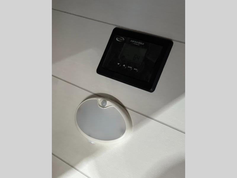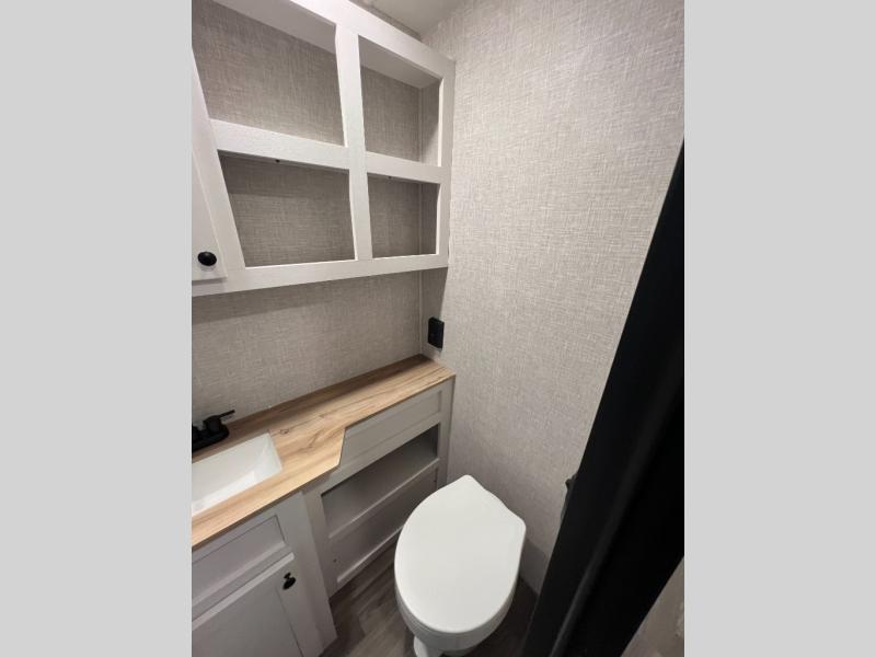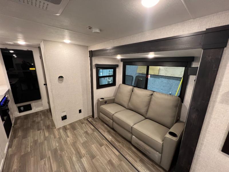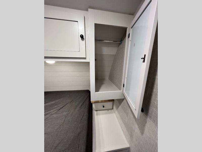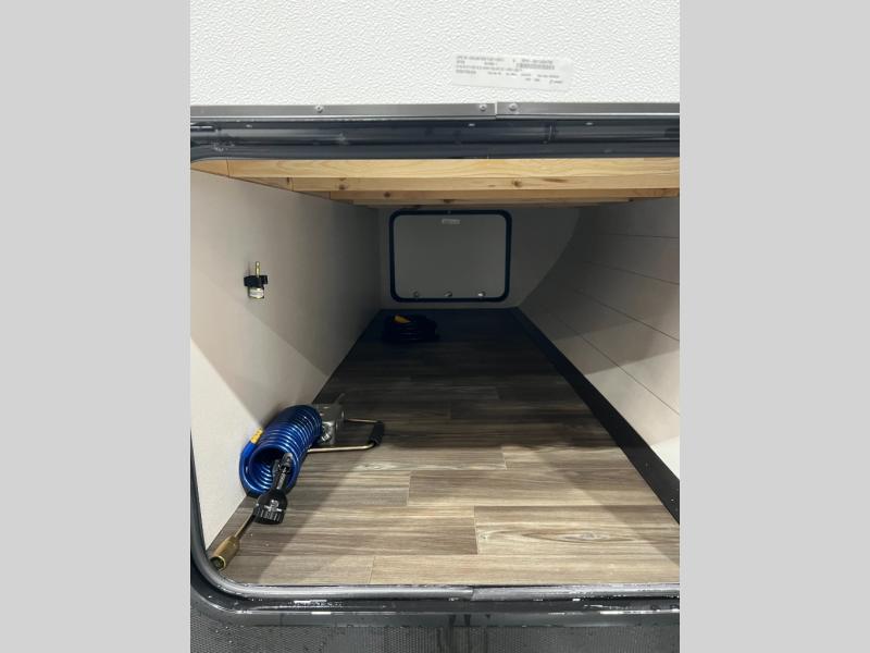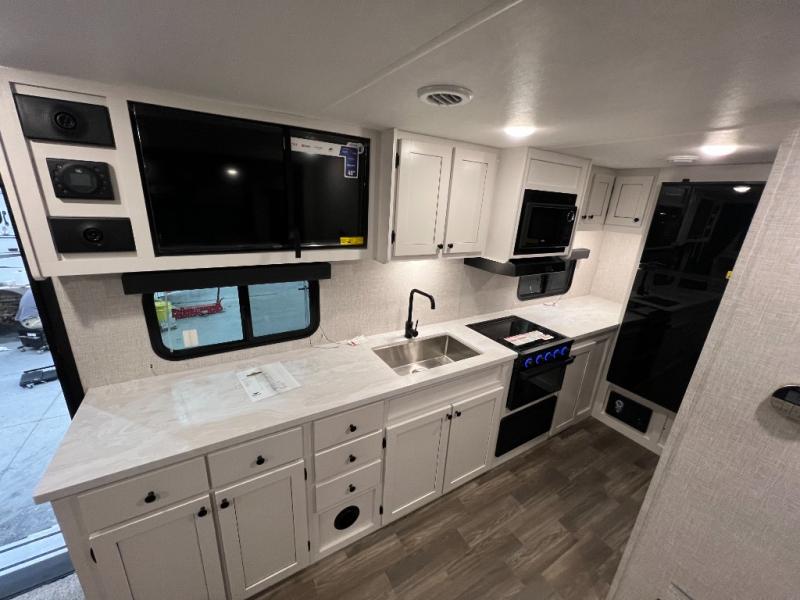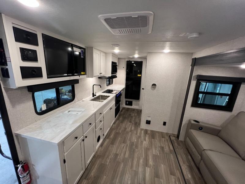 You and your spouse will enjoy camping in this travel trailer! The L-sofa slide out provides more space to stretch out and relax, and there is a table with it to enjoy your meals. This model includes a rear corner kitchen with plenty of counter space, a 10 cu. ft. 12V refrigerator, plus a three burner range with a 17" oven. Get a good night's rest each night on the front queen queen bed with wardrobes on either side and a privacy curtain to draw for added privacy. You will find a grill hookup LP quick connect outdoors plus an exterior docking station and a sprayer hose, and a pass-through storage for hiking and fishing gear!