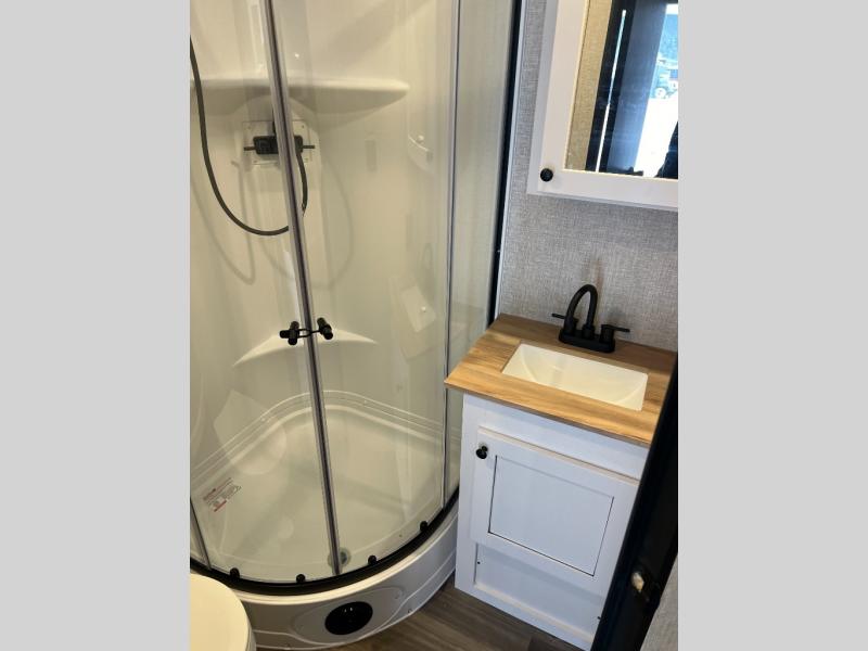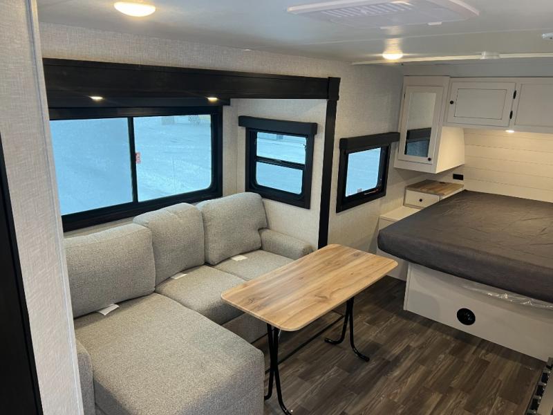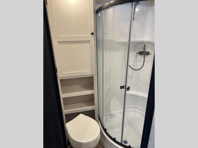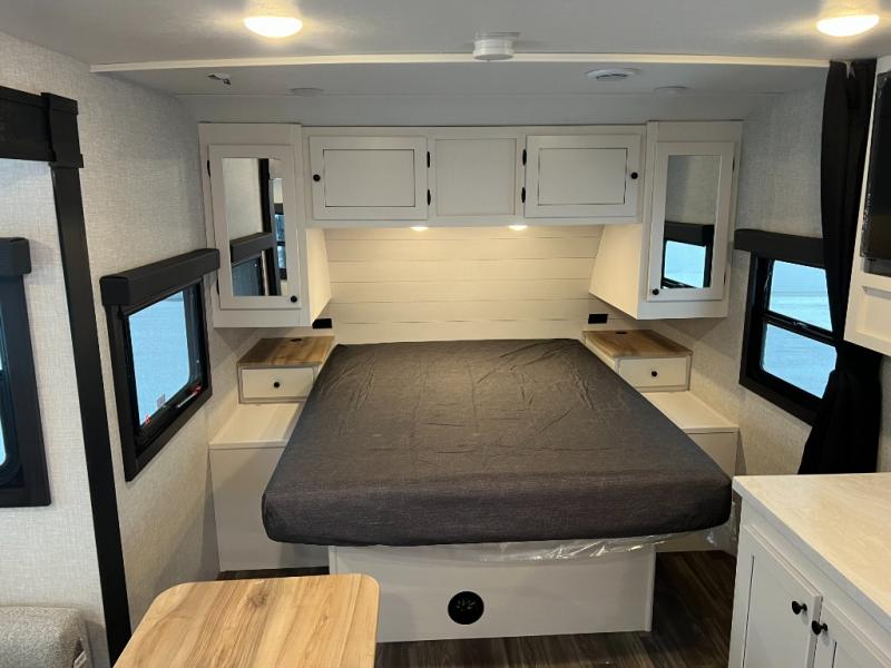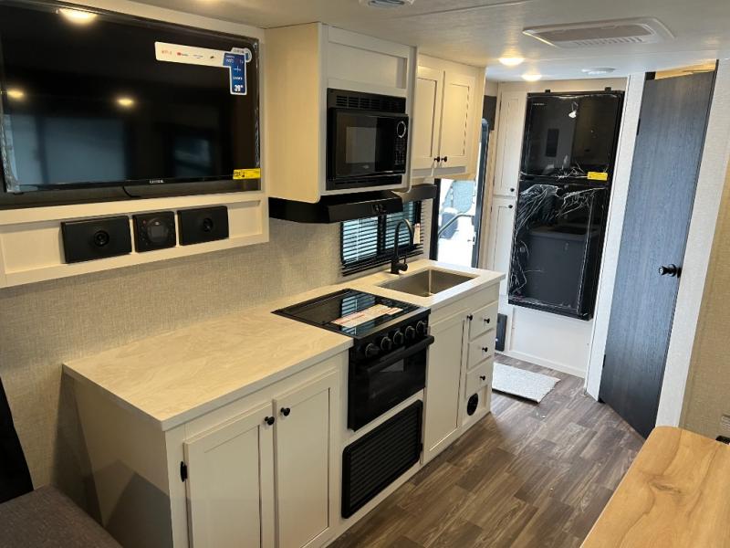 This travel trailer is the perfect couple's getaway! It features a front queen bed with wardrobes on either side for your clothes, overhead cabinets, and a privacy curtain to draw at night. You can prepare your best meals with the three burner cooktop with a 17" oven, enjoy them at the L-sofa with a table which is conveniently across from the entertainment center that has a smart HDTV, and store any leftovers in the 10 cu. ft. refrigerator. The rear corner bathroom has a radius shower to freshen up in each morning, a medicine cabinet to store your toiletries, and a linen closet to keep your towels close.