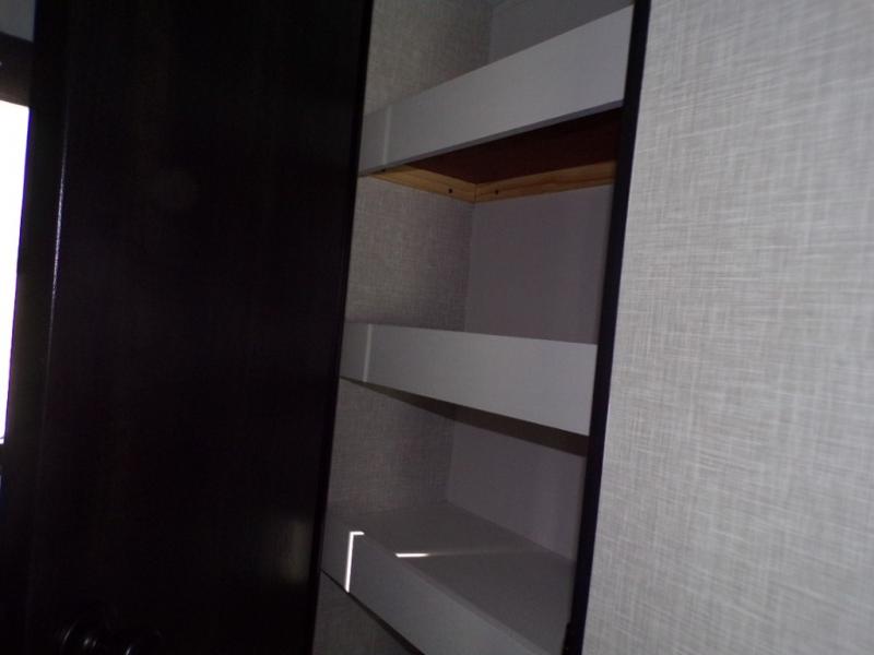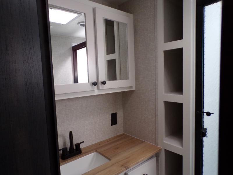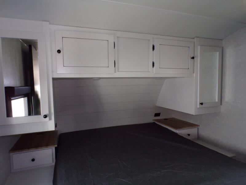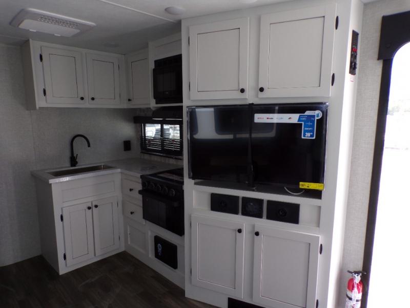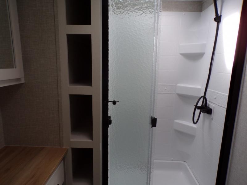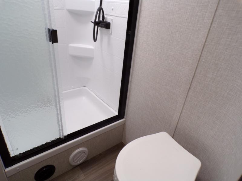 You will experience a smooth flow of traffic in and out of this unit with the dual entry doors! The rear living area has a tri-fold sofa by an entertainment center with a smart HDTV. You could even watch it from the U-shaped dinette while you play card games or enjoy meals, plus it can transform into an extra sleeping space if needed. The full bathroom has a shower to freshen up in and a linen closet to keep your towel close. Inside the front private bedroom is a queen bed with underbed drawers, wardrobes on either side, an additional wardrobe to store your clothes, a laundry chute to keep your dirty clothes out of the way, and even an entrance/exit door for your convenience!