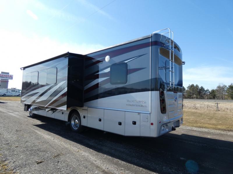 Escape the boring for fun trips in a Vacationer Class A gas motorhome by Holiday Rambler. You can easily make this coach your home-away-from home with features such as dual A/C units, vinyl tile flooring, and stainless steel appliances. The bus-style luggage doors will make for easy unloading, and the four-point fully automatic hydraulic leveling jacks make setting up camp easier than ever. The Vacationer is constructed with a Powerlock System with interlocking floor, walls, and roof, plus premium gel exterior Vetrosina fiberglass skin with no wood substrate for added durability. Each model includes an automotive style dash with dual monitors, a dash stereo with CarPlay and front speakers, and standard traction control for added safety. The list of standard features doesn't stop there. You'll have an environmentally friendly 100W solar panel, an exterior entertainment center, a powerful 7.3L 350 HP engine, and so much more!