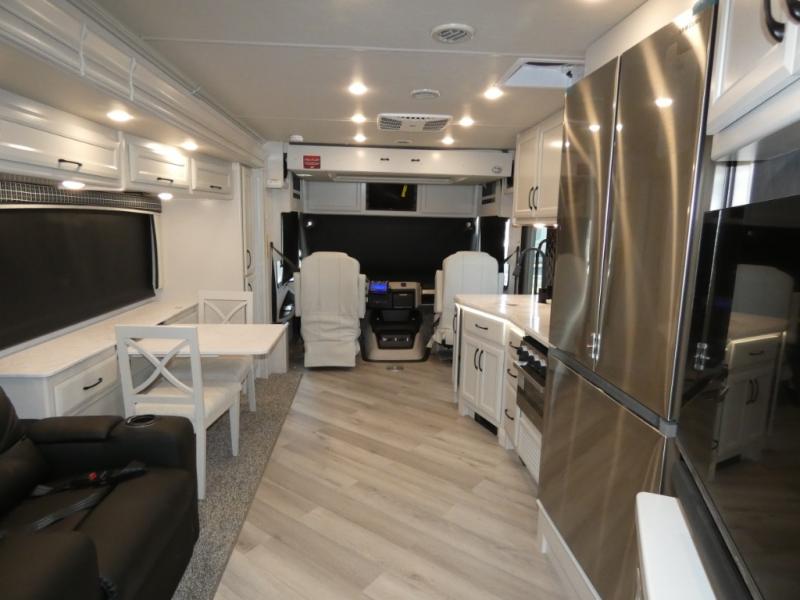 This double slide out coach will meet your needs perfectly on every family vacation. There is a Rest EZ booth dinette and theater seats in the main living area, plus a fireplace with an LED TV to make it feel a little more like home. You can prepare meals on the three burner cooktop, and leftovers can go in the stainless steel residential refrigerator. You're going to love the spacious full bath that includes a shower with a seat, a skylight, plus a medicine cabinet with a mirror.