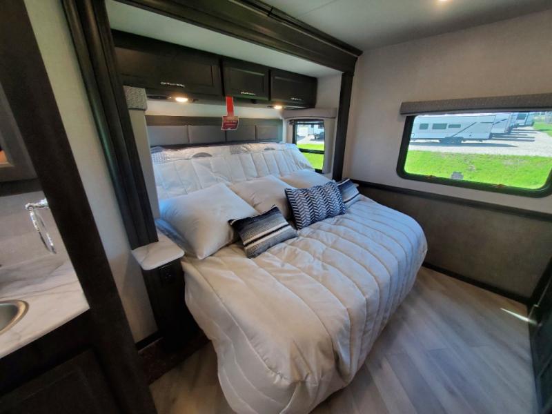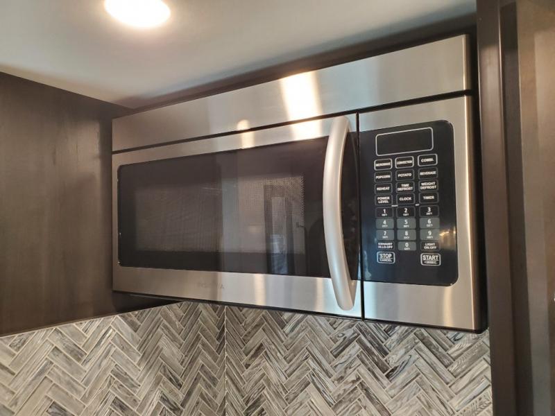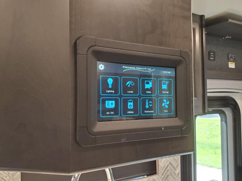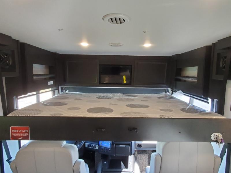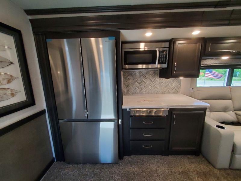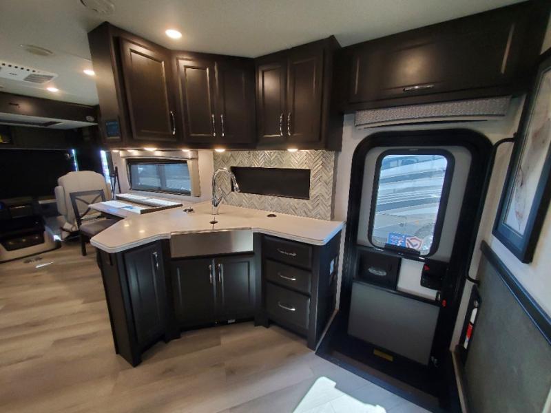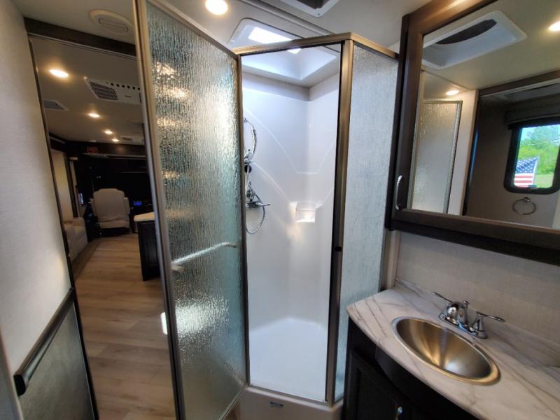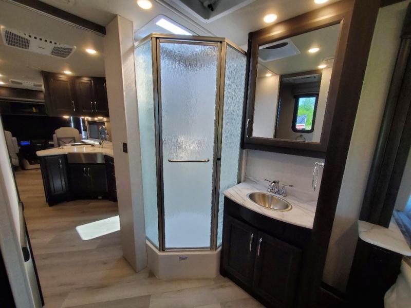 This coach will be perfect for trips across the states or to your local campground. You'll enjoy relaxing on the swivel captain's seats or on the jack-knife sofa, plus there is an Adap-Table dinette table to dine together. The kitchen is any chef's dream with its stainless steel residential refrigerator, over-the-range convection microwave, plus solid surface countertops. The private toilet and sink is right across the hall from the shower and second bath sink, and this room can be closed off completely if you want one big bathroom. And at the end of the day you can relax in the rear bedroom that includes a king bed slide out, dual dressers, and dual wardrobes to keep your things tidy. If you're needing more sleeping space, just add the optional Hide-A-Loft power drop-down overhead bunk, complete with an LED TV!