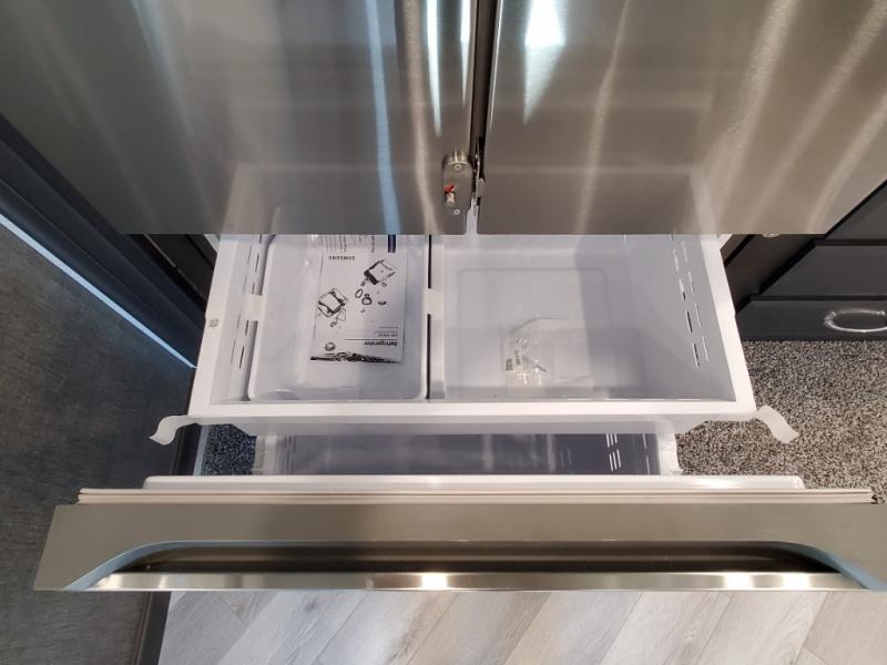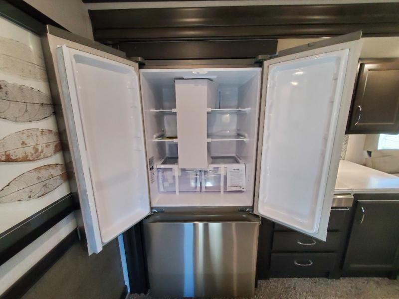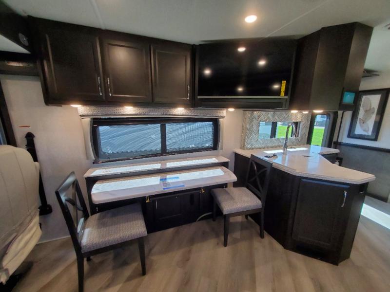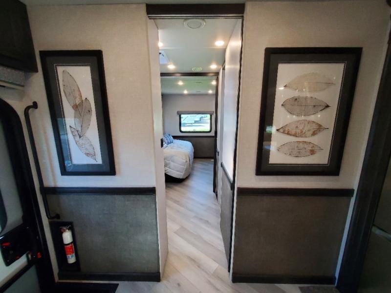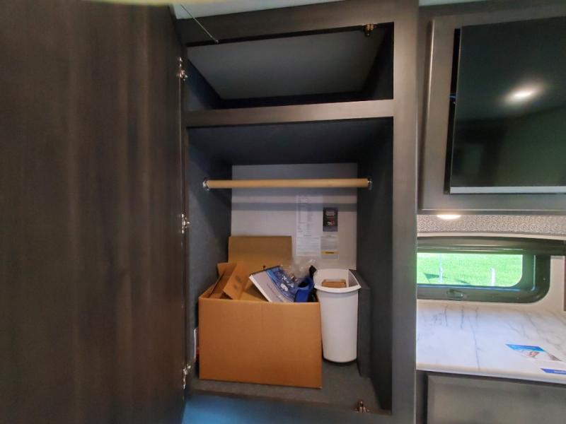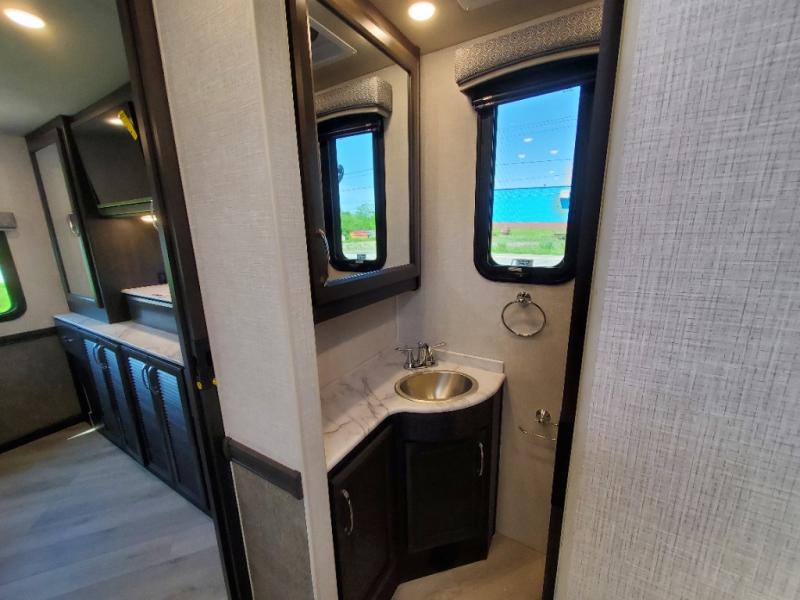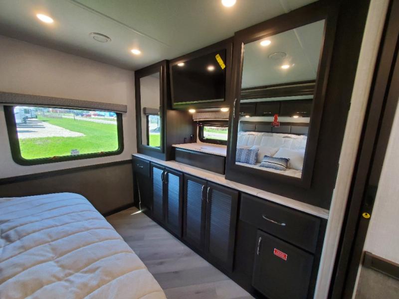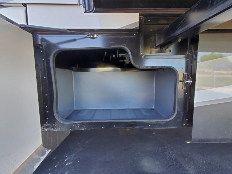 This coach will be perfect for trips across the states or to your local campground. You'll enjoy relaxing on the swivel captain's seats or on the jack-knife sofa, plus there is an Adap-Table dinette table to dine together. The kitchen is any chef's dream with its stainless steel residential refrigerator, over-the-range convection microwave, plus solid surface countertops. The private toilet and sink is right across the hall from the shower and second bath sink, and this room can be closed off completely if you want one big bathroom. And at the end of the day you can relax in the rear bedroom that includes a king bed slide out, dual dressers, and dual wardrobes to keep your things tidy. If you're needing more sleeping space, just add the optional Hide-A-Loft power drop-down overhead bunk, complete with an LED TV!