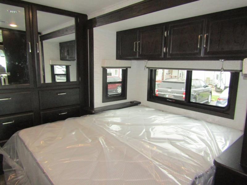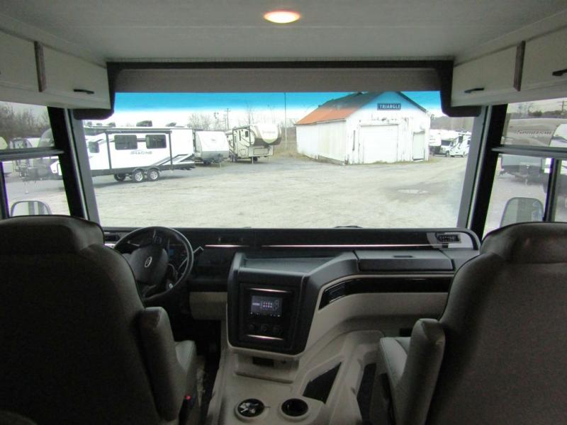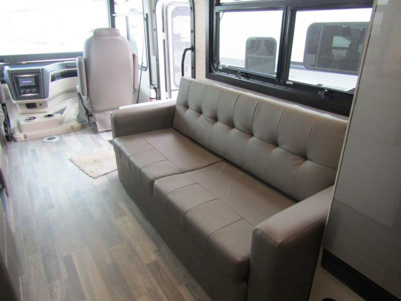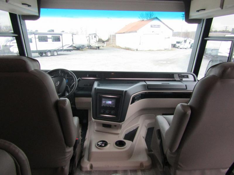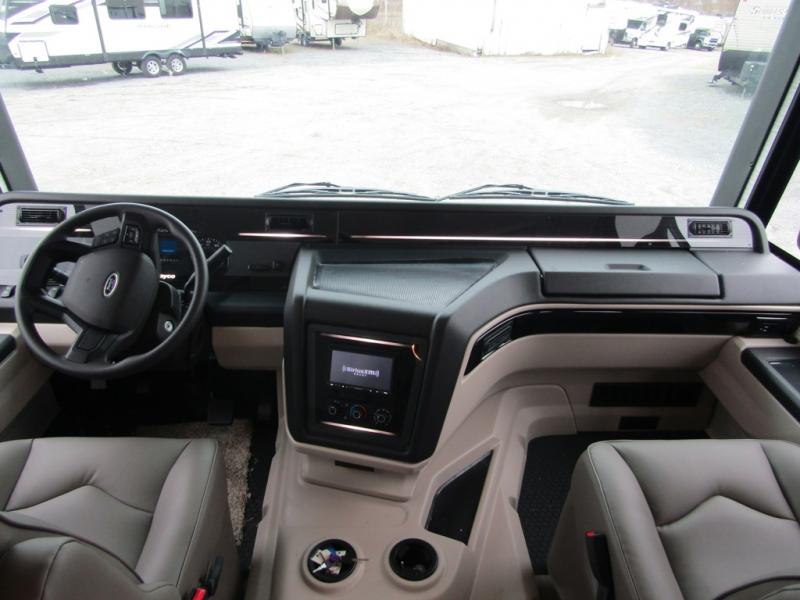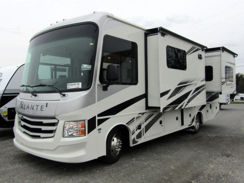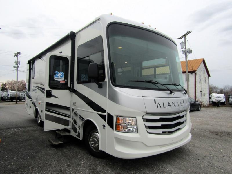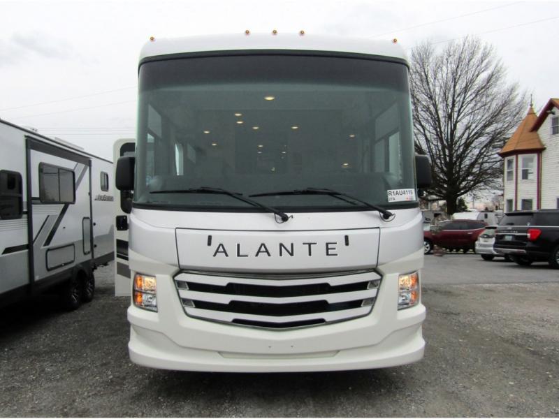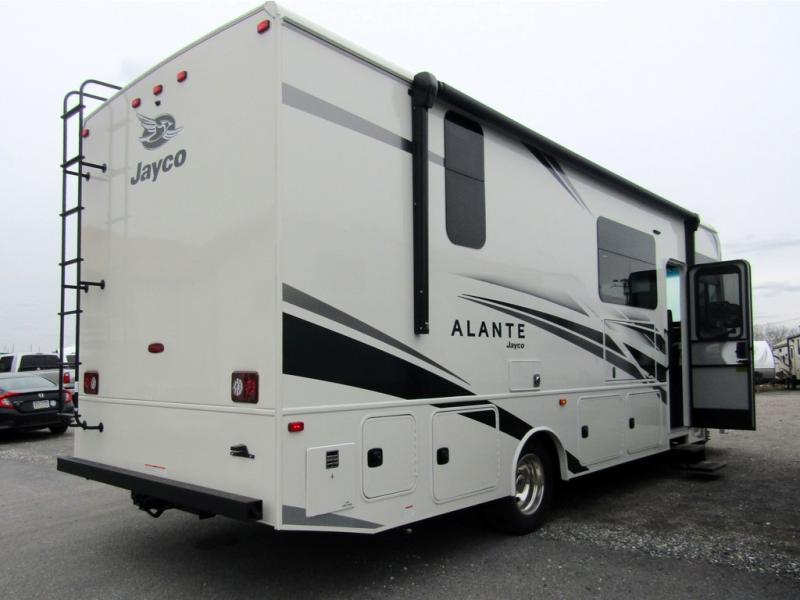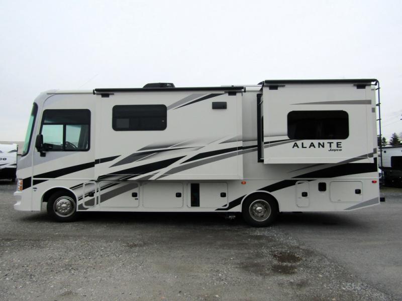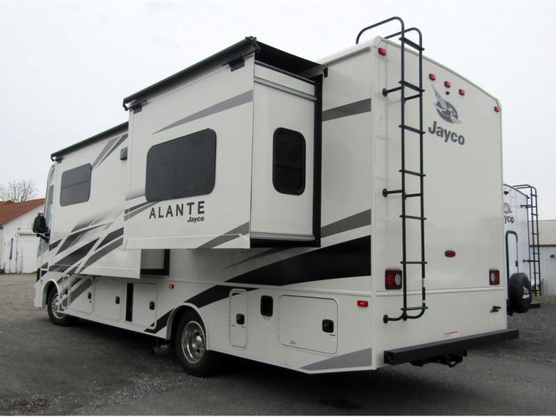 With any Alante Class A gas motorhome by Jayco, the mandatory Customer Value package provides JRide technology with a computer-balanced driveshaft ensuring smooth and efficient power transfer to the wheels, the Bilstein steering stabilizer, and SACHS shock absorbers offering independent adjustments to the road conditions, plus a one-piece, seamless, crowned fiberglass roof, and an exterior entertainment center to watch shows and movies. The automatic hydraulic leveling jacks, the 120 in. panoramic windshield, the 200W solar panel, the entrance door with industry's largest travel-view window, and the electric-powered entrance step will make traveling that much easier. And the interior equipment includes a Sony infortainment center with Apple CarPlay and Android Auto, a backup and side-view cameras for easy parking, and a 6-way power driver seat for comfortable and safe driving, plus a power front privacy shade with manual side privacy shades, LED-lit hardwood fascia and countertops, a pop-up charging station in the kitchen and a USB port and wireless charging in the nightstands.