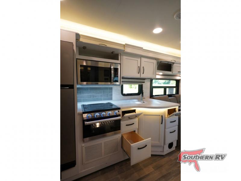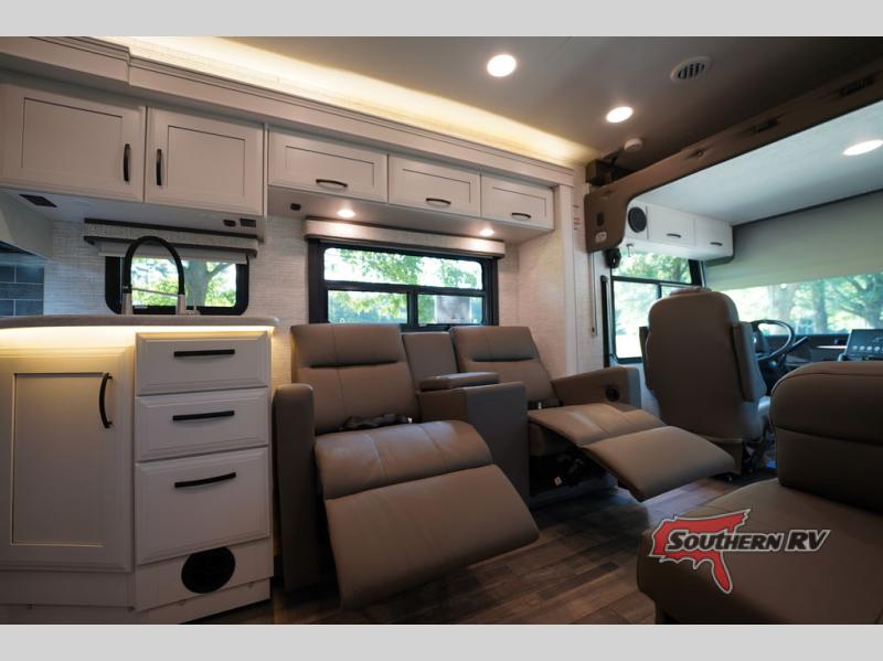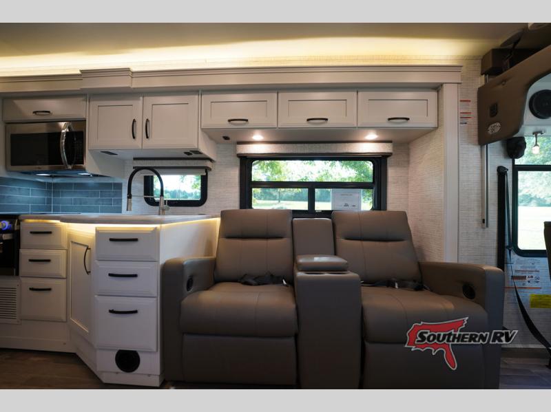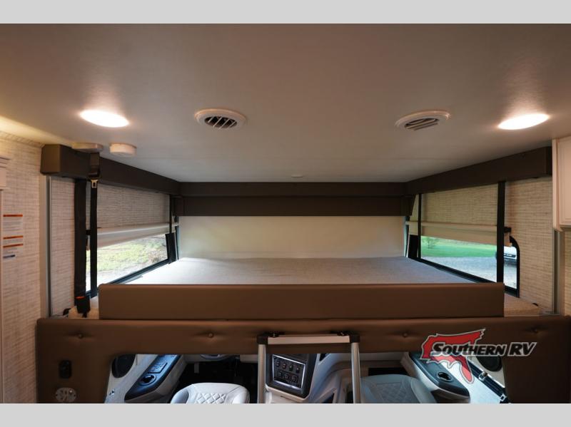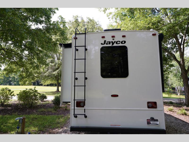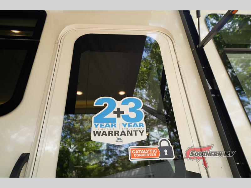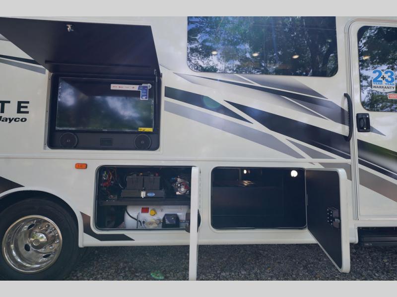 Travel to see new places and enjoy interior comforts as well as outdoor entertainment with this coach! After easily setting up the 23' electric awning you can relax and unwind while taking in the scenery or watching the the exterior LED HD Smart TV. The chef can utilize the outside kitchen or the full kitchen amenities inside such as a 10 cu. ft. refrigerator, the Furrion all-in-one cooktop and oven, plus a residential-size microwave. There is even a pop-up charging center. Enjoy privacy in the rear bedroom while you sleep on the walk-around queen bed, and add the TV option if you like. You will find seating in the main area on the Jayco-exclusive easy-operation legless dinette table and the jack-knife sofa, or choose the theater seating option. The cockpit table also gives you another surface to place your things while you sit in the driver and passenger seats that swivel. If you're needing additional sleeping space, just choose the drop-down overhead bunk option!