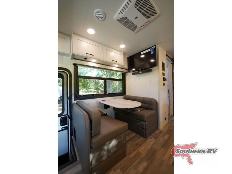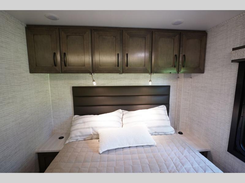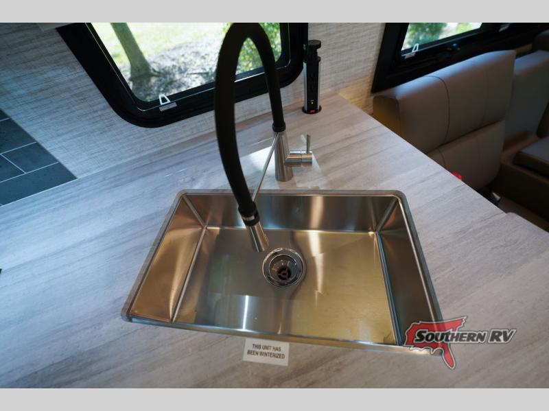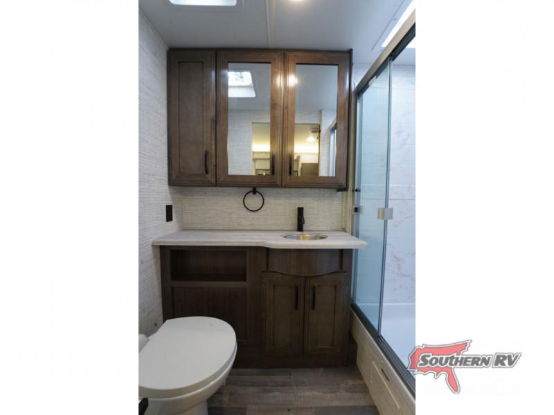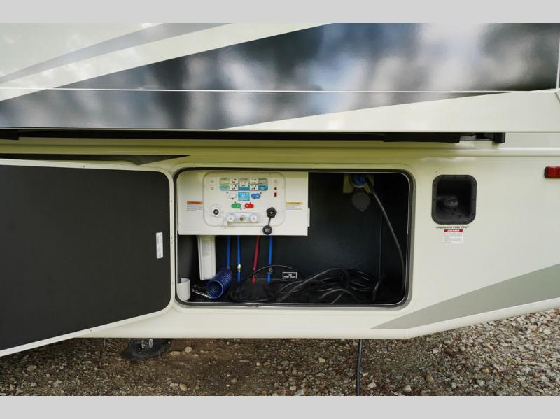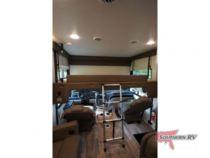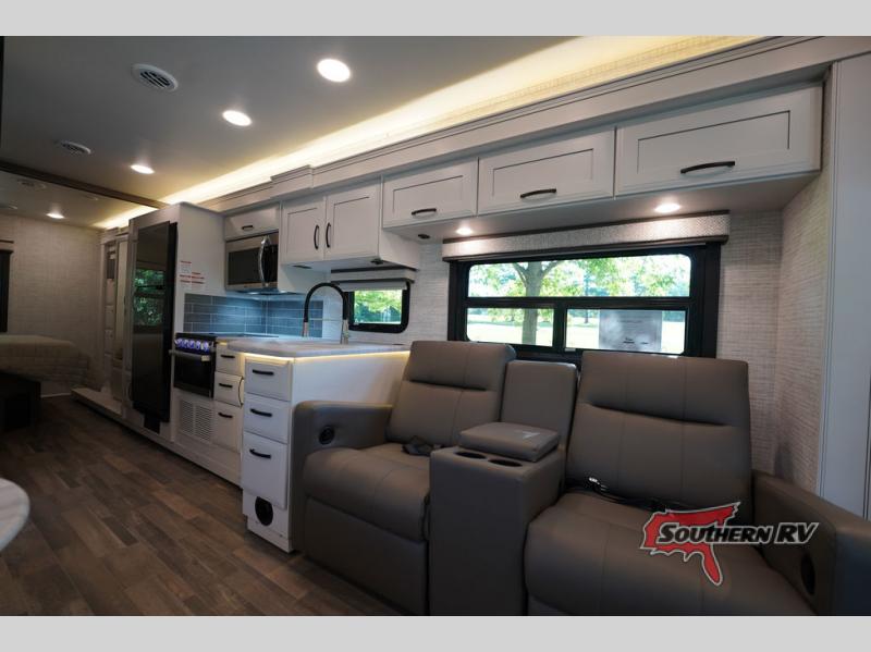 Travel to see new places and enjoy interior comforts as well as outdoor entertainment with this coach! After easily setting up the 23' electric awning you can relax and unwind while taking in the scenery or watching the the exterior LED HD Smart TV. The chef can utilize the outside kitchen or the full kitchen amenities inside such as a 10 cu. ft. refrigerator, the Furrion all-in-one cooktop and oven, plus a residential-size microwave. There is even a pop-up charging center. Enjoy privacy in the rear bedroom while you sleep on the walk-around queen bed, and add the TV option if you like. You will find seating in the main area on the Jayco-exclusive easy-operation legless dinette table and the jack-knife sofa, or choose the theater seating option. The cockpit table also gives you another surface to place your things while you sit in the driver and passenger seats that swivel. If you're needing additional sleeping space, just choose the drop-down overhead bunk option!