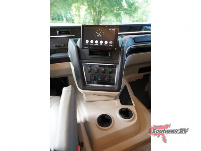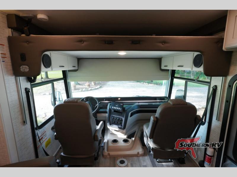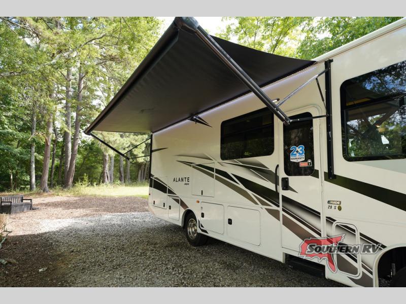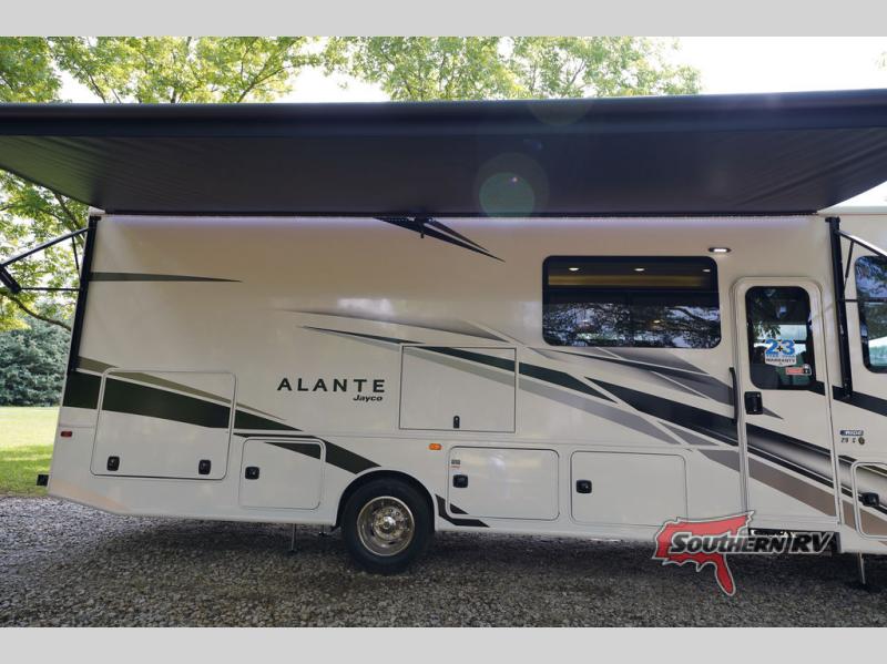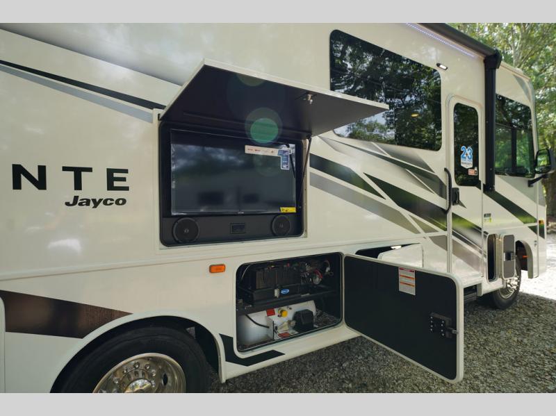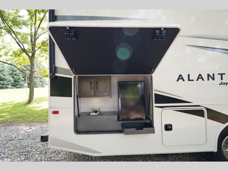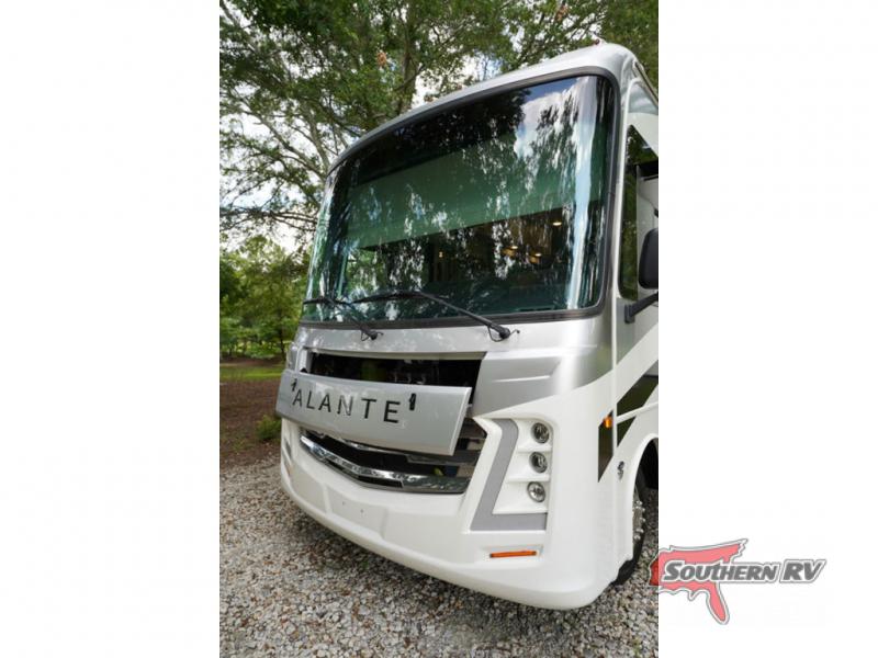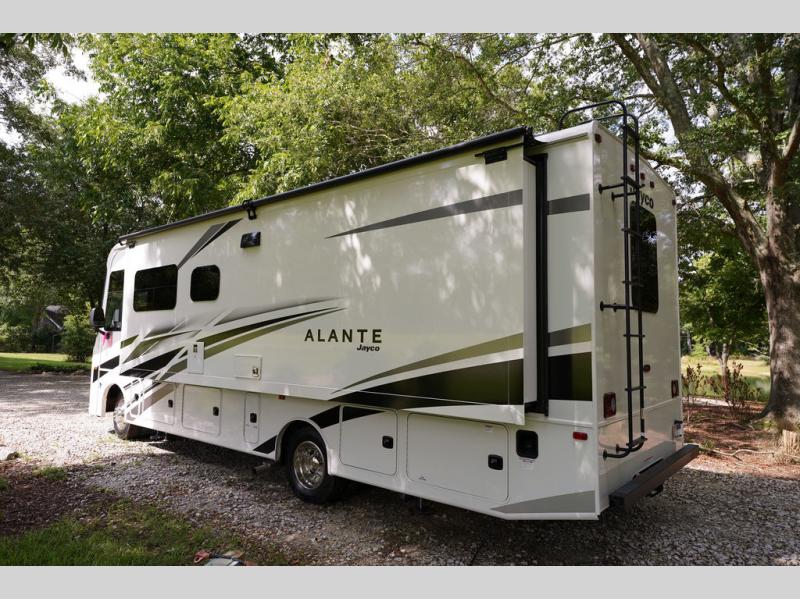 With any Alante Class A gas motorhome by Jayco, the mandatory Customer Value package provides JRide technology with a computer-balanced driveshaft ensuring smooth and efficient power transfer to the wheels, and SACHS shock absorbers offering independent adjustments to the road conditions. There is also a one-piece, seamless, crowned fiberglass roof, and an exterior entertainment center to watch shows and movies. The automatic hydraulic leveling jacks, 120 in. panoramic windshield, 200W solar panel, and the electric-powered entrance step will make traveling that much easier. And the interior equipment includes a Sony infotainment center with Apple CarPlay and Android Auto, a backup and side-view cameras for easy parking, plus a 6-way power driver seat for comfortable and safe driving. You will also love the power front privacy shade with manual side privacy shades, LED-lit hardwood fascia and countertops, a pop-up charging station in the kitchen and a USB port and wireless charging in the nightstands.