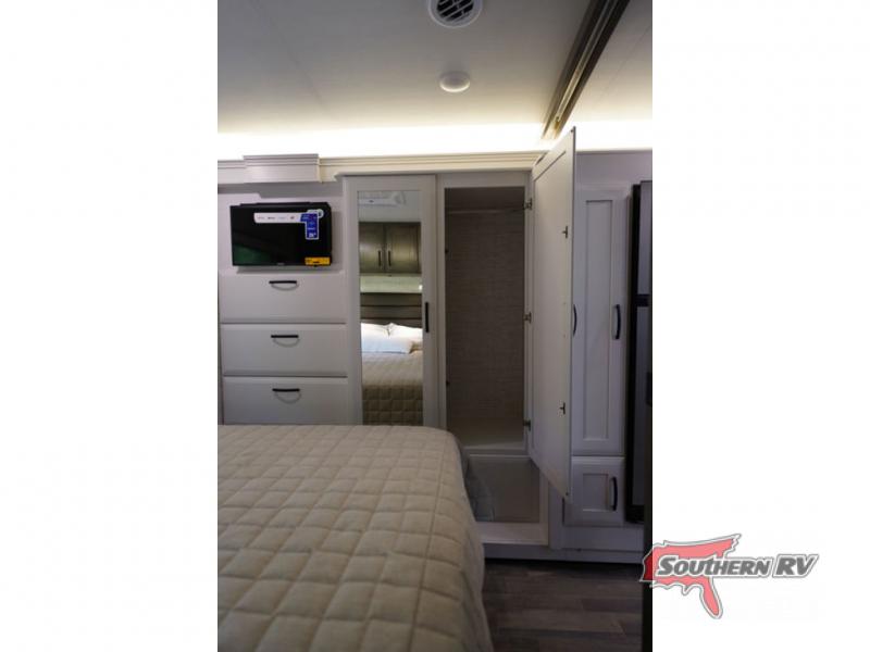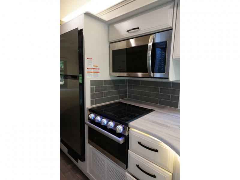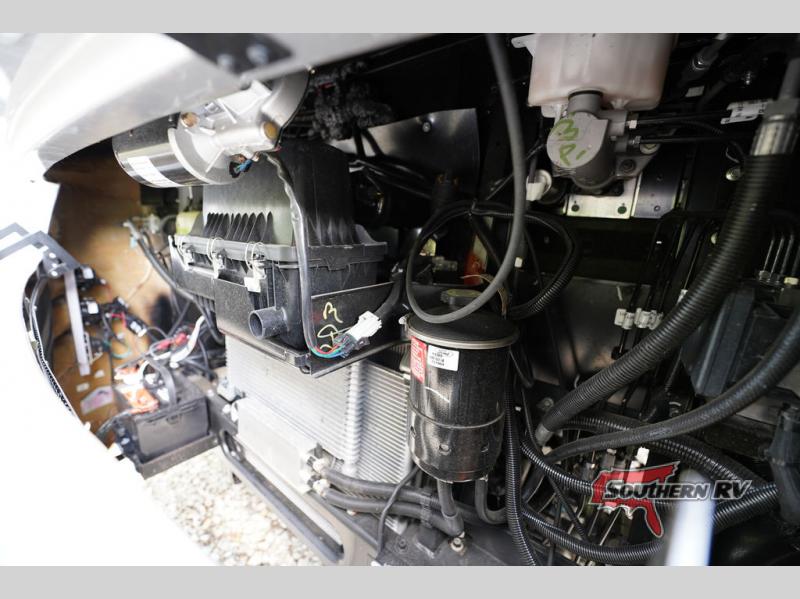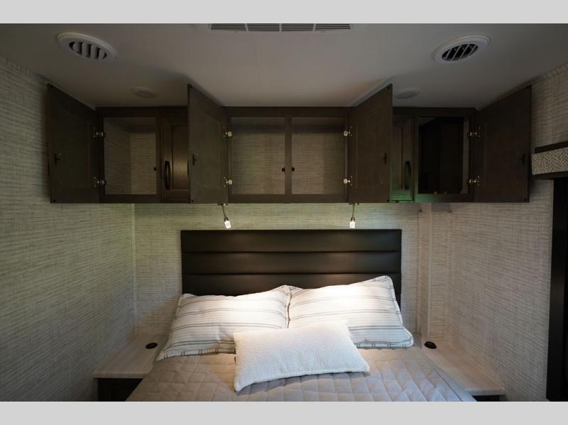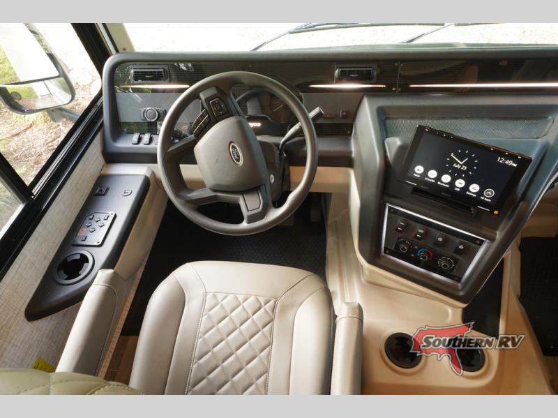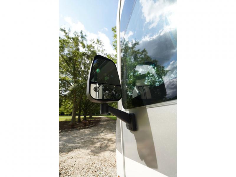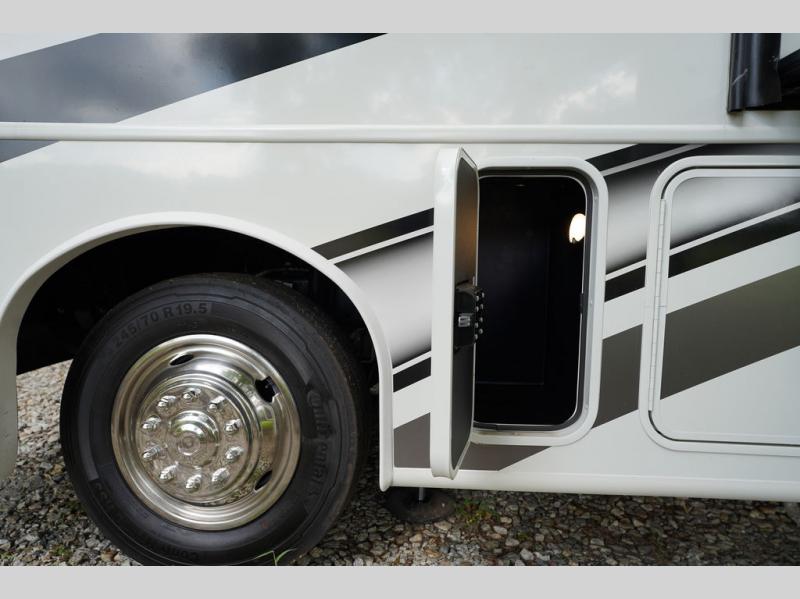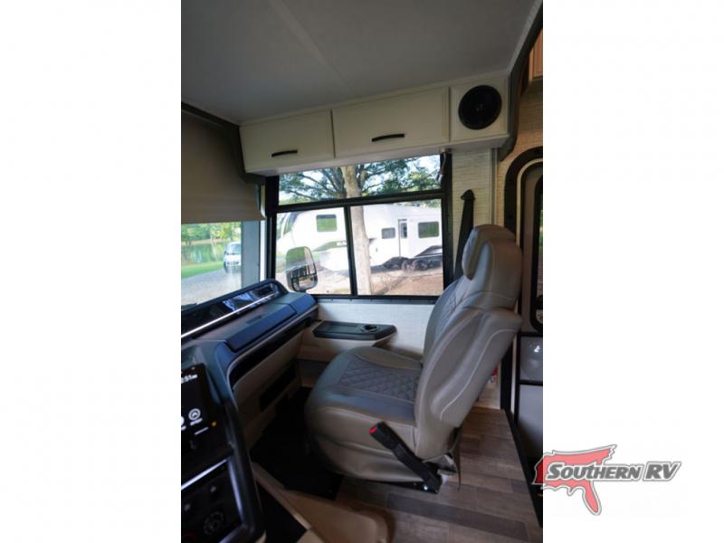 With any Alante Class A gas motorhome by Jayco, the mandatory Customer Value package provides JRide technology with a computer-balanced driveshaft ensuring smooth and efficient power transfer to the wheels, and SACHS shock absorbers offering independent adjustments to the road conditions. There is also a one-piece, seamless, crowned fiberglass roof, and an exterior entertainment center to watch shows and movies. The automatic hydraulic leveling jacks, 120 in. panoramic windshield, 200W solar panel, and the electric-powered entrance step will make traveling that much easier. And the interior equipment includes a Sony infotainment center with Apple CarPlay and Android Auto, a backup and side-view cameras for easy parking, plus a 6-way power driver seat for comfortable and safe driving. You will also love the power front privacy shade with manual side privacy shades, LED-lit hardwood fascia and countertops, a pop-up charging station in the kitchen and a USB port and wireless charging in the nightstands.