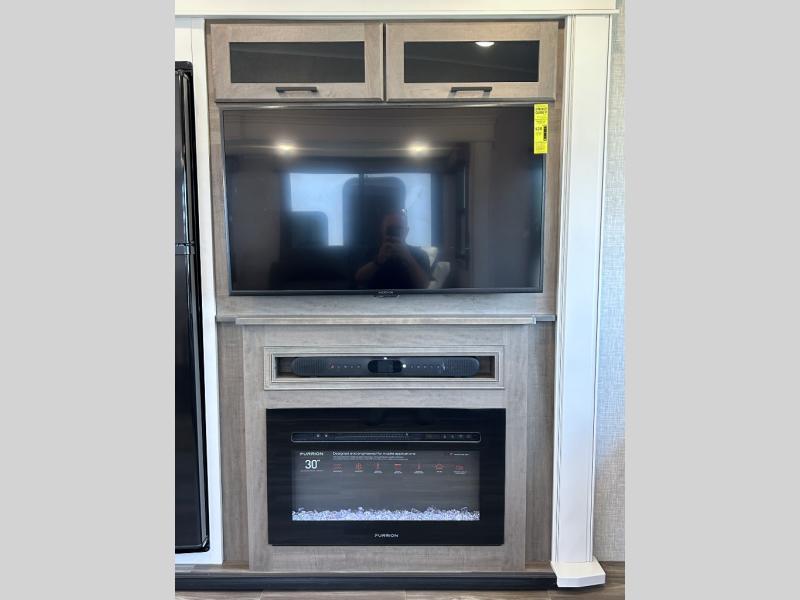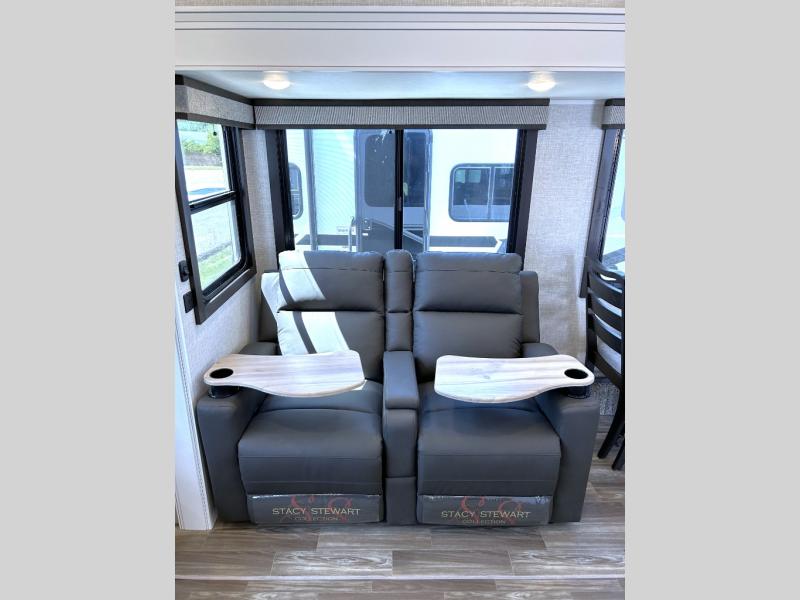 With Kitchen Island, Front Private Queen Bedroom w/ Wardrobe Slide, Dual Entry Bathroom, Entertainment Center, Fireplace, Pantry, Tri-Fold Sofa, Theater Seats w/ Tray Tables and Table & Chairs