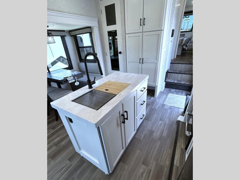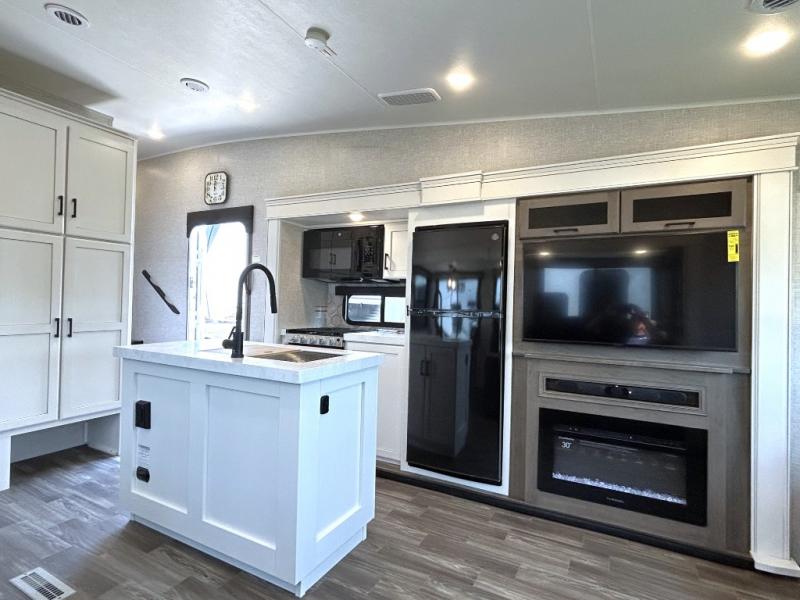 Don't pass up your chance to camp in true comfort with this fifth wheel! It features a rear living area with a tri-fold sofa for an afternoon nap and theater seating across from the entertainment center with a fireplace. The chef can choose to either prepare their meals indoors with the kitchen island and the three burner stainless steel range or at the outside kitchen with a refrigerator to enjoy a cold beverage while cooking. Hang your coats in the entry wardrobe and store your canned goods in the kitchen pantry. The dual entry bathroom has a radius shower to clean up in and is easy to access, especially those staying in the front private bedroom. The bedroom also has a wardrobe slide with a dresser and linen closet, as well as wardrobes on either side of the queen bed!