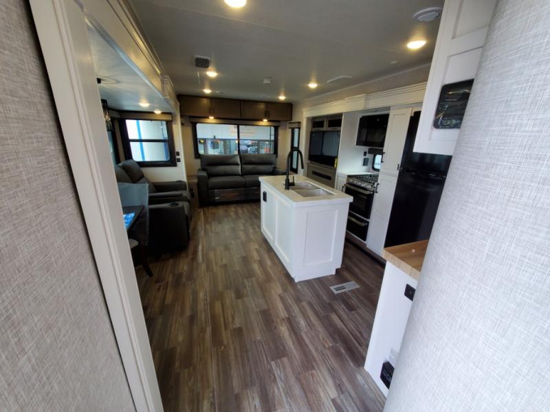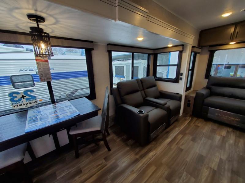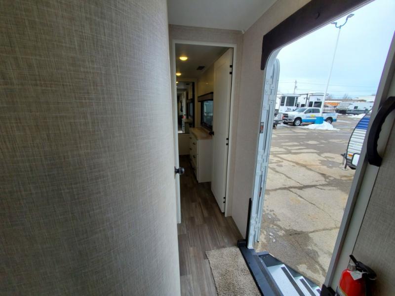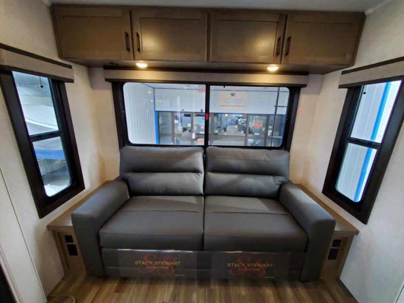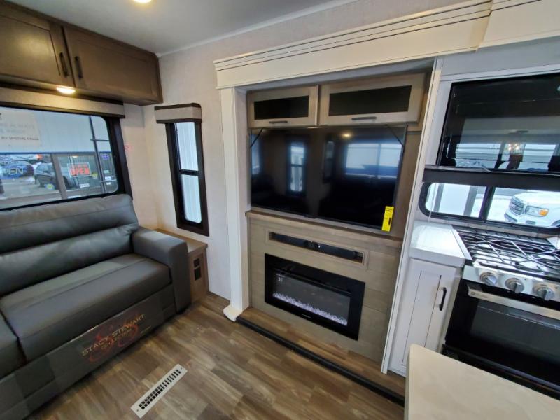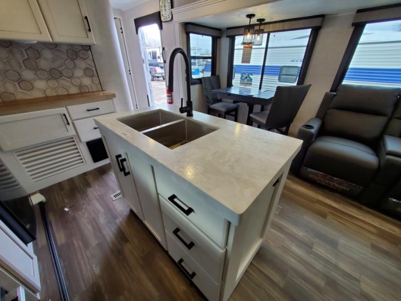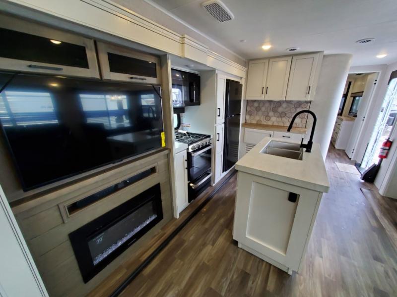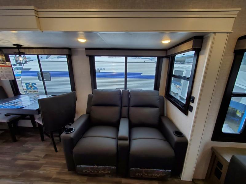 You will feel right at home camping in this travel trailer! It features a front private bedroom with a queen bed slide for more interior space, a dresser, a front wardrobe to hang your clothes, and a wardrobe that is prepped to add an optional washer and dryer. Start each morning getting squeaky clean in the full bathroom with the shower and then head to the kitchen to fry up some eggs on the stainless steel range. The kitchen island will help make meal prepping easier too, plus there is a hutch to store your dishes. Enjoy a relaxing evening by the fireplace and watch your favorite movie with the entertainment center while sitting on either the rear tri-fold sofa or the theater seating!