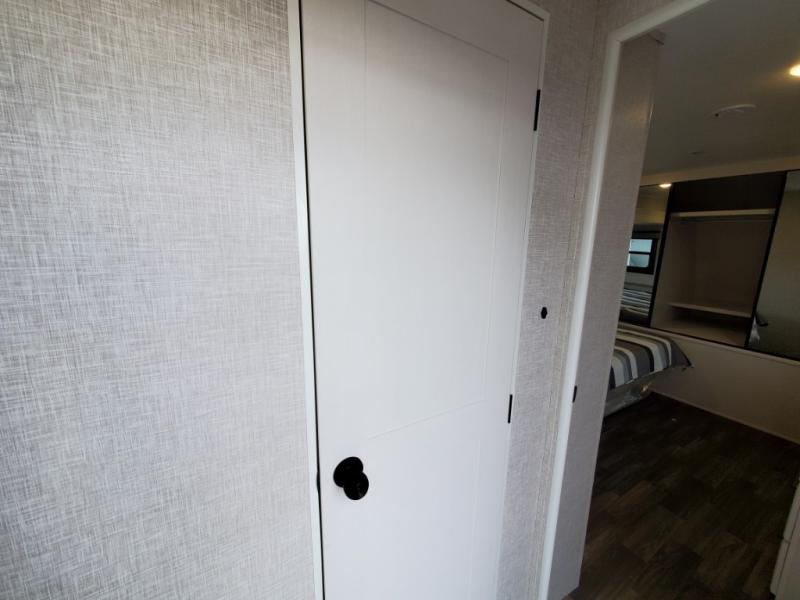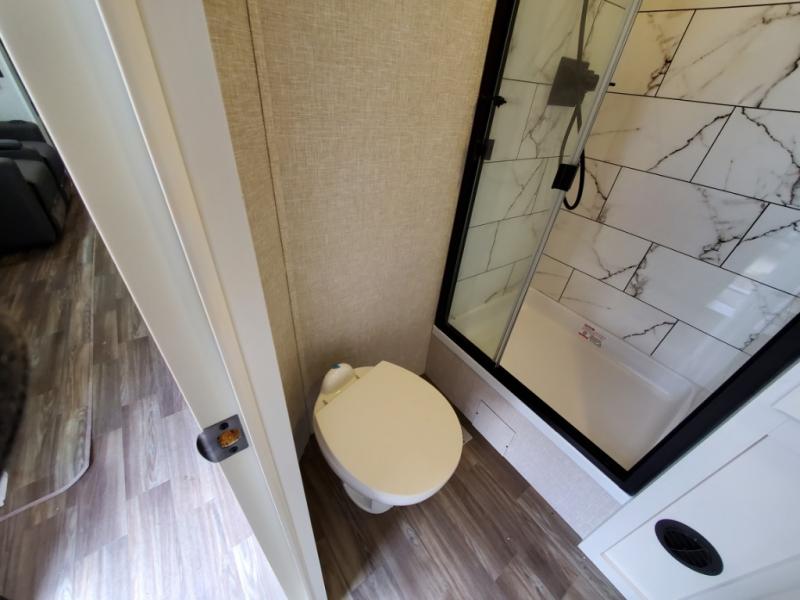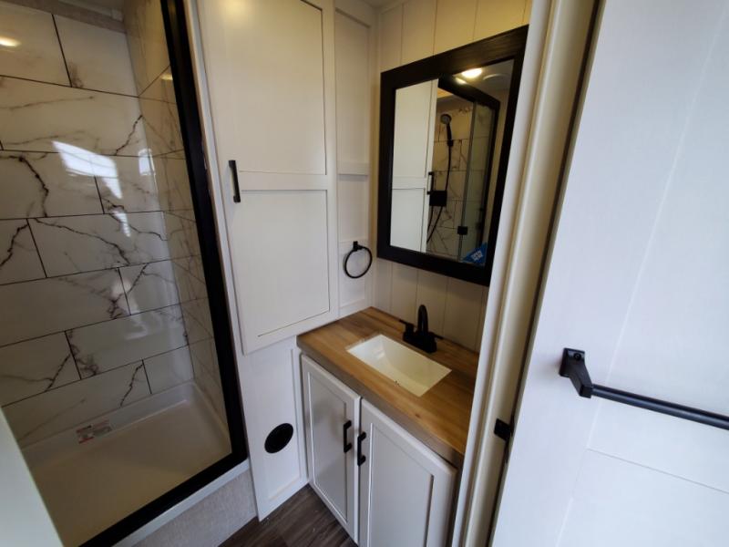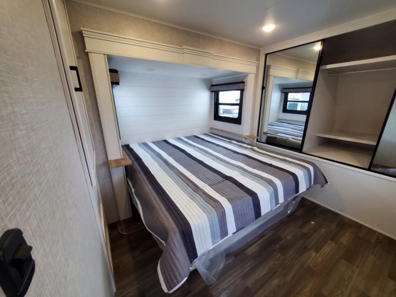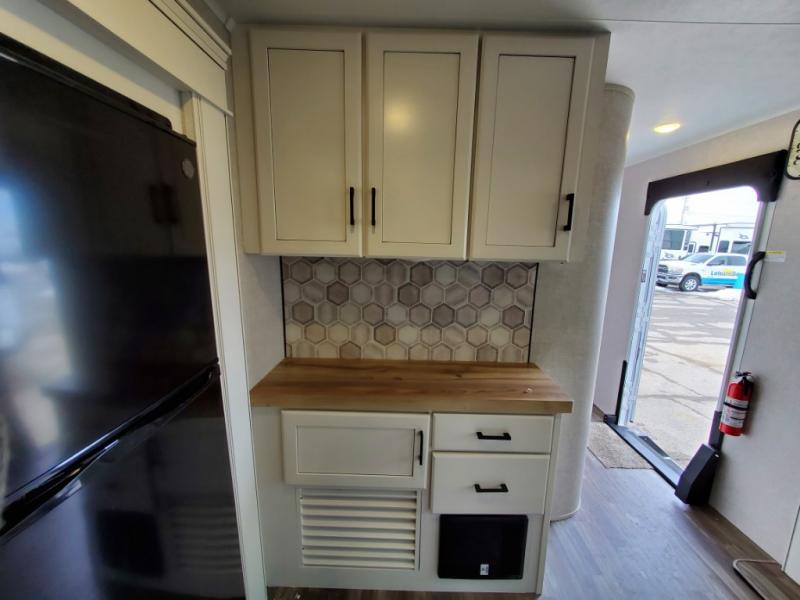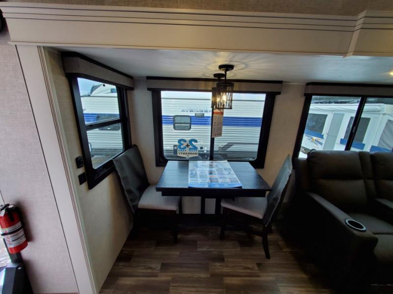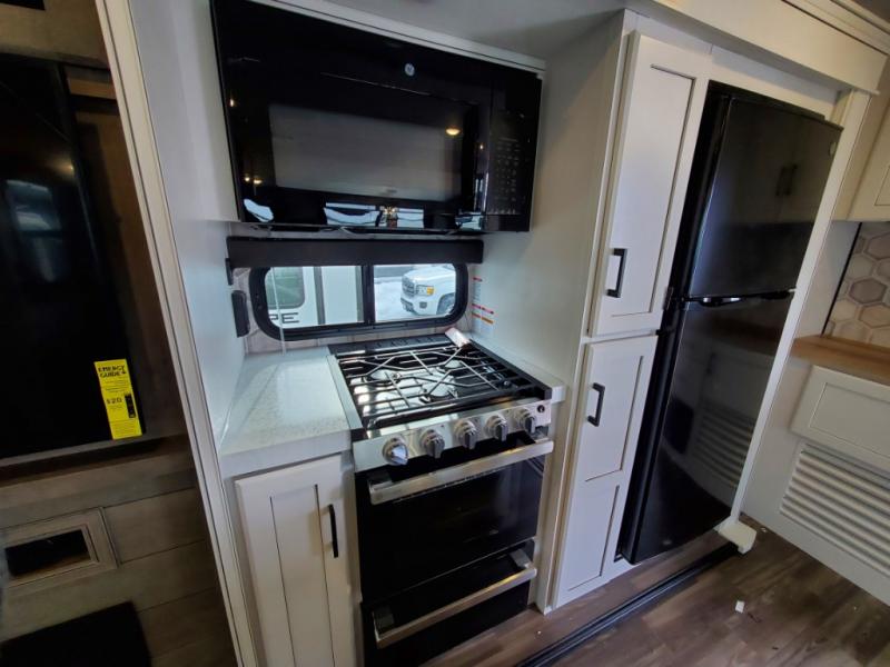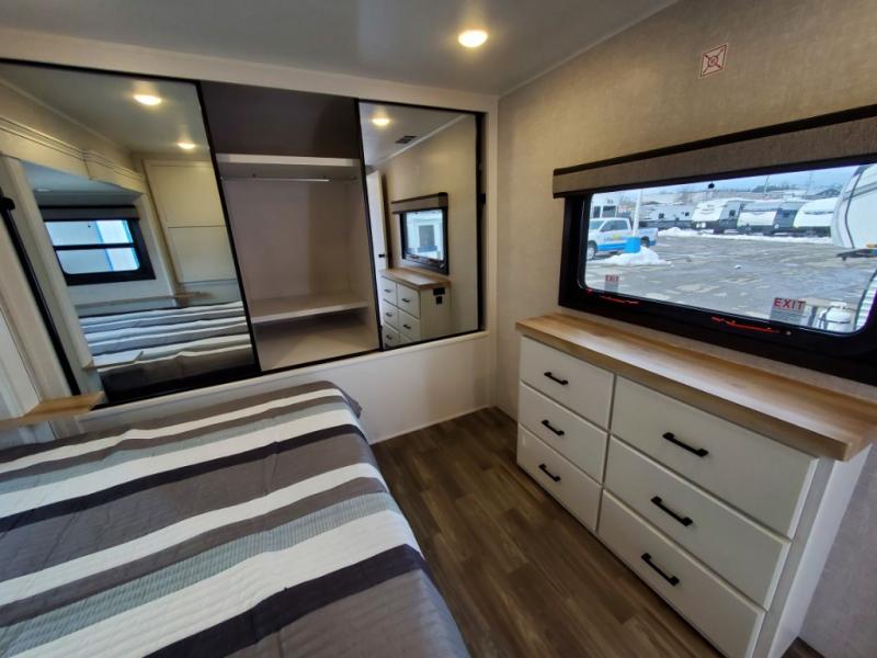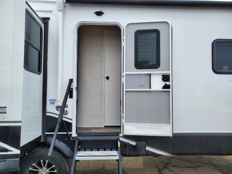 You will feel right at home camping in this travel trailer! It features a front private bedroom with a queen bed slide for more interior space, a dresser, a front wardrobe to hang your clothes, and a wardrobe that is prepped to add an optional washer and dryer. Start each morning getting squeaky clean in the full bathroom with the shower and then head to the kitchen to fry up some eggs on the stainless steel range. The kitchen island will help make meal prepping easier too, plus there is a hutch to store your dishes. Enjoy a relaxing evening by the fireplace and watch your favorite movie with the entertainment center while sitting on either the rear tri-fold sofa or the theater seating!