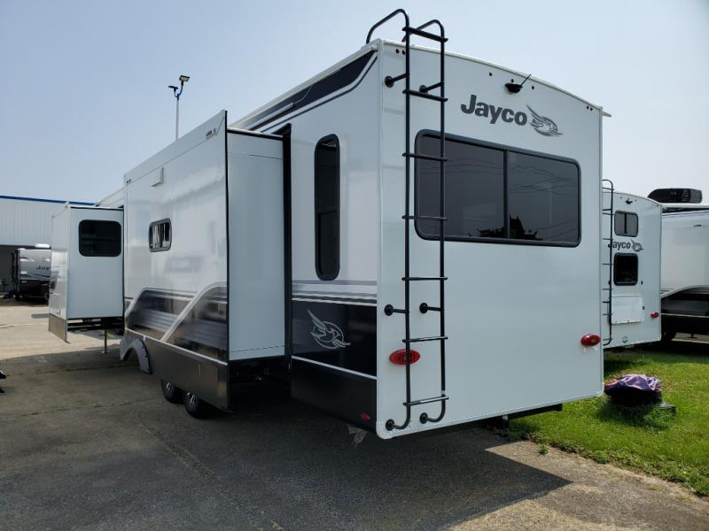 With any Eagle fifth wheel or travel trailer by Jayco you will appreciate durable construction materials, like the Magnum Truss Roof and the Stronghold VBL laminated walls. The JAYCOMMAND Smart RV system puts you in control of your RV's functions, and the 5 Star Handling Package will provide smooth towing from home to camp. Each model features Climate Shield zero-degree tested weather protection and the industry-exclusive HELIX cooling system that will keep you comfortable year around. Some of the exterior conveniences you are sure to love are the pass-through storage with Slam-Latch baggage doors and an automotive style front cap with max turn radius. The Eagle fifth wheels and travel trailers are designed to make you feel at home with solid hardwood slide fascia, residential vinyl flooring, a bathroom skylight, and plenty of storage for all your belongings. Visit Leisure Days RV in Smiths Falls to inspect this unit and many more!