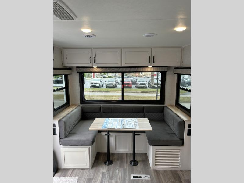 Wherever you decide to camp, you can count on at-home comforts with this travel trailer in tow! The large slide out in the main living area will provide your crew with more space to relax, and here you'll find a theater sofa in perfect view of the 43" 4K Ultra LED HD Smart TV. Once the chef of your group has prepared lunch on the three burner range, you can dine at the U-shaped dinette that will also double as your guests sleeping space at night. Up front, the private bedroom awaits you with a queen bed, dual wardrobes plus a bedroom slide out with a dresser, linen closet, and a wardrobe. This model also includes a full bath and a wardrobe with washer and dryer prep that will give the option to add those appliances!