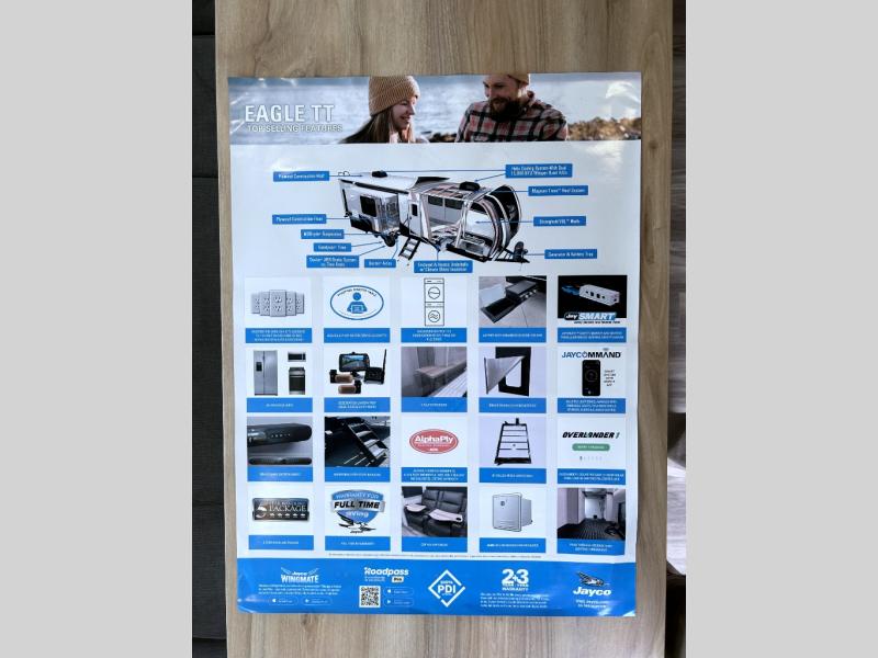 With any Eagle fifth wheel or travel trailer by Jayco you will appreciate durable construction materials, like the Magnum Truss Roof and the Stronghold VBL laminated walls. The JAYCOMMAND Smart RV system puts you in control of your RV's functions, and the 5 Star Handling Package will provide smooth towing from home to camp. Each model features Climate Shield zero-degree tested weather protection and the industry-exclusive HELIX cooling system that will keep you comfortable year around. Some of the exterior conveniences you are sure to love are the pass-through storage with Slam-Latch baggage doors and an automotive style front cap with max turn radius. The Eagle fifth wheels and travel trailers are designed to make you feel at home with solid hardwood slide fascia, residential vinyl flooring, a bathroom skylight, and plenty of storage for all your belongings.