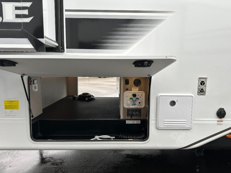 With any Eagle fifth wheel or travel trailer by Jayco you will appreciate durable construction materials, like the Magnum Truss Roof and the Stronghold VBL laminated walls. The JAYCOMMAND Smart RV system puts you in control of your RV's functions, and the 5 Star Handling Package will provide smooth towing from home to camp. Each model features Climate Shield zero-degree tested weather protection and the industry-exclusive HELIX cooling system that features two 15,000 BTU Whisper Quiet A/C's to keep you comfortable year around. Some of the exterior conveniences you are sure to love are the pass-through storage with Slam-Latch baggage doors and an automotive style front cap with max turn radius. The Eagle fifth wheels and travel trailers are designed to make you feel at home with solid hardwood slide fascia, residential vinyl flooring, a bathroom skylight, and plenty of storage for all your belongings.