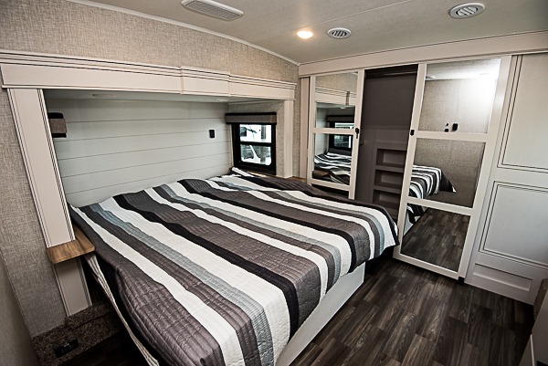 With any Eagle fifth wheel or travel trailer by Jayco you will appreciate durable construction materials, like the Magnum Truss Roof and the Stronghold VBL laminated walls. The JAYCOMMAND Smart RV system puts you in control of your RV's functions, and the 5 Star Handling Package will provide smooth towing from home to camp. Each model features Climate Shield zero-degree tested weather protection and the industry-exclusive HELIX cooling system that features two 15,000 BTU Whisper Quiet A/C's to keep you comfortable year around. Some of the exterior conveniences you are sure to love are the pass-through storage with Slam-Latch baggage doors and an automotive style front cap with max turn radius. The Eagle fifth wheels and travel trailers are designed to make you feel at home with solid hardwood slide fascia, residential vinyl flooring, a bathroom skylight, and plenty of storage for all your belongings.