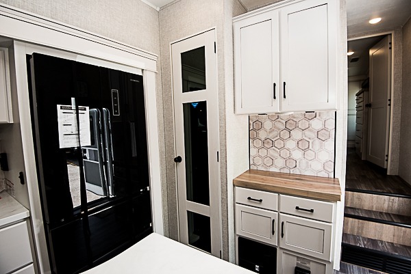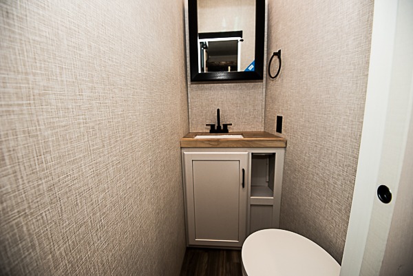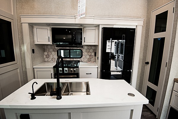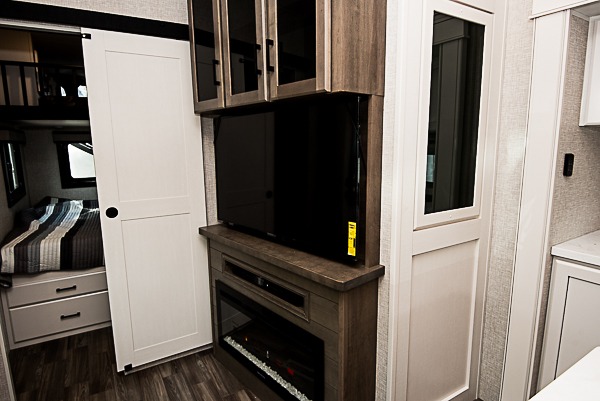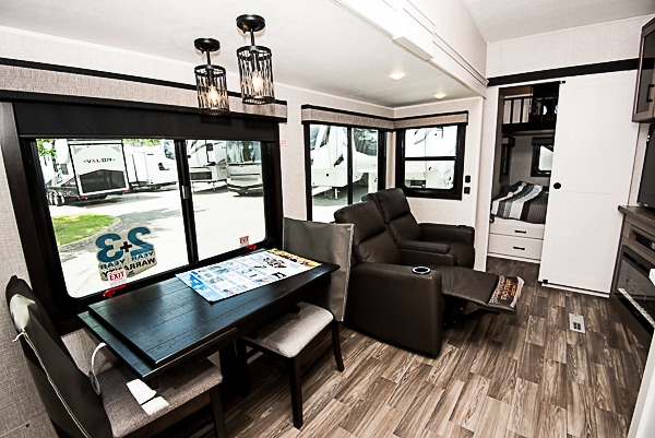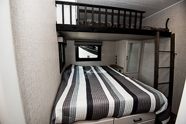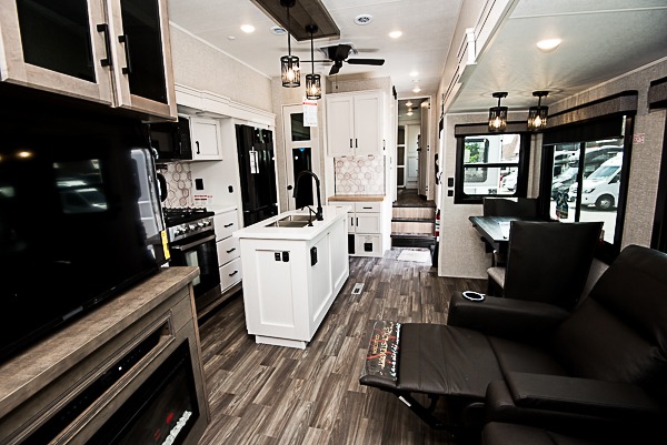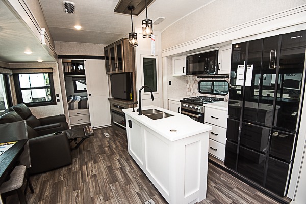 This fifth wheel is decked out in features you will love! The dual slides in the main living area create an open floorplan, and then there is a kitchen island that will make meal prepping easier. The theater seats and free standing table with chairs have a great view of the entertainment center and fireplace, and there is a ceiling fan here to keep the air moving. And did we mention there is an outside kitchen, complete with an outdoor refrigerator? This model also features a front private bedroom with a king bed, a chest, and a front closet with shelves and convenient washer and dryer prep. There is also a rear private bunkhouse that has a 54" x 74" upper bunk above a queen bed with wardrobe storage drawers, as well as its very own half bathroom!