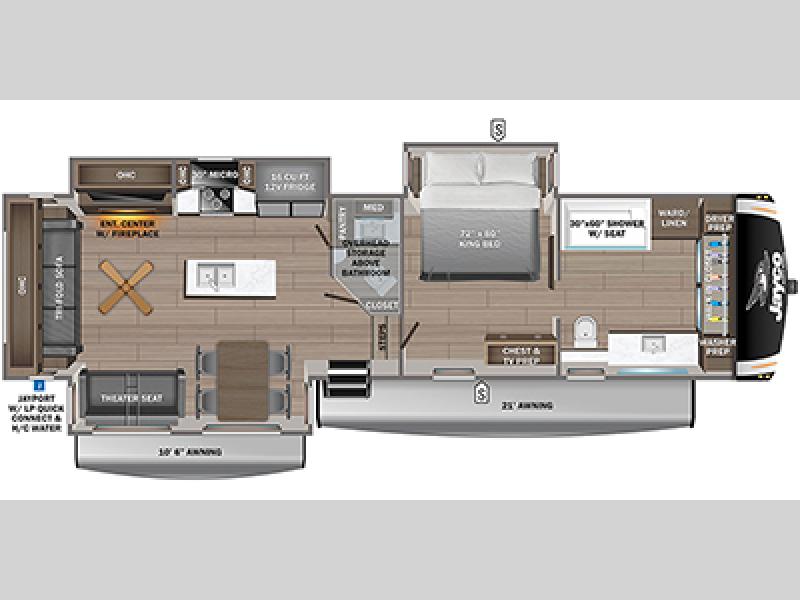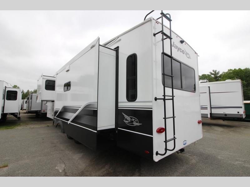 With any Eagle fifth wheel or travel trailer by Jayco you will appreciate durable construction materials, like the Magnum Truss Roof and the Stronghold VBL laminated walls. The JAYCOMMAND Smart RV system puts you in control of your RV's functions, and the 5 Star Handling Package will provide smooth towing from home to camp. Each model features Climate Shield zero-degree tested weather protection and the industry-exclusive HELIX cooling system that features two 15,000 BTU Whisper Quiet A/C's to keep you comfortable year around. Some of the exterior conveniences you are sure to love are the pass-through storage with Slam-Latch baggage doors and an automotive style front cap with max turn radius. The Eagle fifth wheels and travel trailers are designed to make you feel at home with solid hardwood slide fascia, residential vinyl flooring, a bathroom skylight, and plenty of storage for all your belongings.