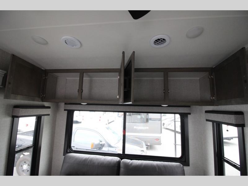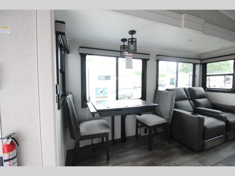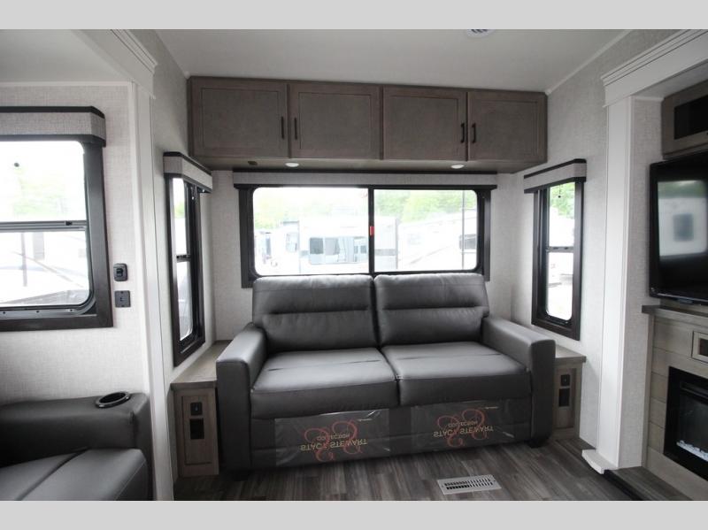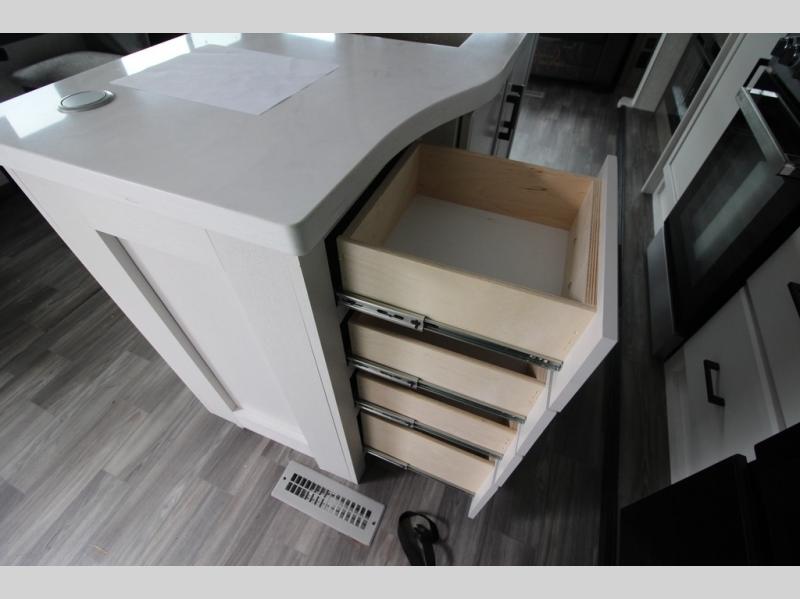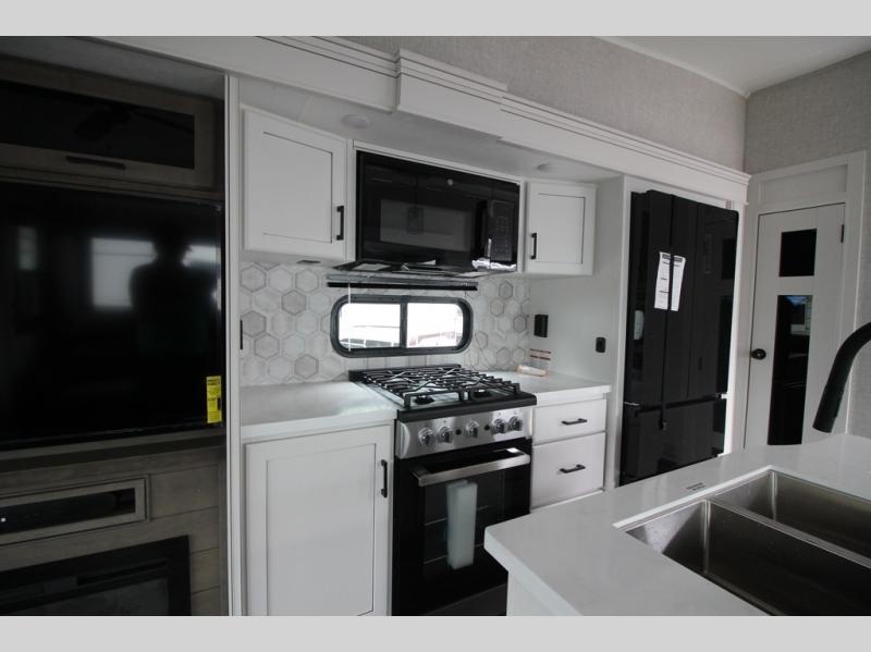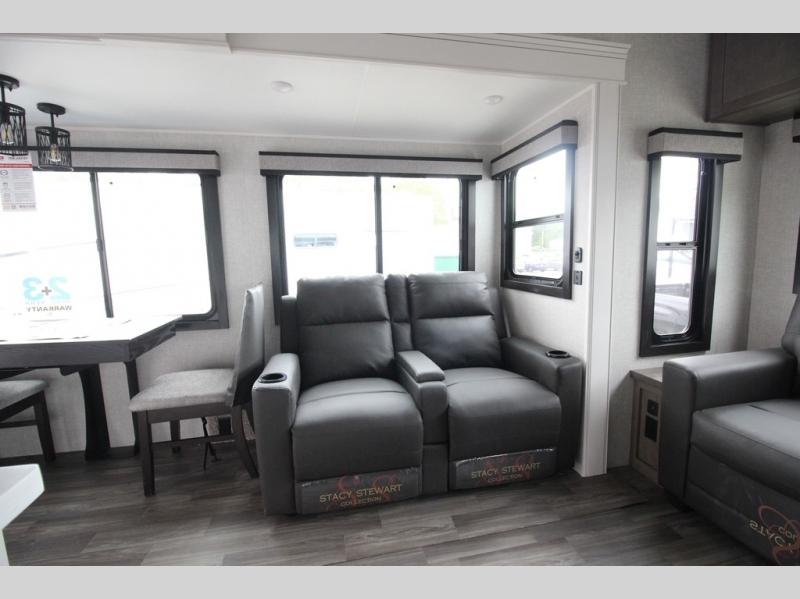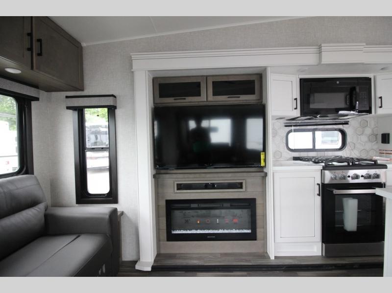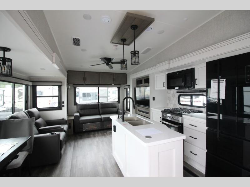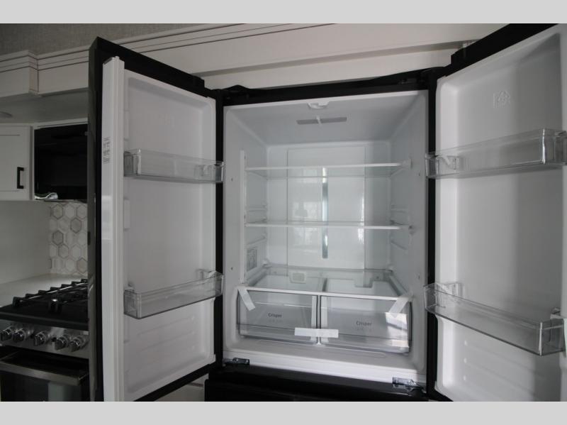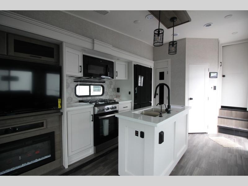 Enjoy a private bedroom suite in this fifth wheel! The king bed is positioned in a slide out for maximum room, and a sliding door leads to the front bath which is full of luxurious features. Enjoy a 30" x 60" shower with a seat. There's a walk-in front closet which has hanging space as well as prep for an optional washer and dryer. An additional wardrobe/linen closet provides some extra space. There's also a half-bath located off the kitchen, and that one has overhead storage also. You'll love the living area with its theater seats, tri-fold sofa, ceiling fan, and entertainment center with fireplace. The kitchen has a four-burner cooktop, center island with sink, 30" microwave oven over the range, and a 16 cu. ft. 12 volt refrigerator - perfect for cooking up great meals!