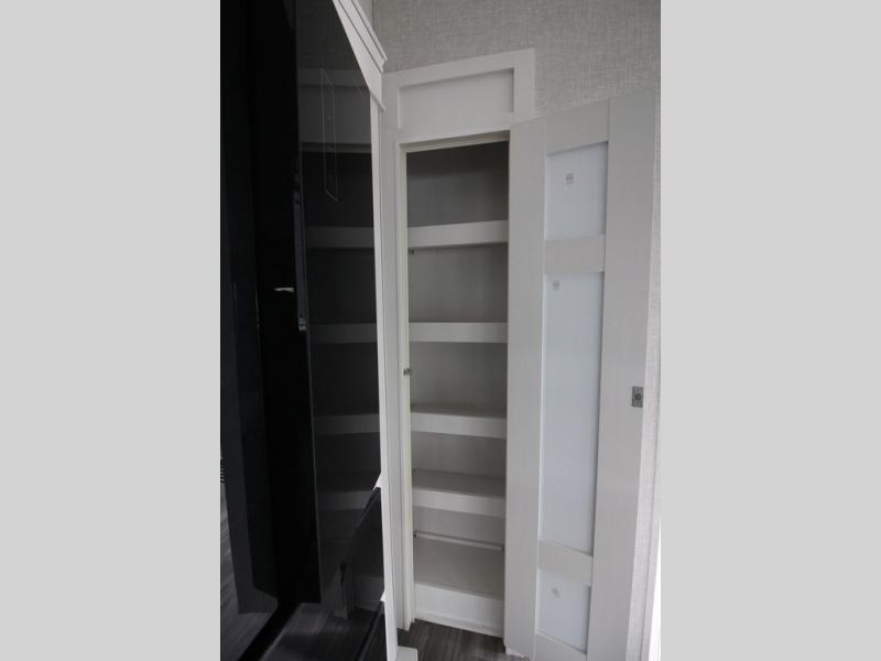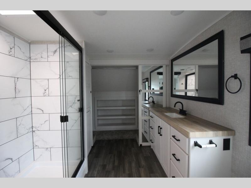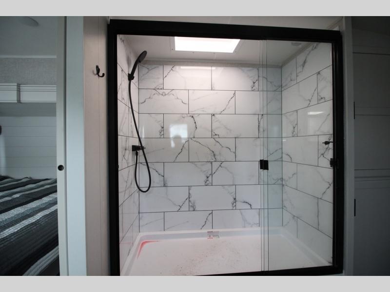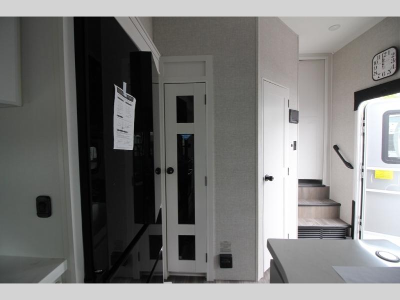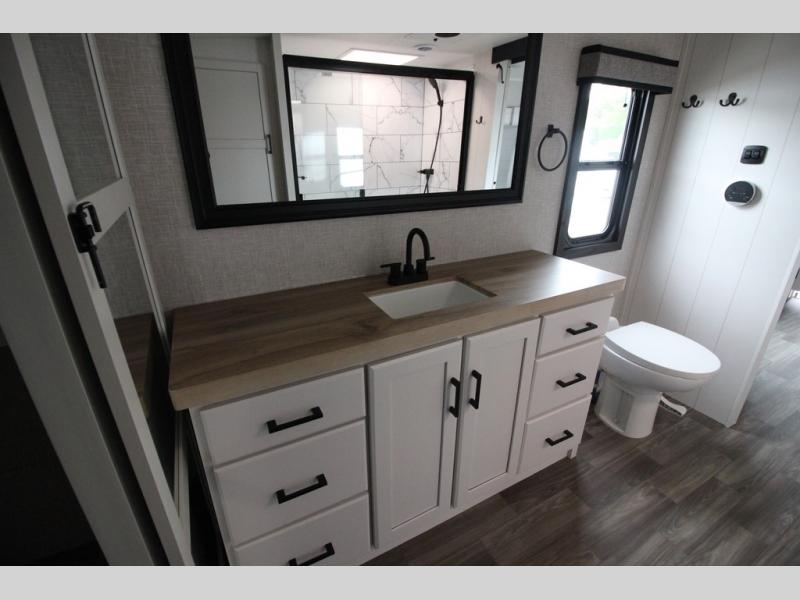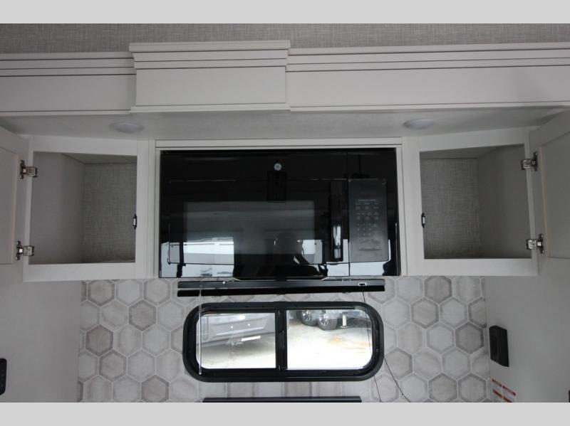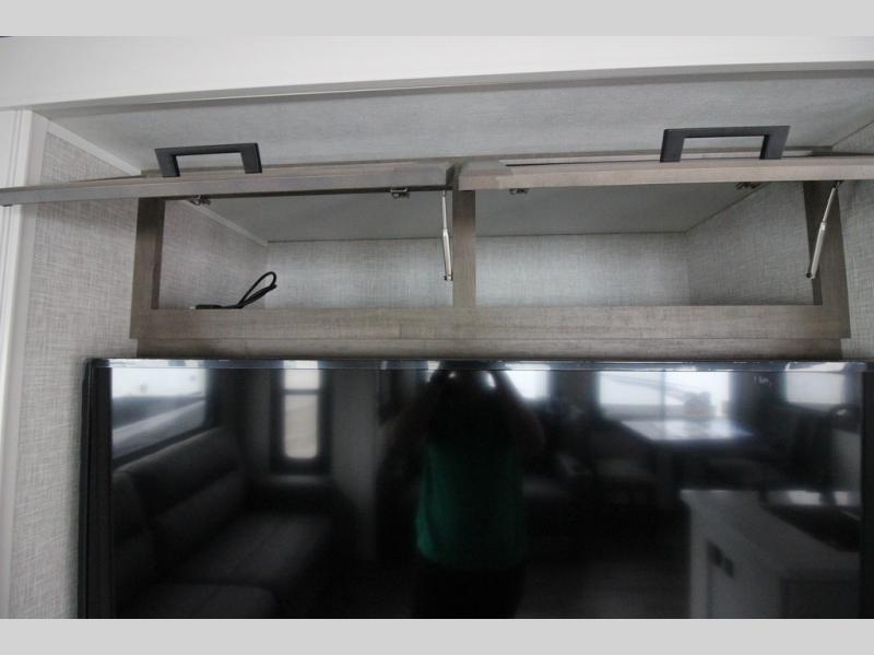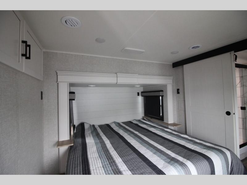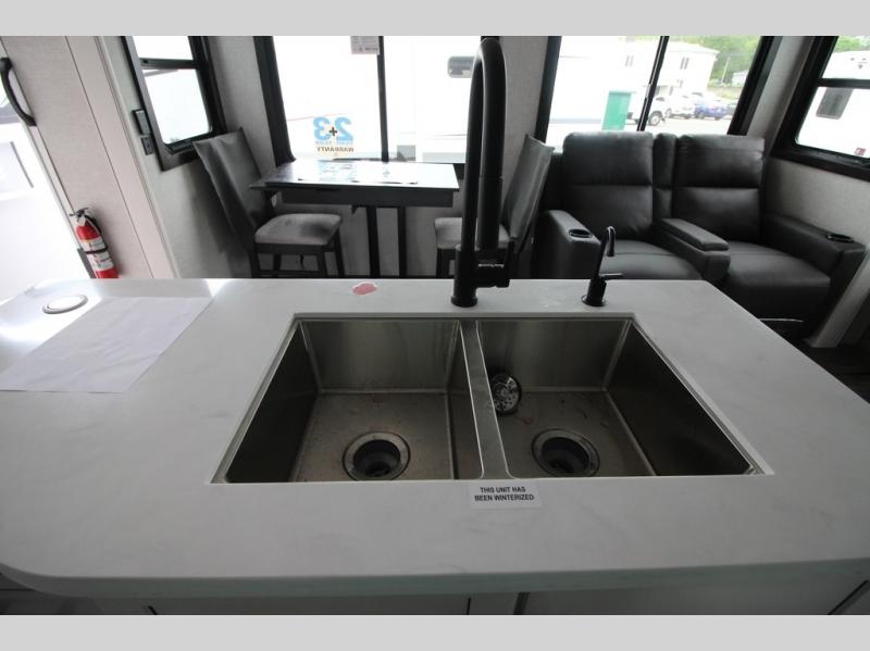 Enjoy a private bedroom suite in this fifth wheel! The king bed is positioned in a slide out for maximum room, and a sliding door leads to the front bath which is full of luxurious features. Enjoy a 30" x 60" shower with a seat. There's a walk-in front closet which has hanging space as well as prep for an optional washer and dryer. An additional wardrobe/linen closet provides some extra space. There's also a half-bath located off the kitchen, and that one has overhead storage also. You'll love the living area with its theater seats, tri-fold sofa, ceiling fan, and entertainment center with fireplace. The kitchen has a four-burner cooktop, center island with sink, 30" microwave oven over the range, and a 16 cu. ft. 12 volt refrigerator - perfect for cooking up great meals!