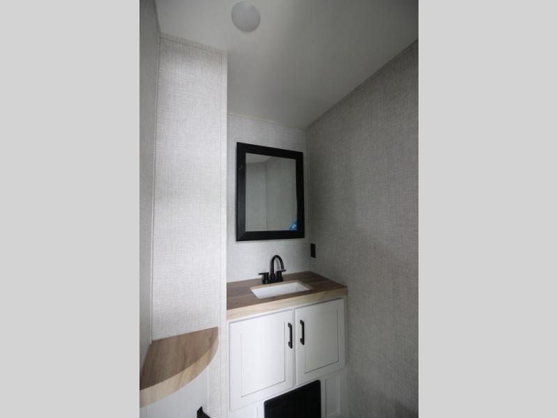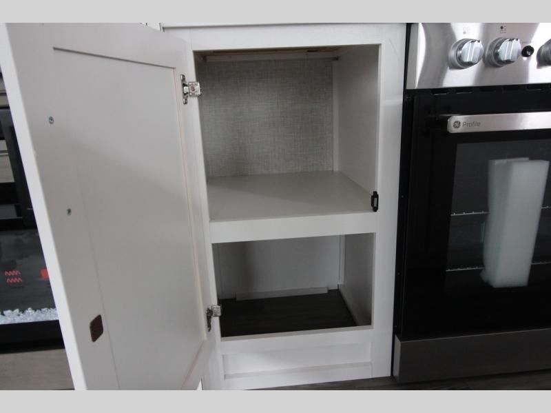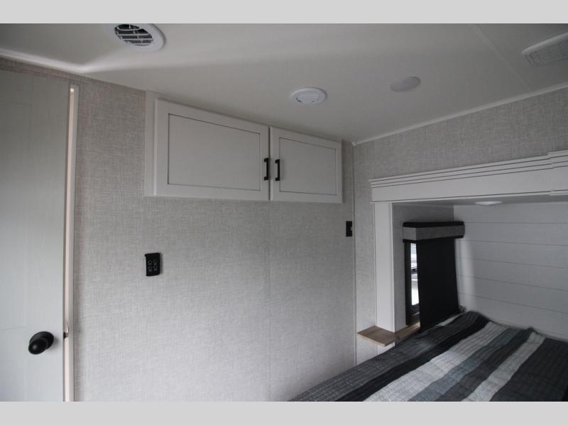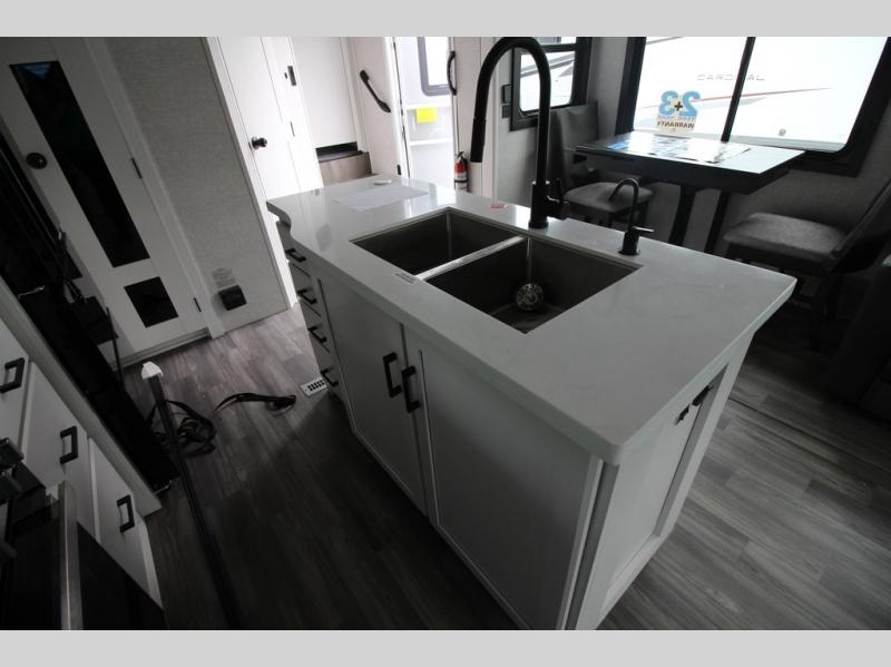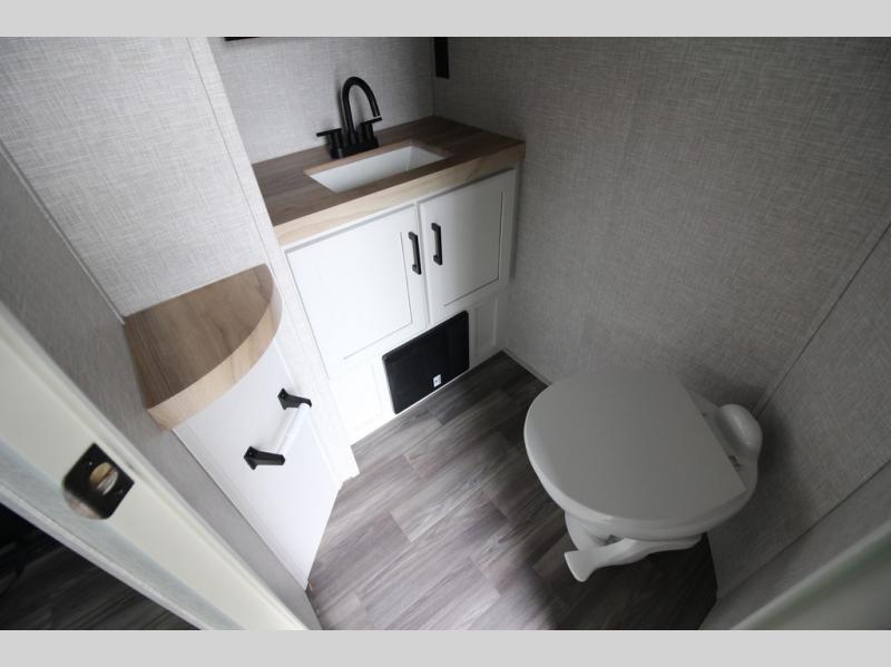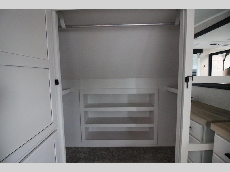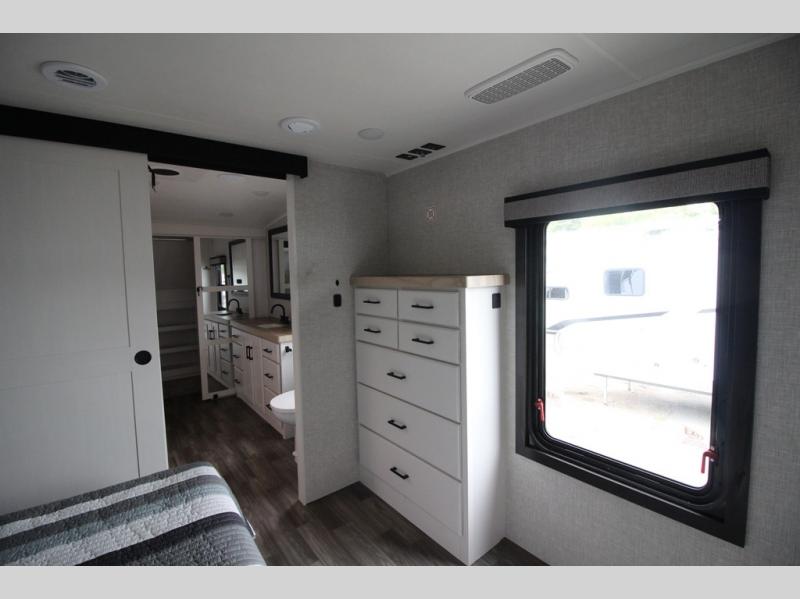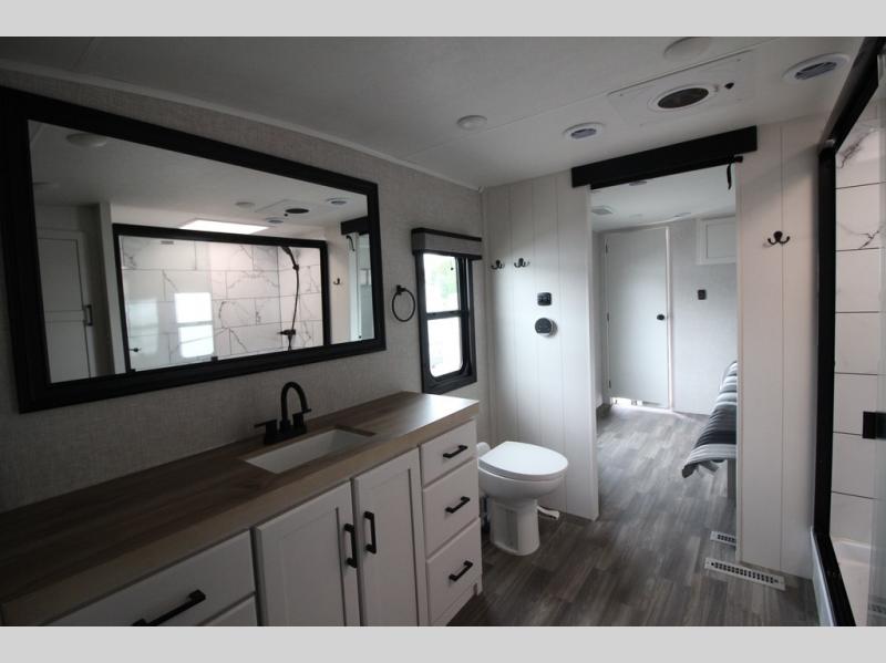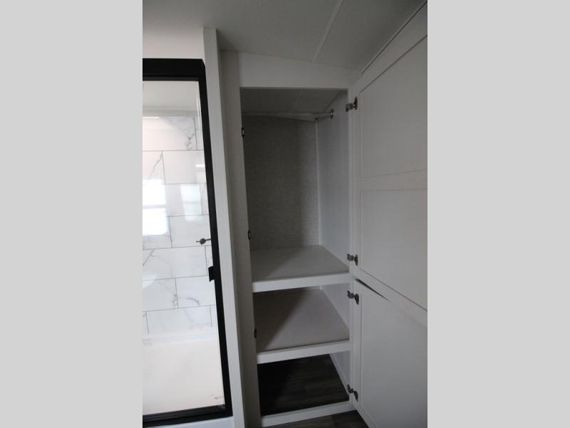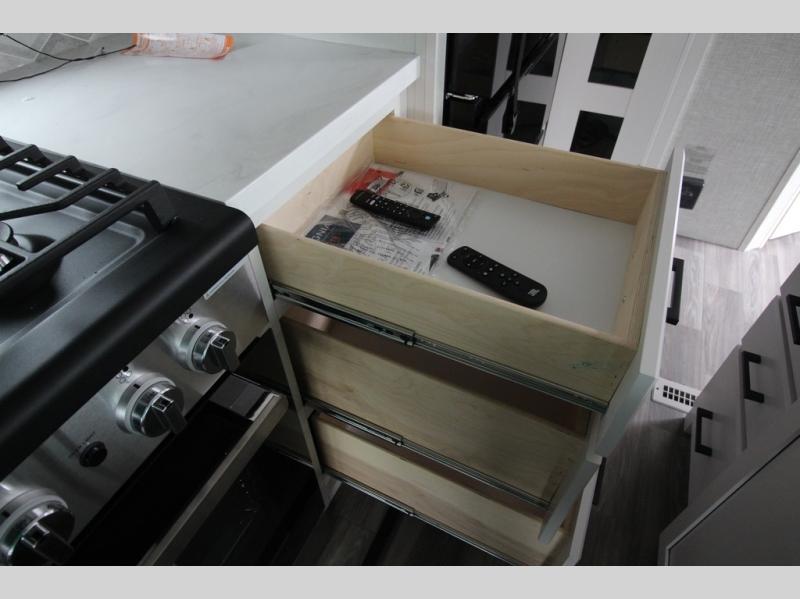 Enjoy a private bedroom suite in this fifth wheel! The king bed is positioned in a slide out for maximum room, and a sliding door leads to the front bath which is full of luxurious features. Enjoy a 30" x 60" shower with a seat. There's a walk-in front closet which has hanging space as well as prep for an optional washer and dryer. An additional wardrobe/linen closet provides some extra space. There's also a half-bath located off the kitchen, and that one has overhead storage also. You'll love the living area with its theater seats, tri-fold sofa, ceiling fan, and entertainment center with fireplace. The kitchen has a four-burner cooktop, center island with sink, 30" microwave oven over the range, and a 16 cu. ft. 12 volt refrigerator - perfect for cooking up great meals!