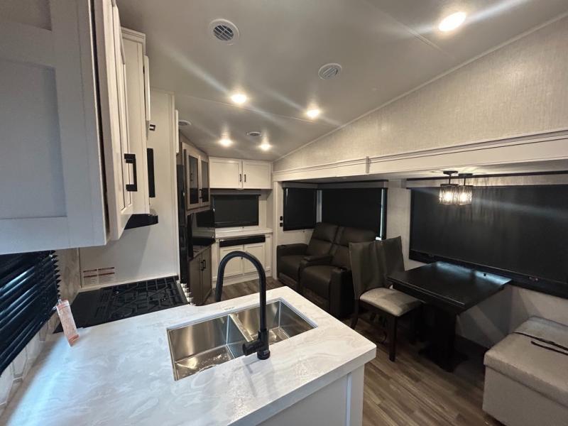 With any Eagle HT fifth wheel by Jayco you will enjoy a smooth drive thanks to the 4 Star Handling Package, Goodyear Endurance tires, and MORryde CRE-3000 rubberized suspension. The Customer Value Package includes amenities that are sure to make camping easier than ever, like the 60K on-demand water heater, Keyed-Alike lock system, electric awning with integrated LED lights, and more. Handcrafted and glazed door/drawer fronts will make your space feel more like home, along with residential vinyl flooring throughout, motion activated LED lights, and blackout roller shades with reflective side throughout to keep the sun out when you want to sleep in. The HELIX Cooling System features Jayco's exclusive insulated dual duct design, directional and closeable A/C vents, and larger return air vents with user friendly filters to keep your crew comfortable all summer long. Choose an entry-level Eagle HT fifth wheel today!