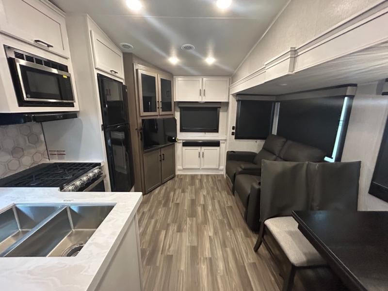 This is the perfect couple's fifth wheel since it features sleeping space for two up front! You can use the dual bedroom wardrobes to store your clothes in, and the full bath is close by so you can get ready each morning. After you've whipped up breakfast in the kitchen, you can dine at the table and chairs with bench seating, then relax with your coffee on the theater seat. There is an entertainment center across from the sofa for convenience, plus a hidden walk-in pantry behind the TV. You might even like to add the fireplace option to make it feel more like home!