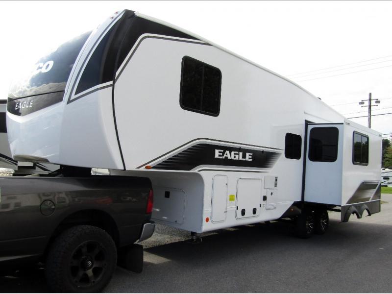 With any Eagle HT fifth wheel by Jayco you will enjoy a smooth drive thanks to the 4 Star Handling Package, Goodyear Endurance tires, and MORryde CRE-3000 rubberized suspension. The Customer Value Package includes amenities that are sure to make camping easier than ever, like the 60K on-demand water heater, Keyed-Alike lock system, electric awning with integrated LED lights, and more. Handcrafted and glazed door/drawer fronts will make your space feel more like home, along with residential vinyl flooring throughout, motion activated LED lights, and blackout roller shades with reflective side throughout to keep the sun out when you want to sleep in. The HELIX Cooling System features Jayco's exclusive insulated dual duct design, directional and closeable A/C vents, and larger return air vents with user friendly filters to keep your crew comfortable all summer long. Choose an entry-level Eagle HT fifth wheel today!