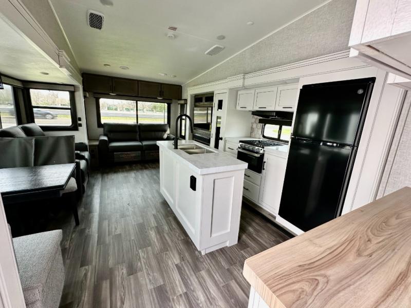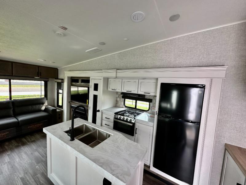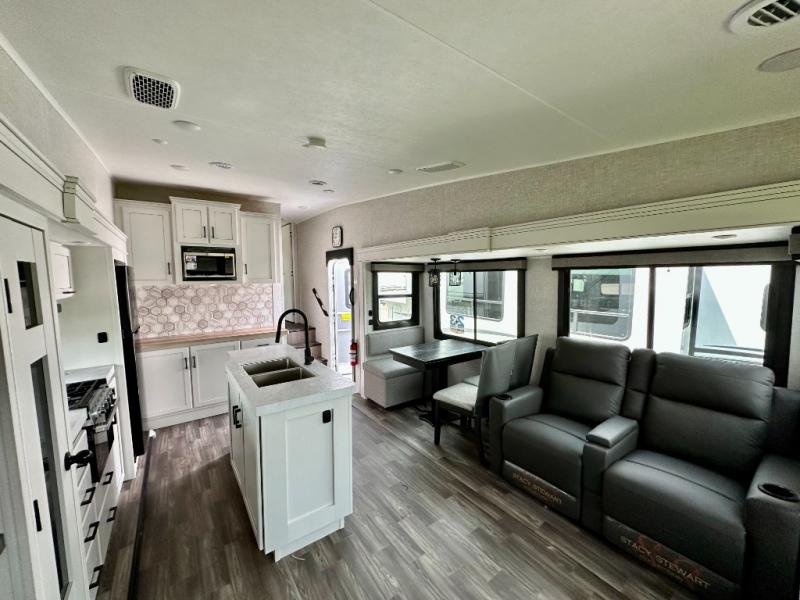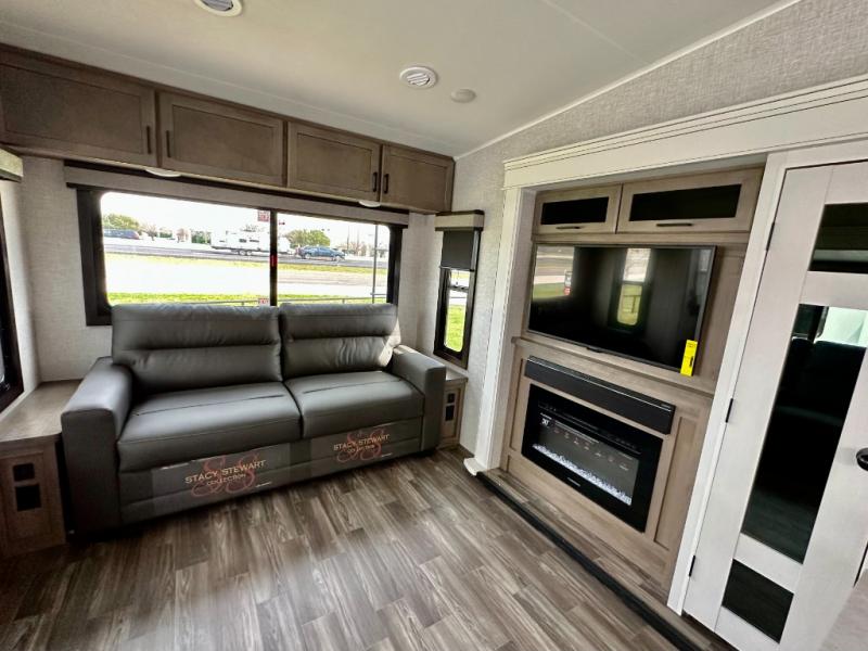 You will love how much interior space you have in this fifth wheel thanks to the dual opposing slides in the kitchen/living area! While your crew is relaxing on the theater seat or tri-fold sofa, you can prepare dinner on the 17" range with edge to edge grates. There is also an entertainment center and fireplace across from the theater seat for easy viewing, and the table and chairs with a bench will be the perfect place to play a board game at. Head to the front to enjoy the private bedroom with a queen bed, and the full bath is close by for easy nighttime use!