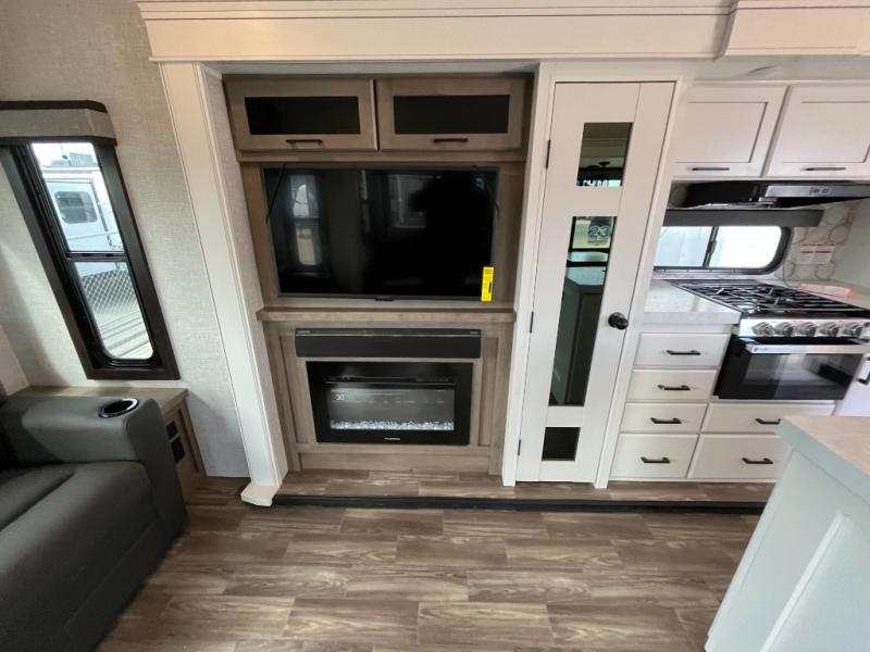 You will love how much interior space you have in this fifth wheel thanks to the dual opposing slides in the kitchen/living area! While your crew is relaxing on the theater seat or tri-fold sofa, you can prepare dinner on the 17" range with edge to edge grates. There is also an entertainment center and fireplace across from the theater seat for easy viewing, and the table and chairs with a bench will be the perfect place to play a board game at. Head to the front to enjoy the private bedroom with a queen bed, and the full bath is close by for easy nighttime use!