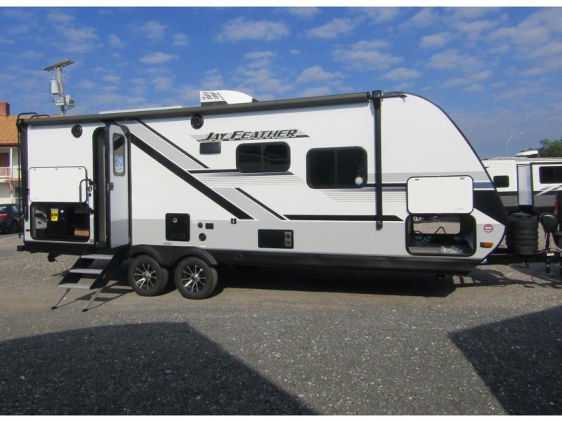 With any Jay Feather travel trailer by Jayco, you will experience an easy-to-tow, lightweight dual axle RV that is built on an American-made frame with an aerodynamic, rounded front profile with a diamond plate to protect against road debris, and includes Azdel composite in the perimeter walls, and Stronghold VBL vacuum-bonded, laminated floor and walls, plus the Magnum Truss roof system. Also included are features in the Customer Value package, and the Sport package which offers aluminum tread entry steps, roof-mount solar prep, an LED TV, and the Glacier package which includes an enclosed underbelly. The interior provides residential-style kitchen countertops with a decorative backsplash, residential plank-style vinyl flooring for easy care, a decorative wallboard for style, and ball-bearing drawer guides with 75 lb. capacity to mention a few of the amenities. Choose your favorite today!